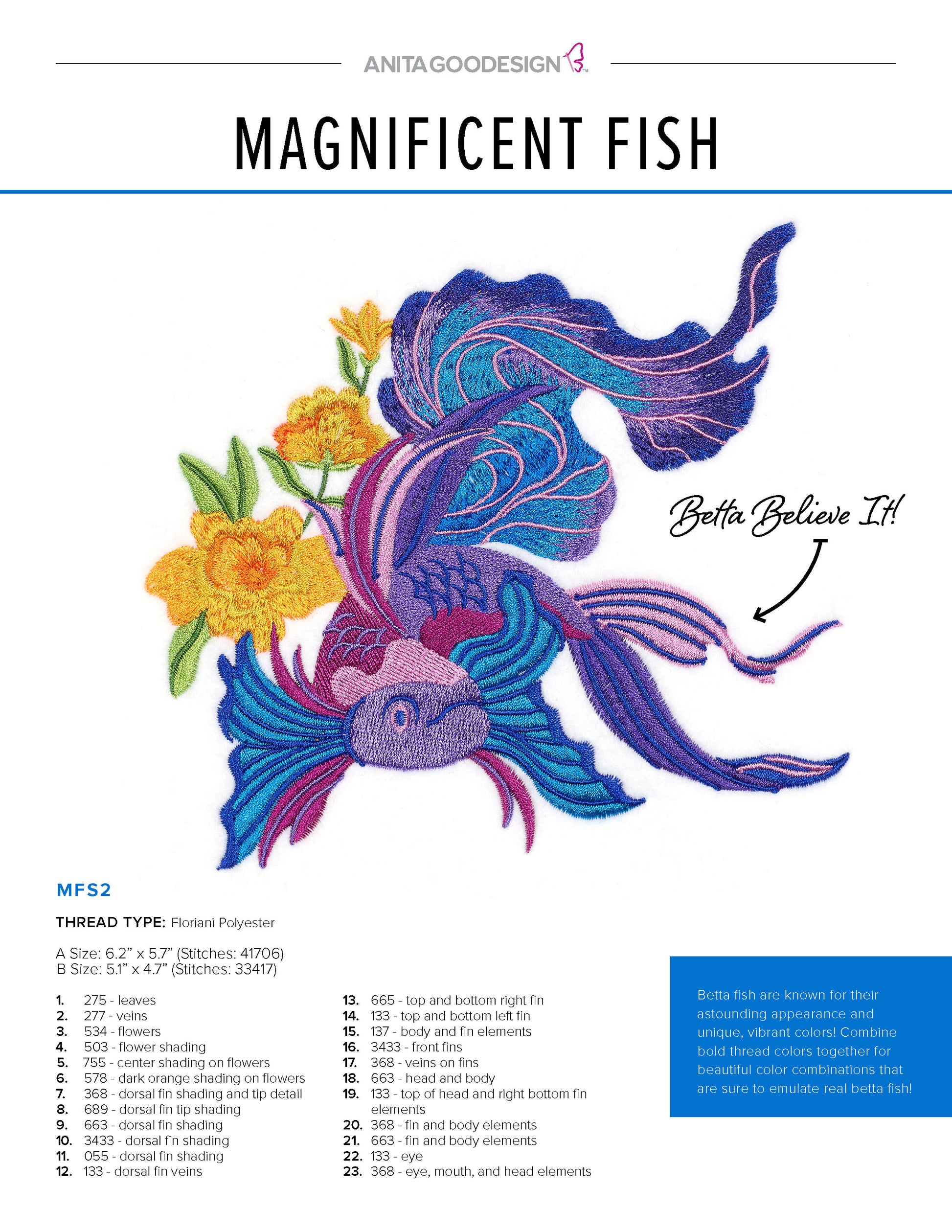Betta fish are known for their astounding appearance and unique, vibrant colors! Combine bold thread colors together for beautiful color combinations that are sure to emulate real betta fish!