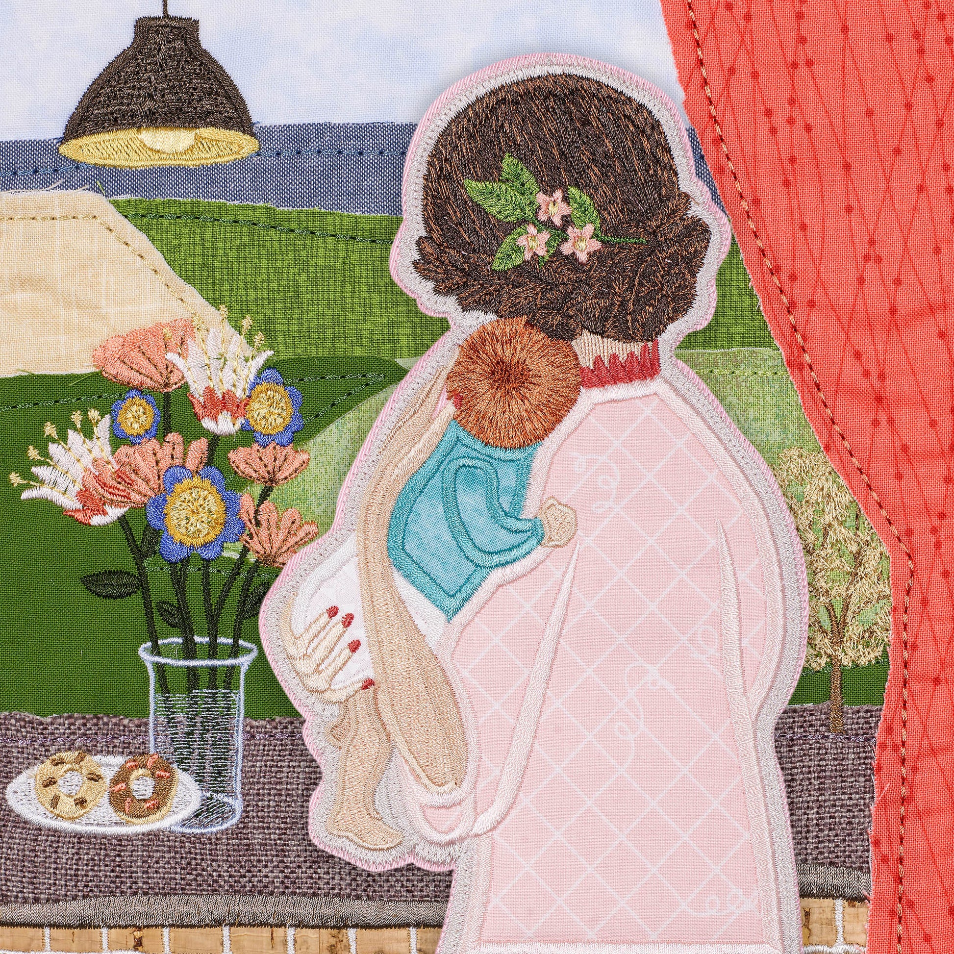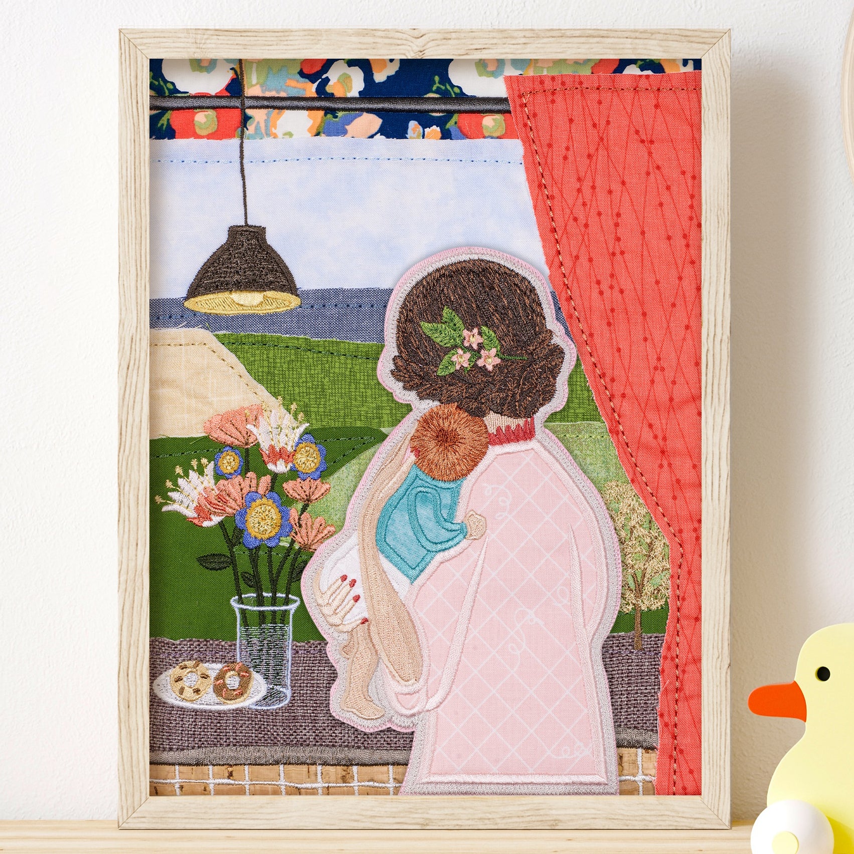 Few things in life are more precious than the moments of bonding between a mother and child. This intimate quilt scene uses raw edge appliqué to create a beautiful fabric landscape, while mother and baby are stitched separately like a patch. The finished project is a dimensional design that looks stunning popped into a frame!