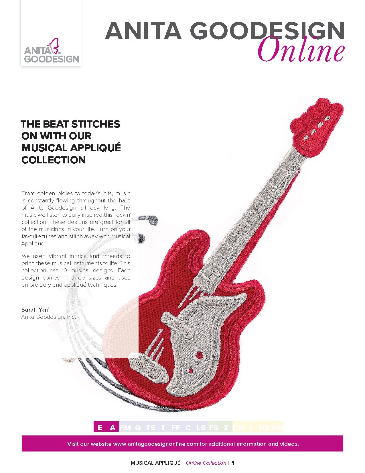 From golden oldies to today’s hits, music is constantly flowing throughout the halls of Anita Goodesign all day long. The music we listen to daily inspired this rockin’ collection. These designs are great for all of the musicians in your life. Turn on your favorite tunes and stitch away with Musical Appliqué!