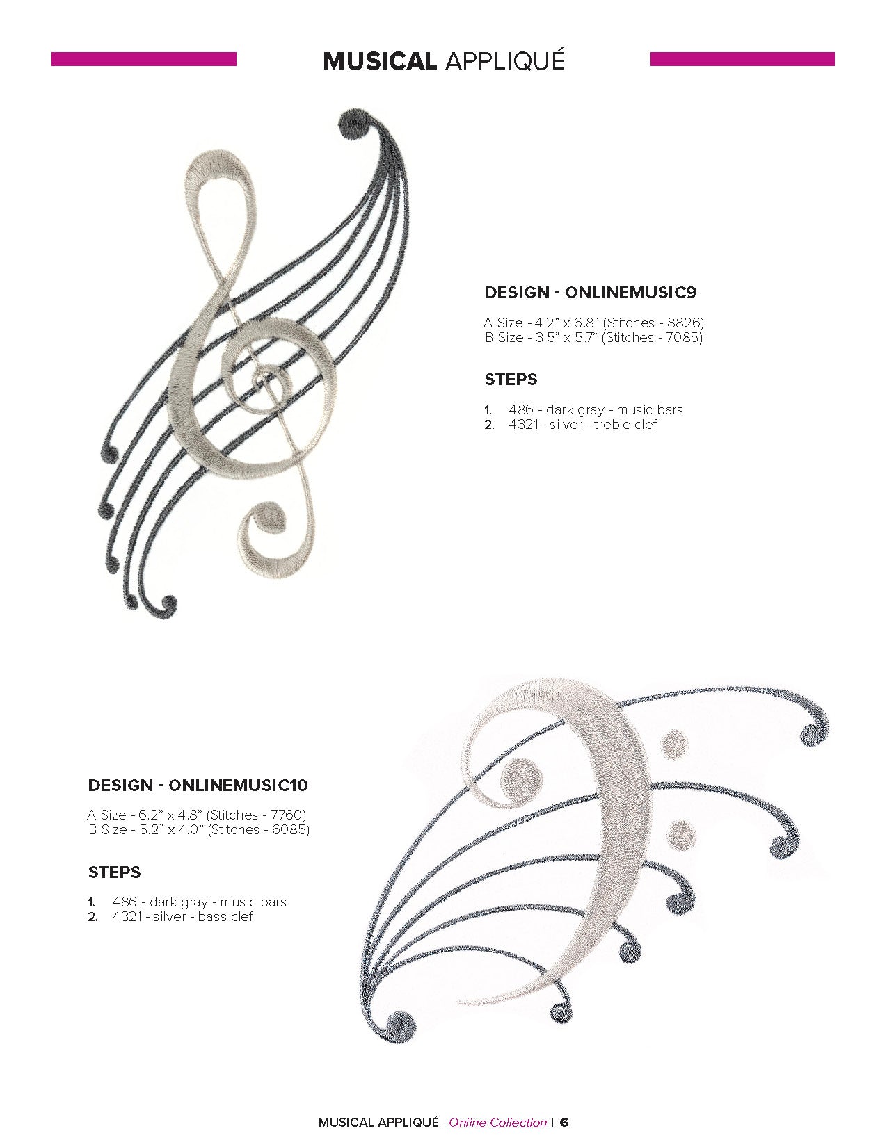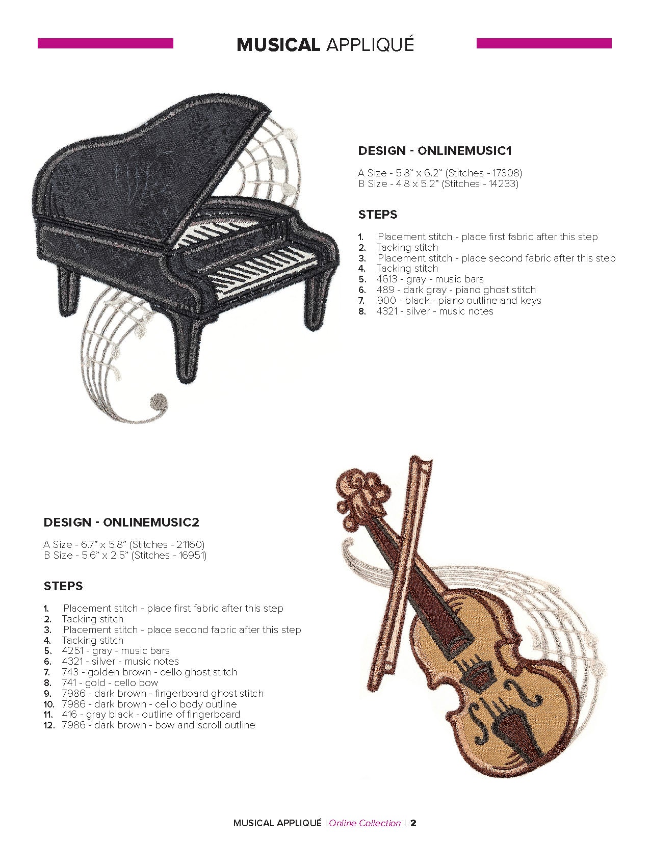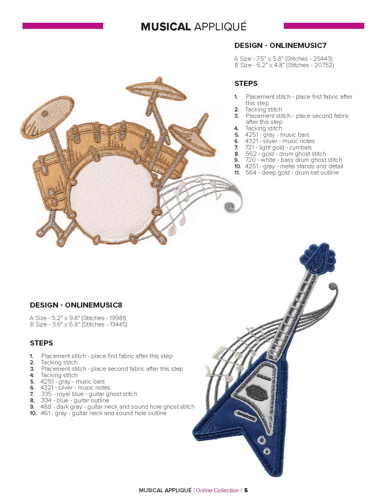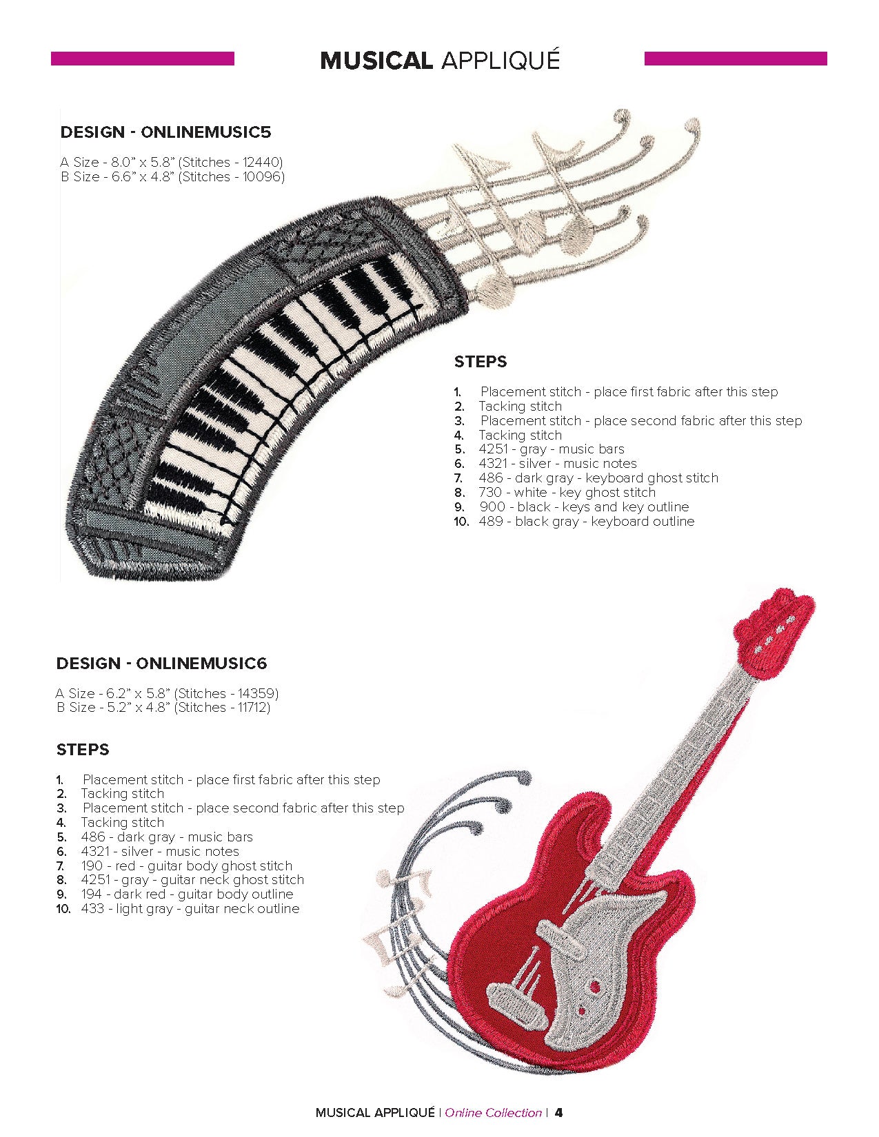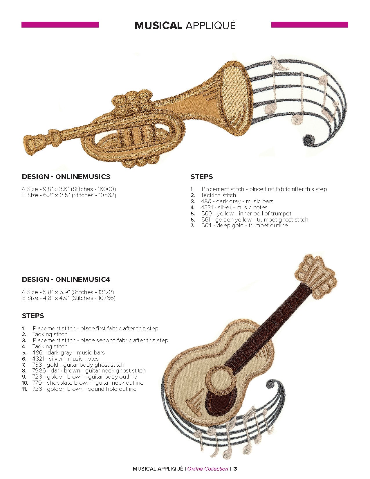 We used vibrant fabrics and threads to bring these musical instruments to life. This collection has 10 musical designs. Each design comes in three sizes and uses embroidery and appliqué techniques. Some featured instruments in this set include grand piano, electric keyboard, violin, trumpet, guitar, drum set, electric guitars, and music notes.