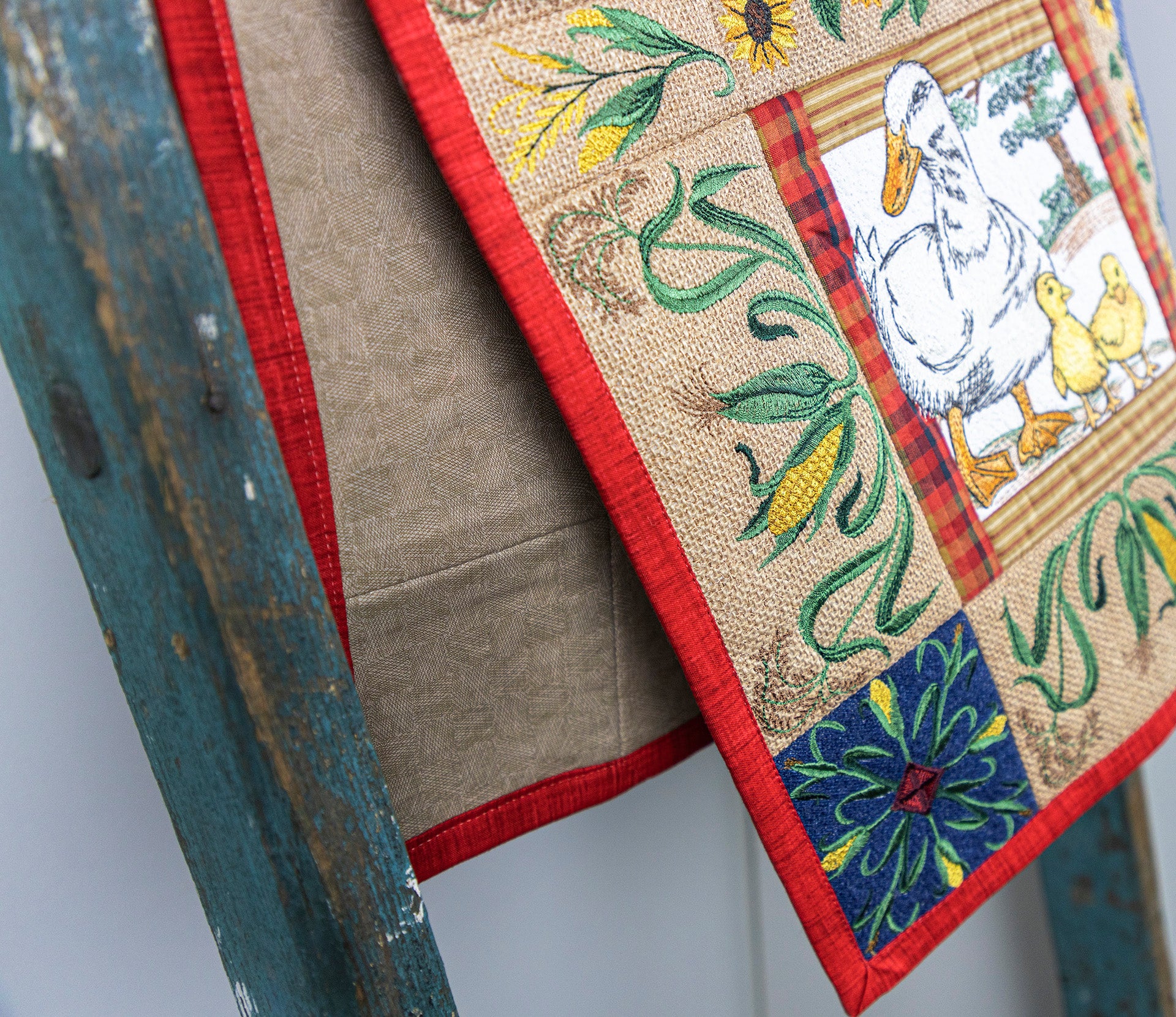 Each main quilt block has a farm animal or scene, and also features an intentional 3D effect with appliqué and embroidery that overlaps the folded fabric border.