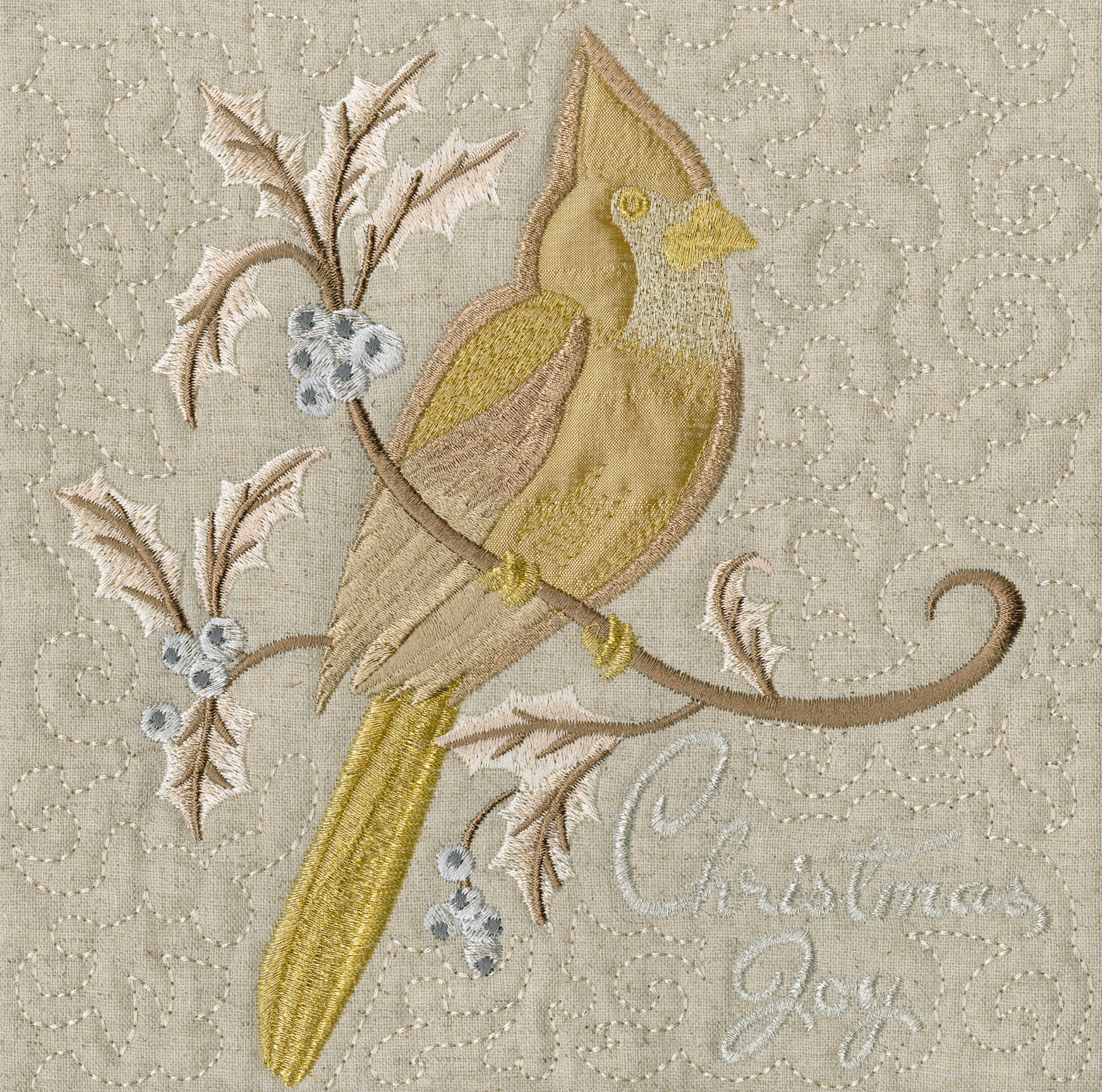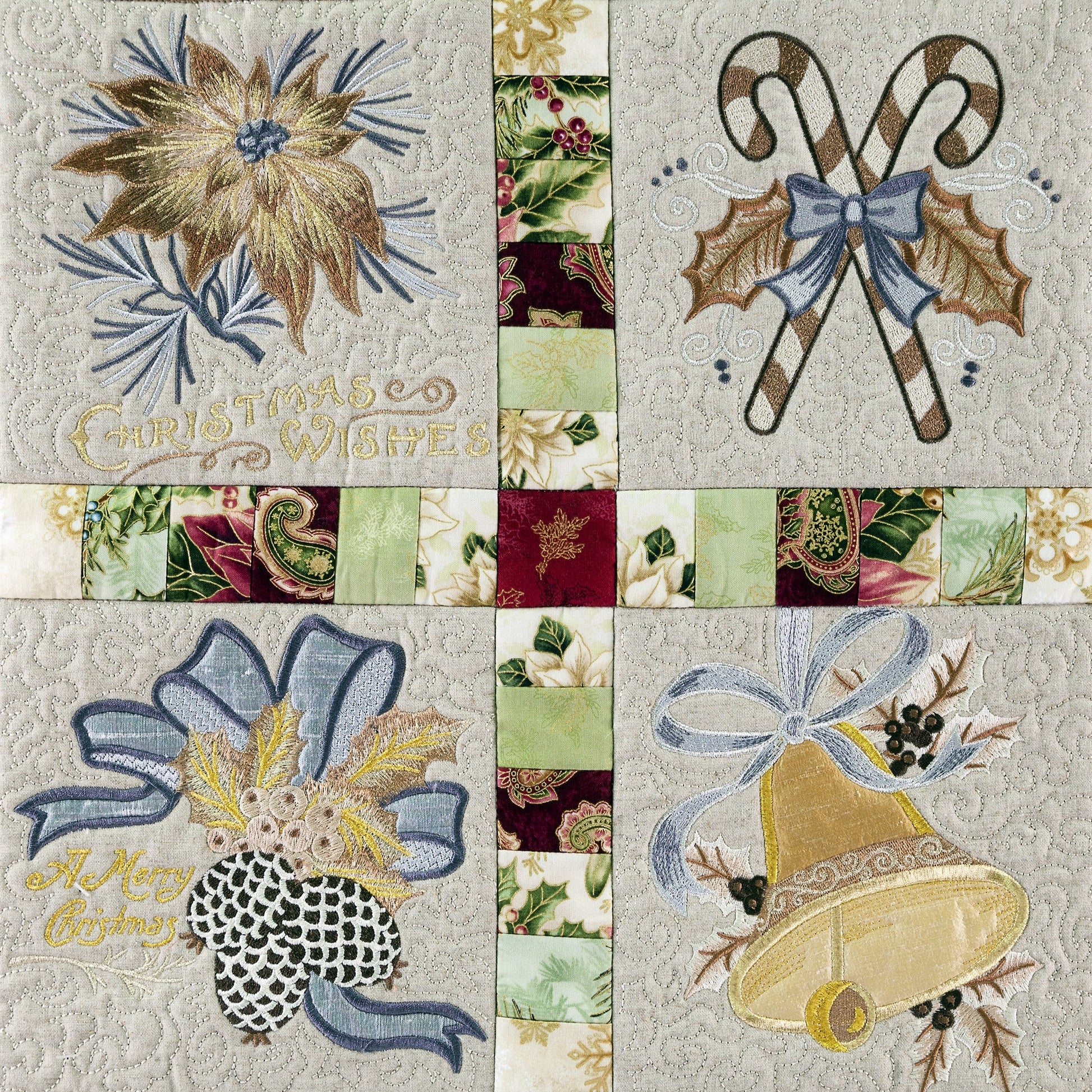 To achieve a harmonious and refined look, we stitched each design on a neutral base using tonal appliques and threads in shades of silver, tan, and gold. These sophisticated colors lend an air of elegance to the quilt, creating a stunning visual effect. The subtle play of light and shadow in the tonal appliques adds depth and texture, elevating the overall design to a new level of beauty.
