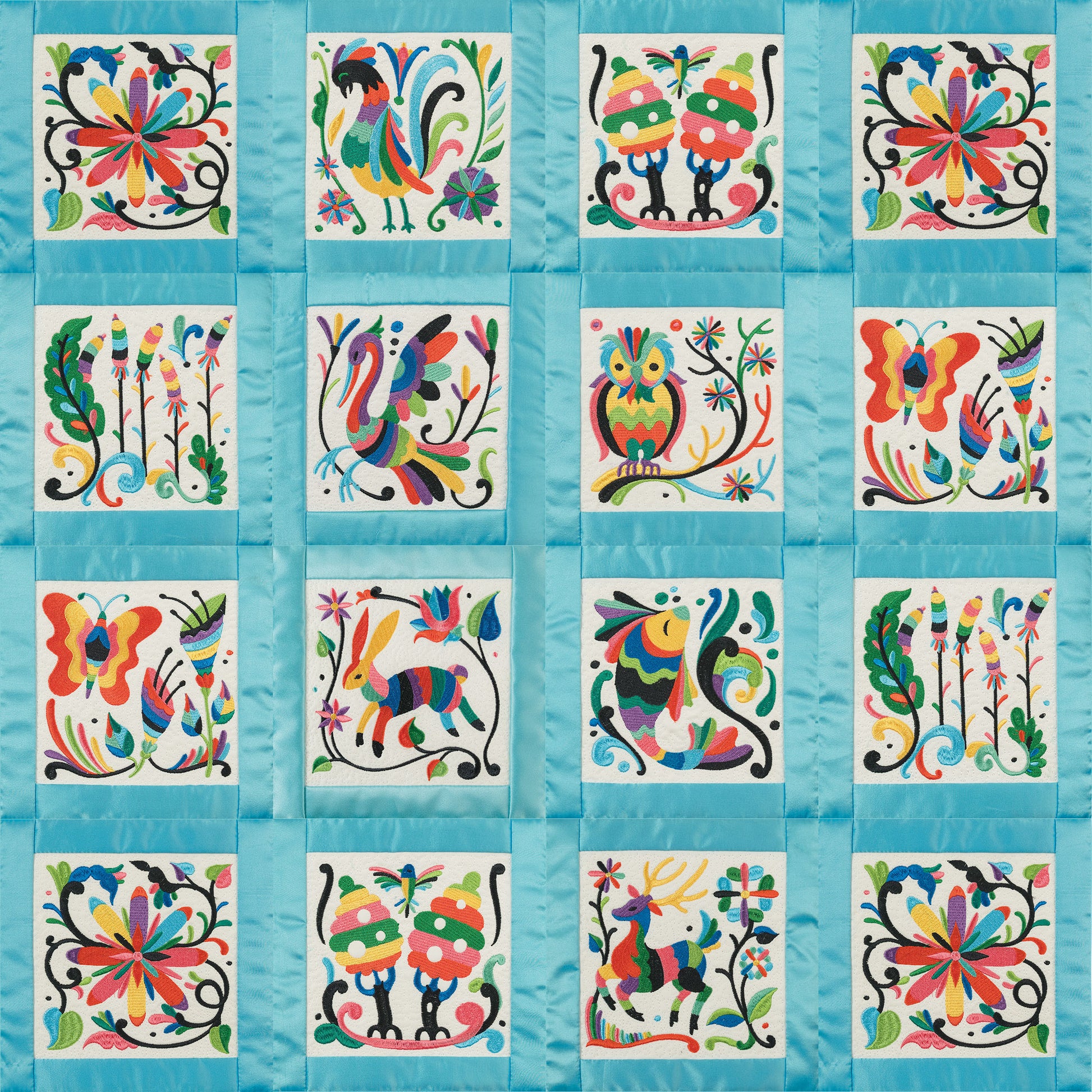 As you stitch each block of the Otomi Quilt, you will notice the wide fill and satin stitches that closely mimic the ornate and dense hand-stitched designs that are a hallmark of Otomi art. The careful selection of thread colors and the meticulous stitching techniques employed in these designs ensure that the essence and authenticity of the Otomi style are preserved in every stitch.