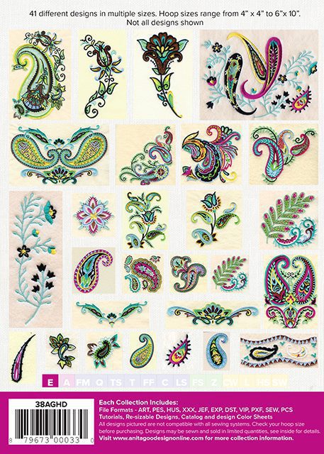 These bold Paisley designs are sure to brighten up your home. No matter what colors you choose to embroider with they are sure to look great. This collection comes with a special project tutorial for a Paisley floor pillow; including fabric scans so you can see what fabrics we picked.