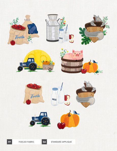 Everyone can appreciate a fun day at the farm. Picking fresh produce and hay rides are a staple of fall family fun. Now, you can bring the farm to your home with this Paper Piecing Farm collection! This collection features 5 designs plus 5 isolated designs so you have more options. Folded fabric layers create a charming appeal without taking any attention away from the design.