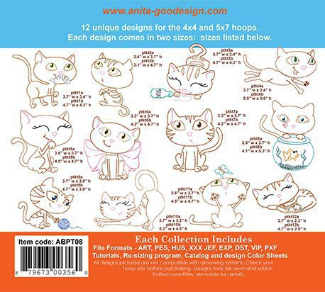 Indulge in the enchanting world of feline embroidery with our Petite Cats collection. This delightful assortment features 12 charming cat designs specially crafted for both the 4x4 and 5x7 hoops, ensuring compatibility with a range of embroidery machines. Each design is thoughtfully created in two sizes, allowing you to choose the perfect dimensions for your project.