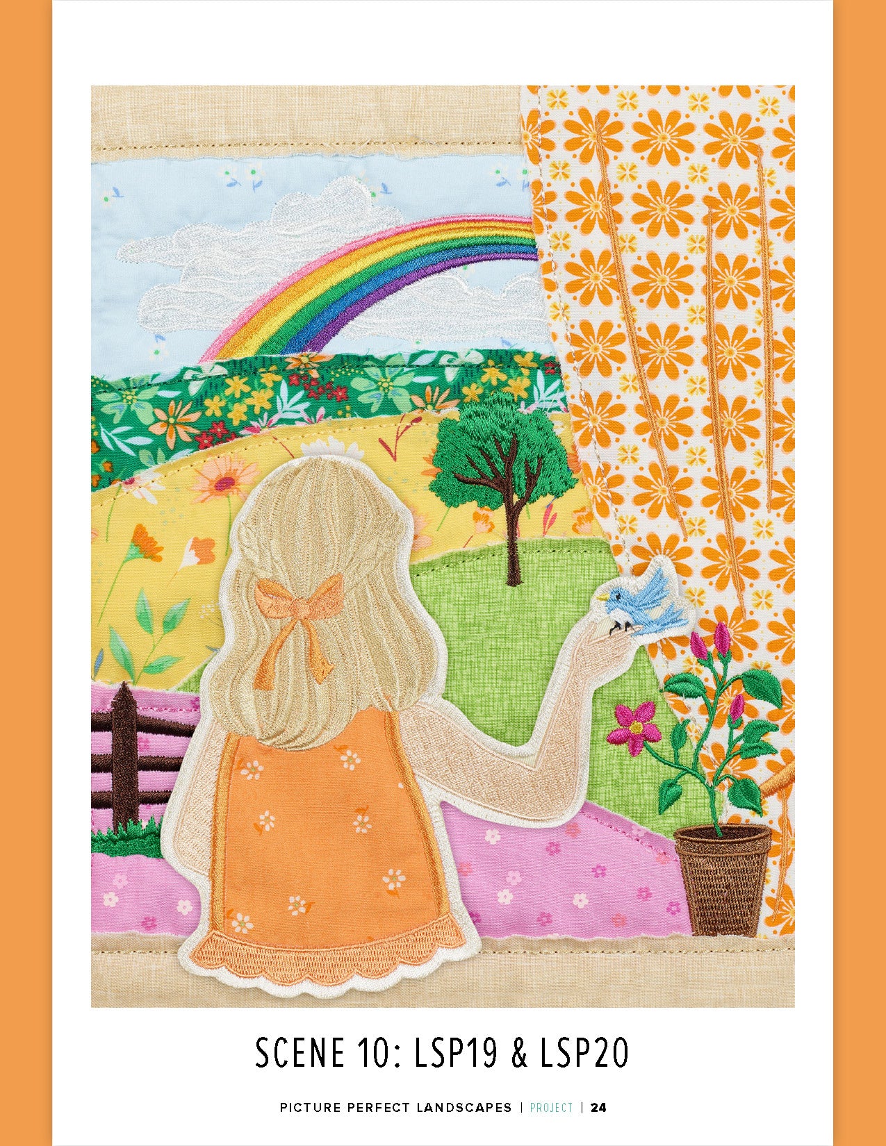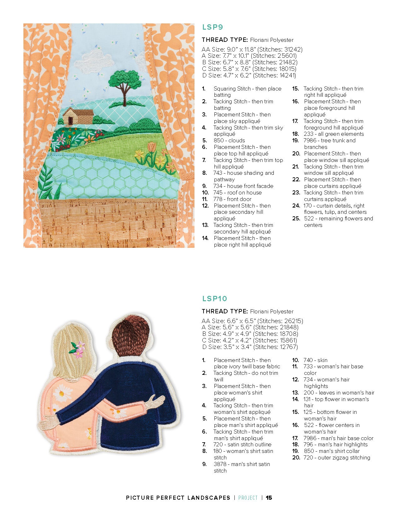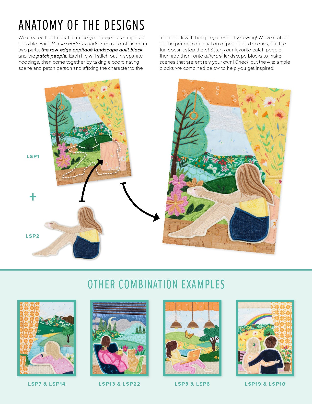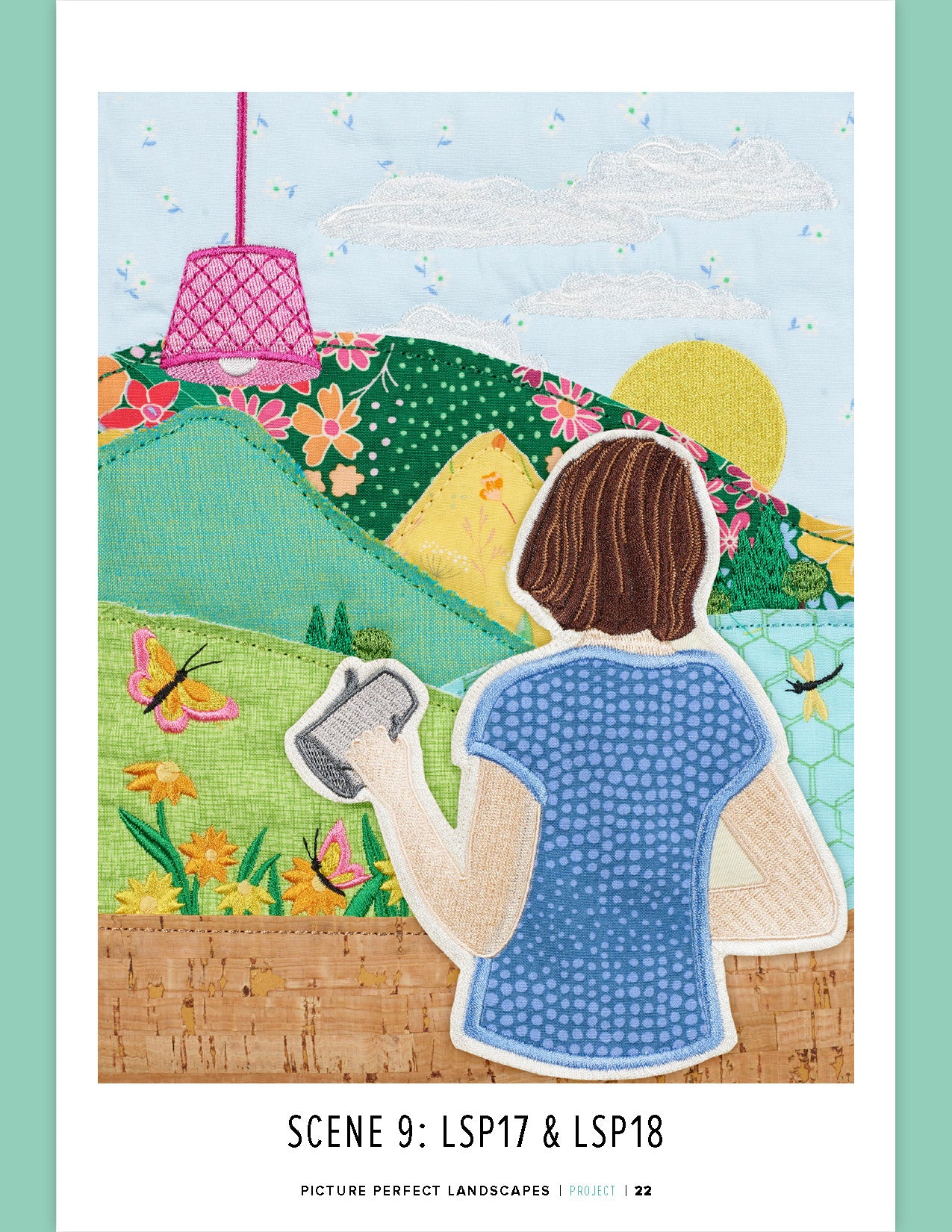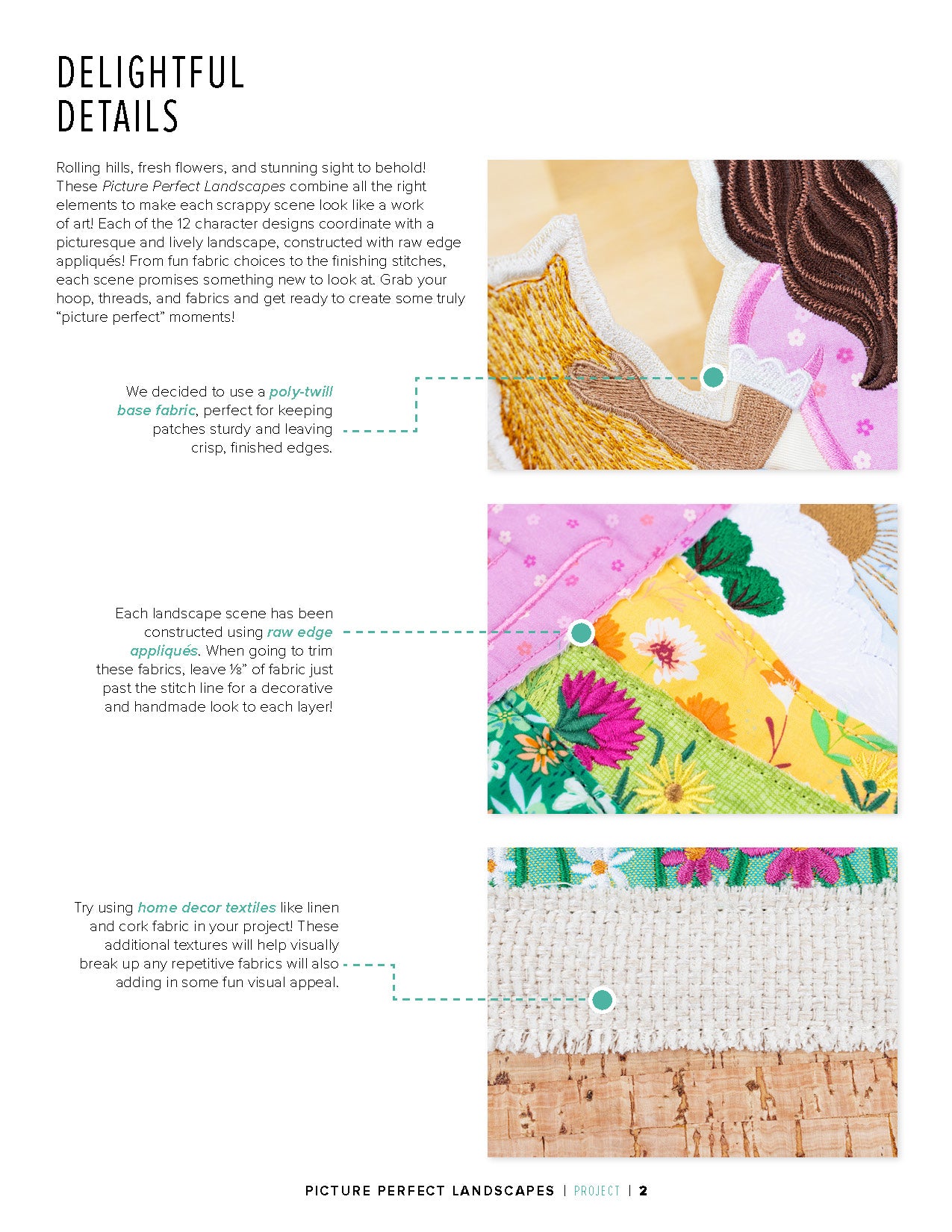 Rolling hills, fresh flowers, and stunning sight to behold! These Picture Perfect Landscapes combine all the right elements to make each scrappy scene look like a work of art! Each of the 12 character designs coordinate with a picturesque and lively landscape, constructed with raw edge appliqués! From fun fabric choices to the finishing stitches, each scene promises something new to look at. Grab your hoop, threads, and fabrics and get ready to create some truly “picture perfect” moments!