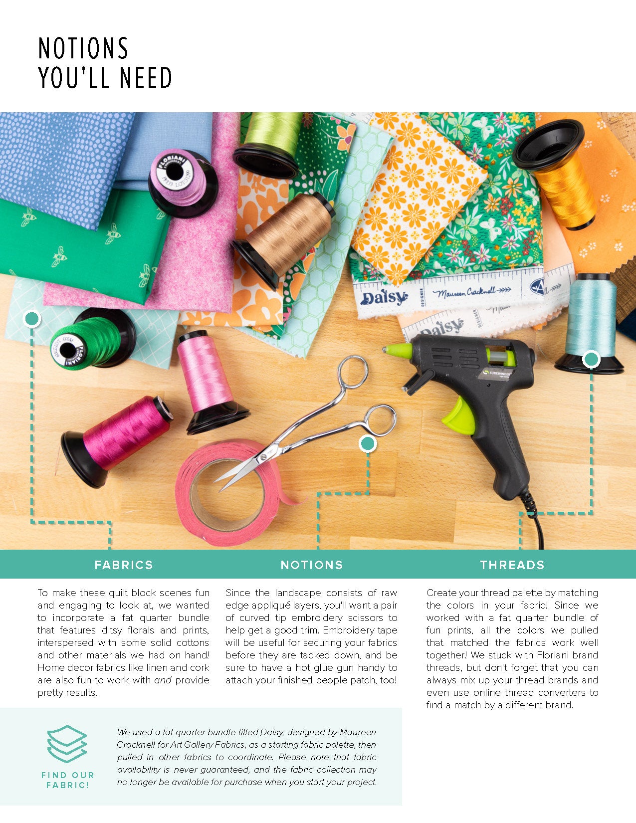 This fun project collection comes with 12 unique scenes that combine our landscape technique with raw edge appliqués. The end results are stunning, scrappy fabric environments—each featuring characters perched upon a window to soak in the views!
