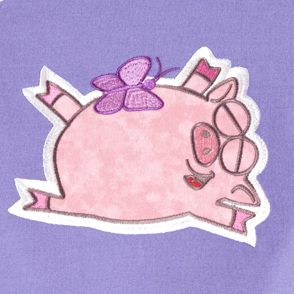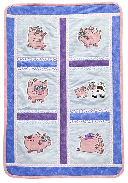 You are going to love our Piglets collection! There are 12 adorable pigs in this collection and they come in two sizes each, one size for the 5”x7” hoop and one for the 6”x10”. The Piglets were drawn by our artist Rachel Woodhouse and her inspiration was her very own teacup pig Cupcake. These designs are fun for all ages, they look great on clothing or decor projects like quilts. For our project we created a simple six block quilt.