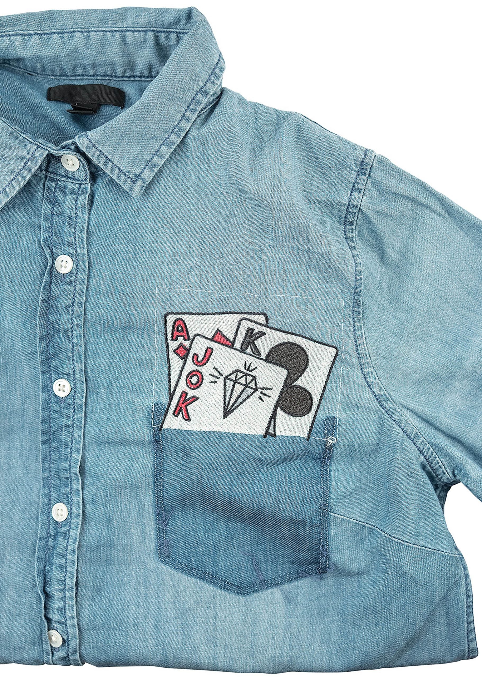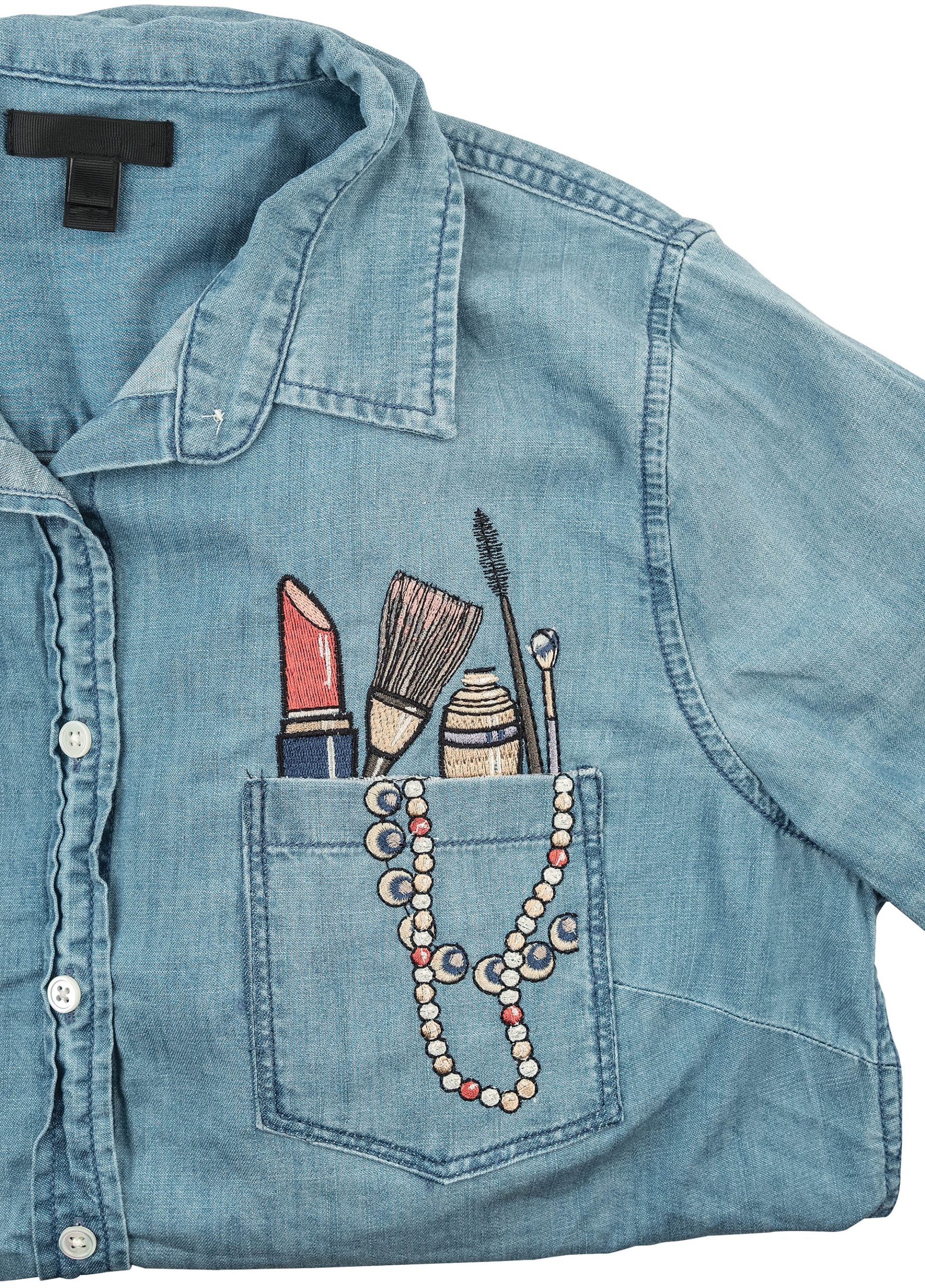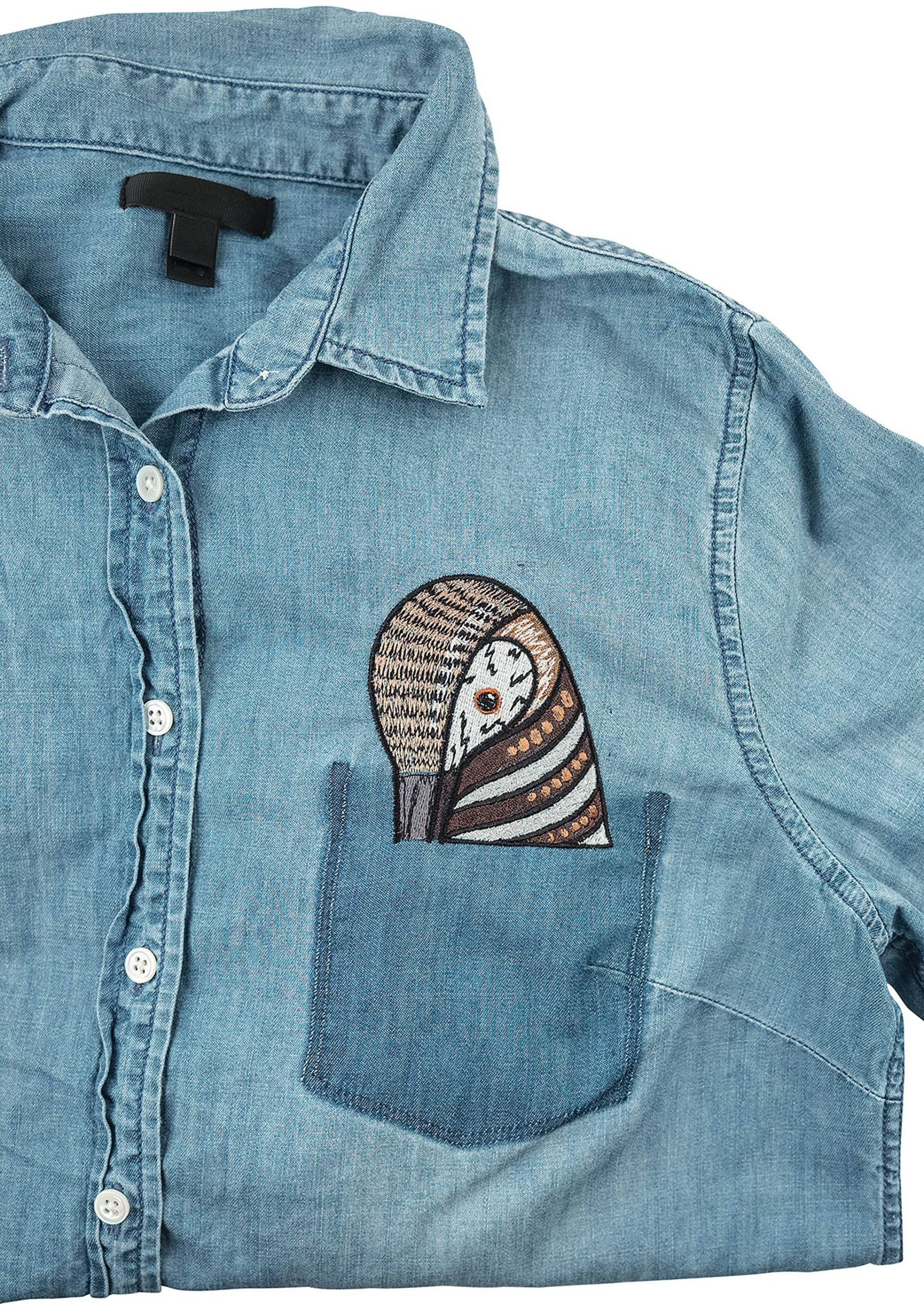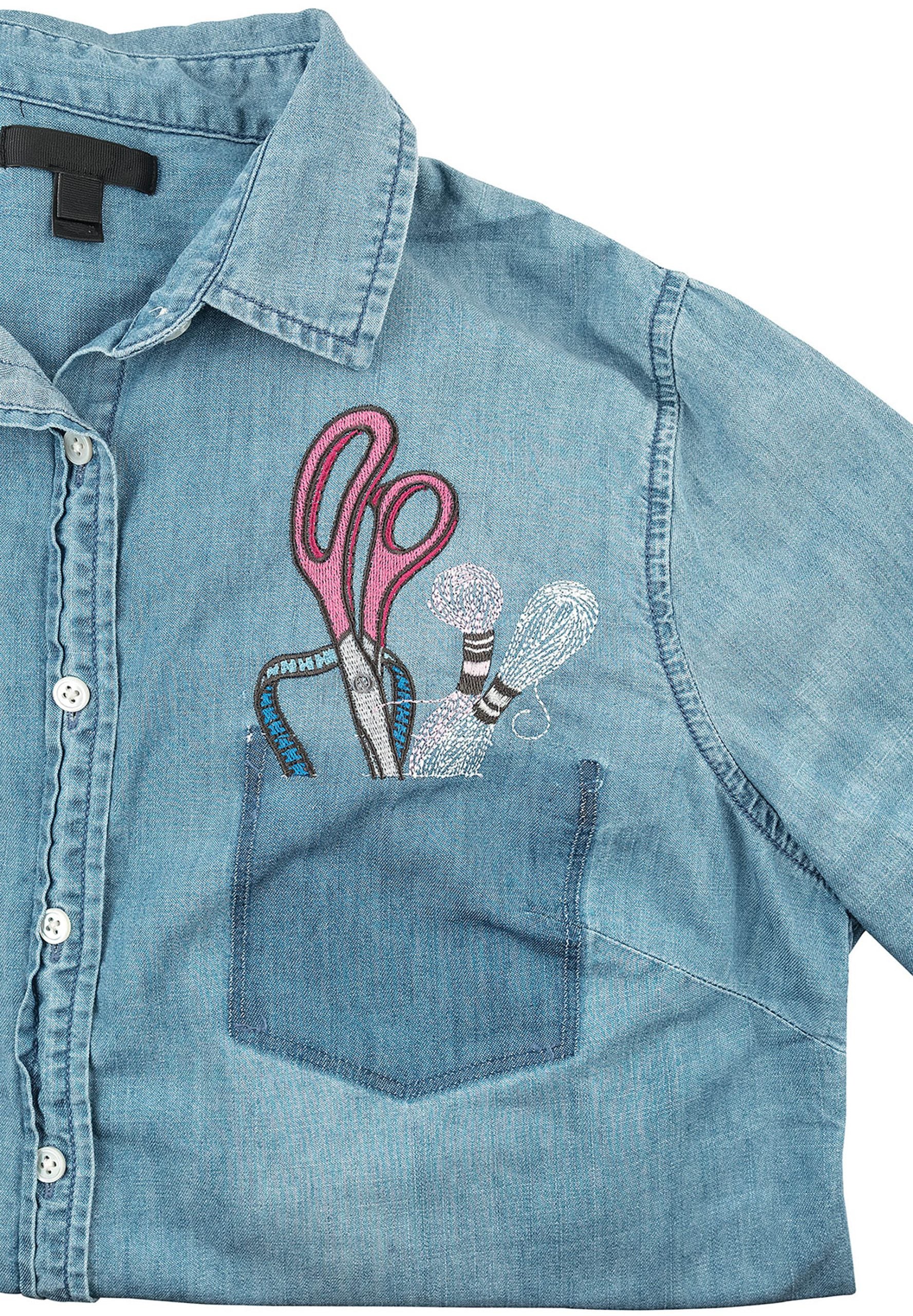 The concept is simple! First, you need to remove the pocket from the shirt and then stitch out the corresponding designs onto the actual shirt and one onto the pocket. Then, just stitch your pocket back onto your shirt. The finished look will be unlike any shirt you could buy in a store! As an added bonus, we have provided you with a pocket template that can be used to create your own custom shirt pocket with any of your favorite fabrics!