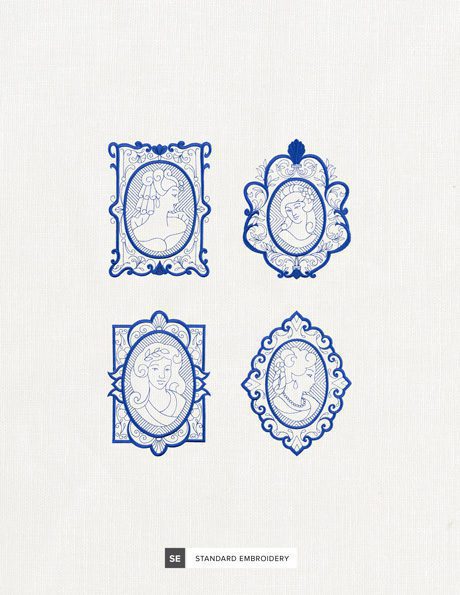 Cameos originated as a form of art where objects such as gems and hard stones were engraved, creating a raised image with a contrasting background color. These pieces were then turned into jewelry or used to embellish clothing. We wanted to bring this style into embroidery by creating the classic look of cameos while giving it a Victorian-frame flare. Pretty Portraits comes with 10 different designs in 3 sizes to choose from. Stitch them on anything from towels to travel pouches, or even artwork you can frame!