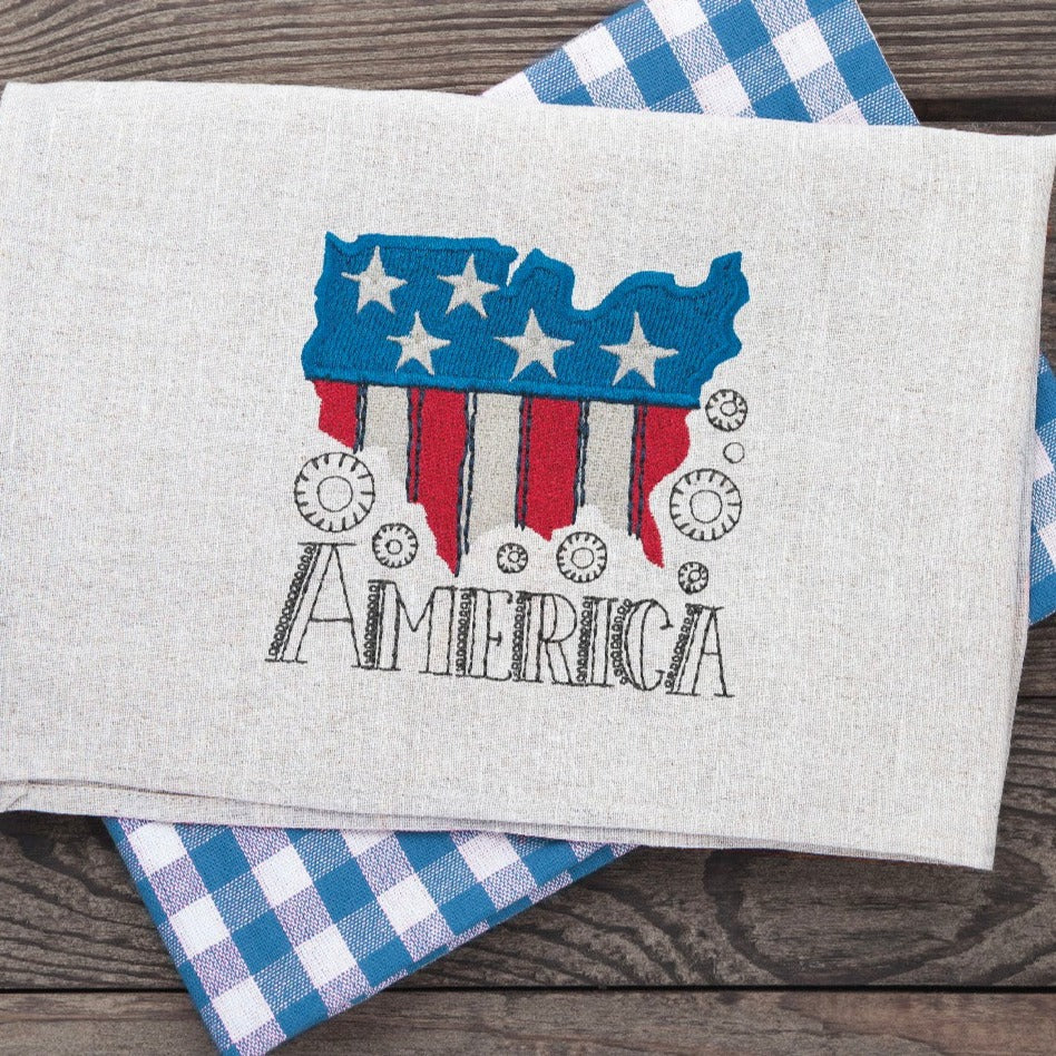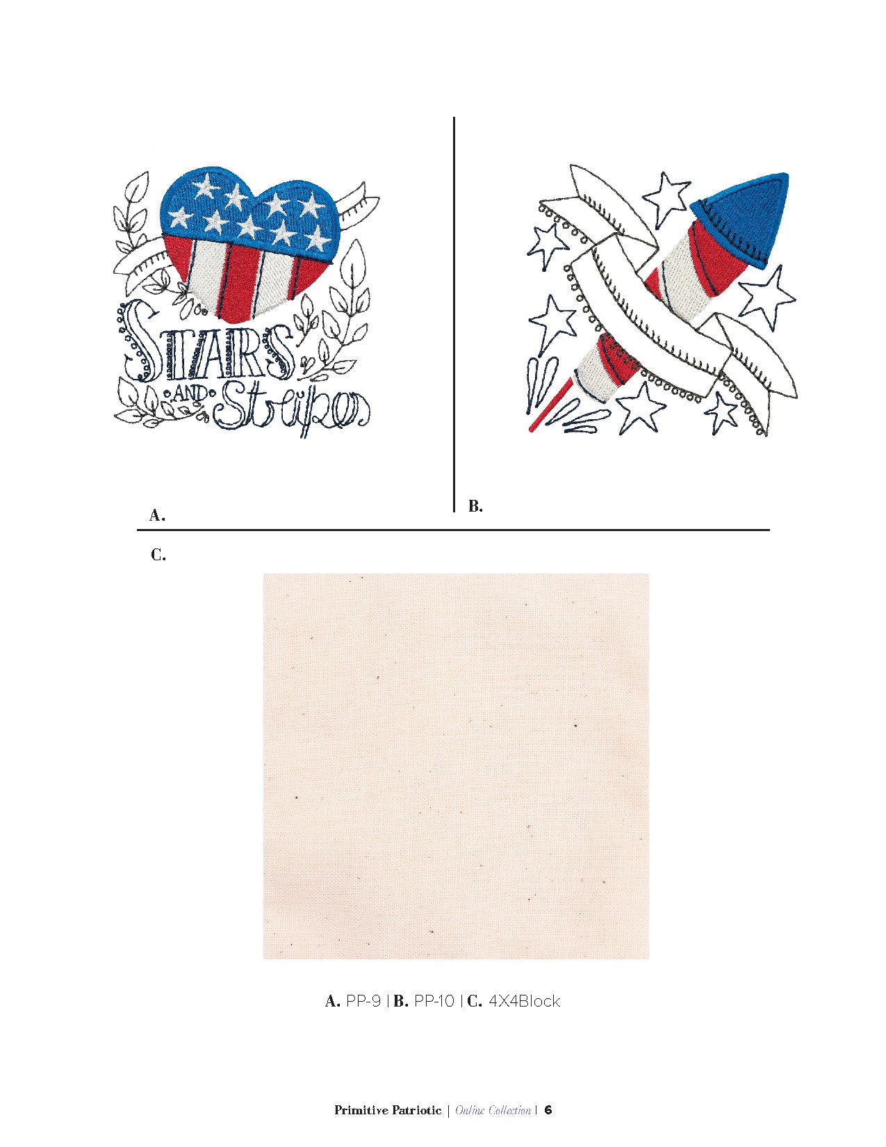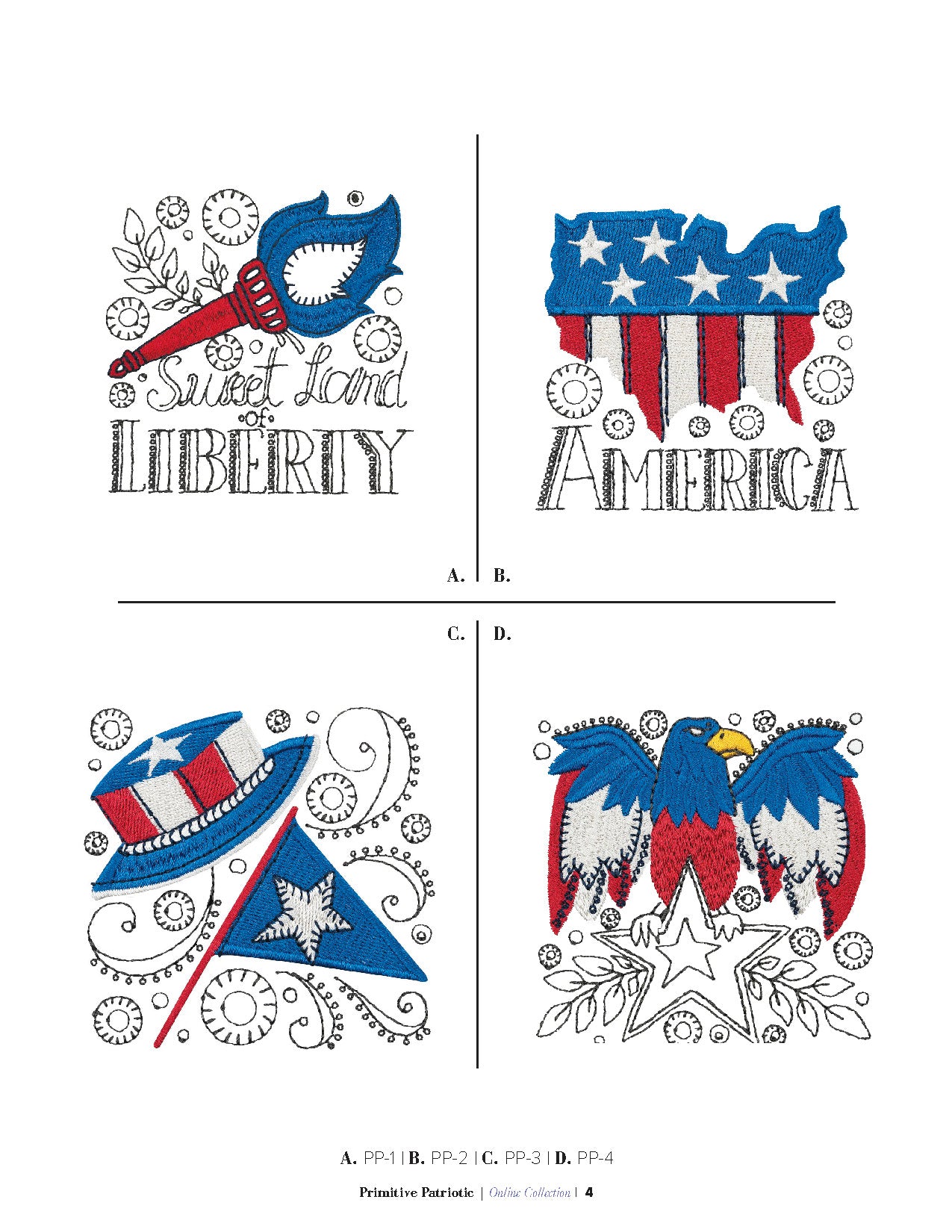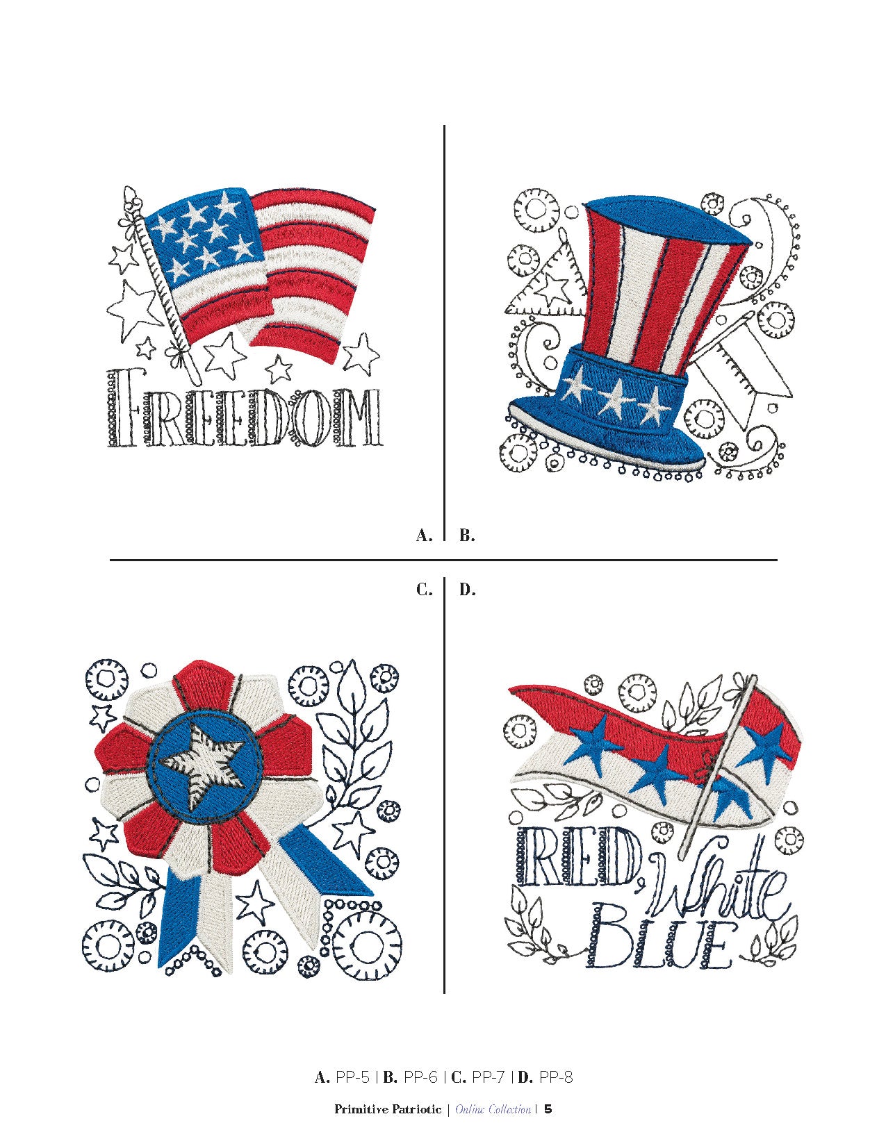 Showing your patriotism has never been easier with these embroidery-only designs. With a limited color palette, the beauty of the icons and typography of these designs truly shows through. The primitive stitching mimics that of hand-done needlework, with simple line stitching adding detailed motifs to the design. Satin stitching throughout the designs adds pops of bright red and blue that catch the eye and create patriotic flair.