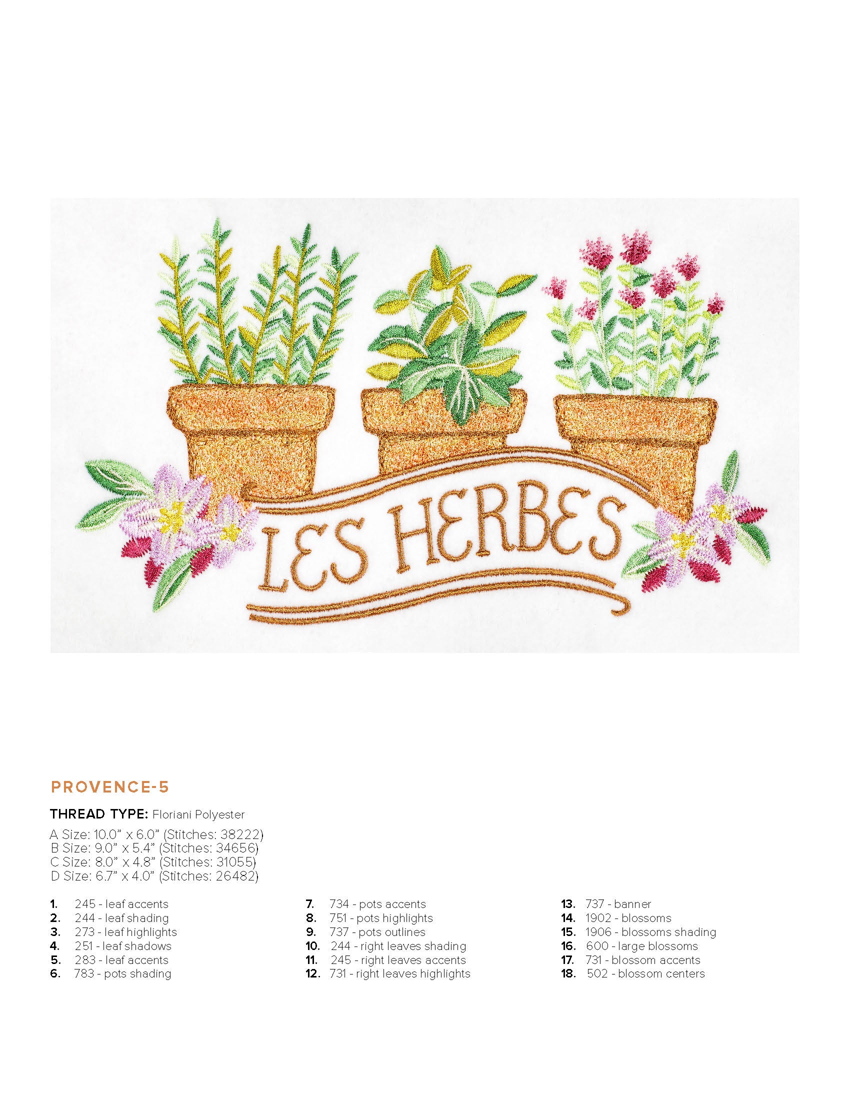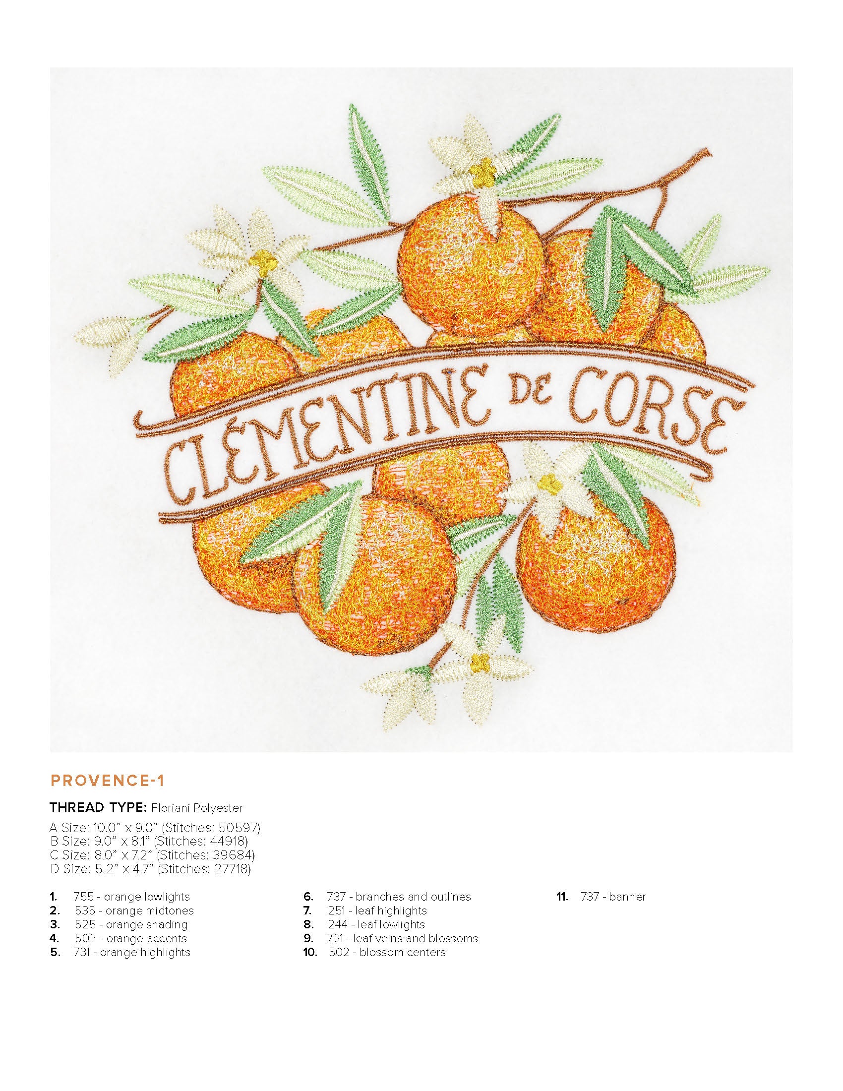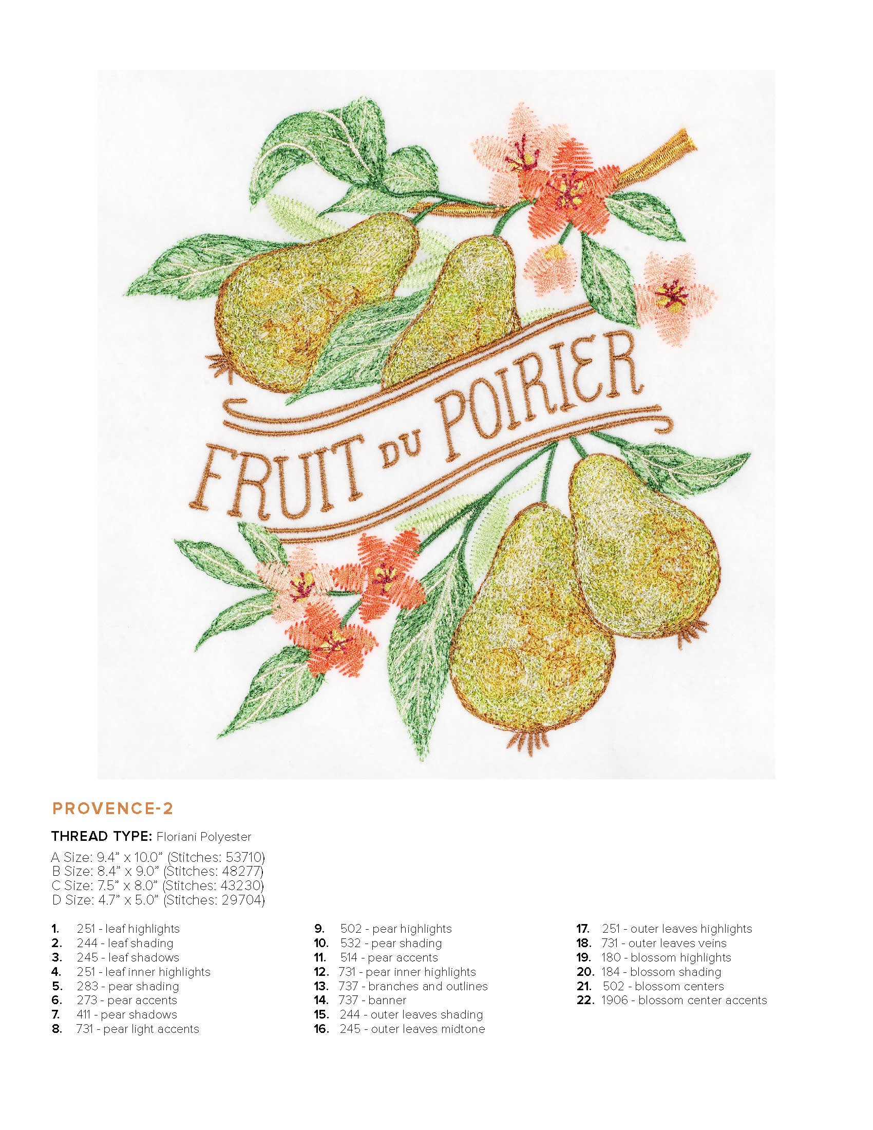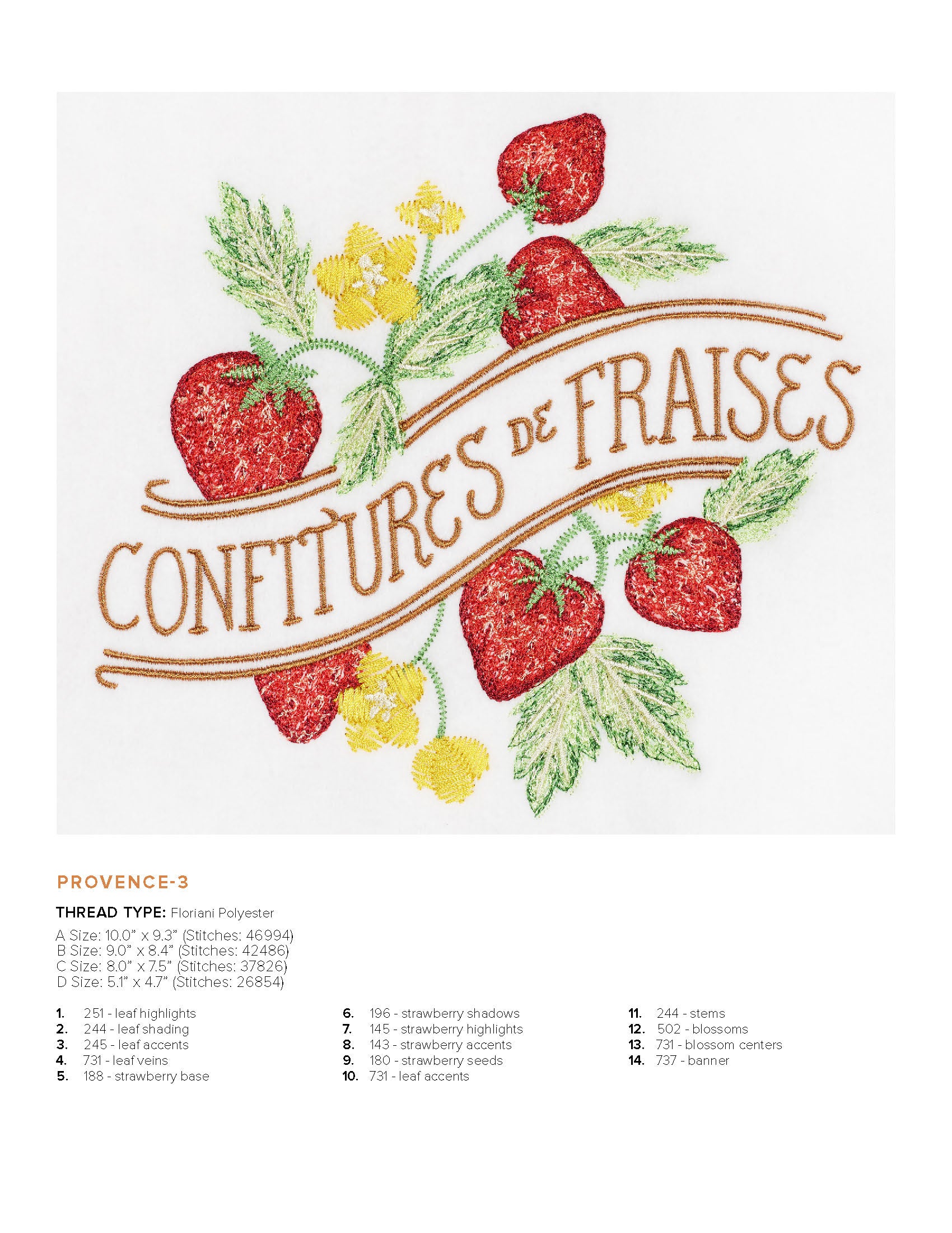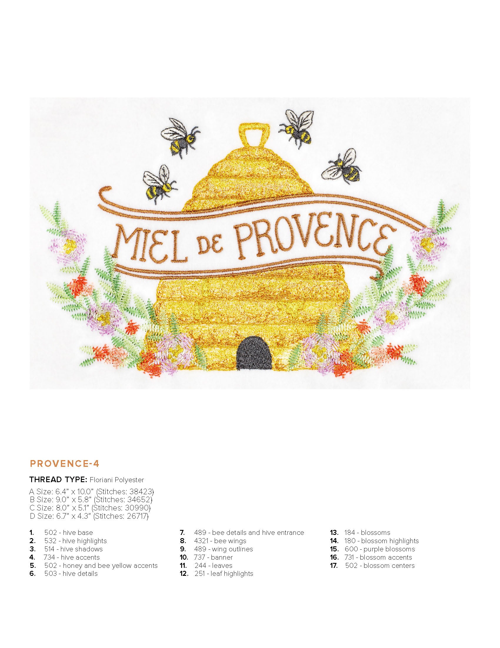 These 5 deliciously-sweet standard embroidery sketches take their inspiration from the beauty of Provence, France! Each motif is specially-digitized to represent favorite fruits, herbs, and even the sweet honey of Provence‚ all while providing a taste of culture through the beauty of the French language!
