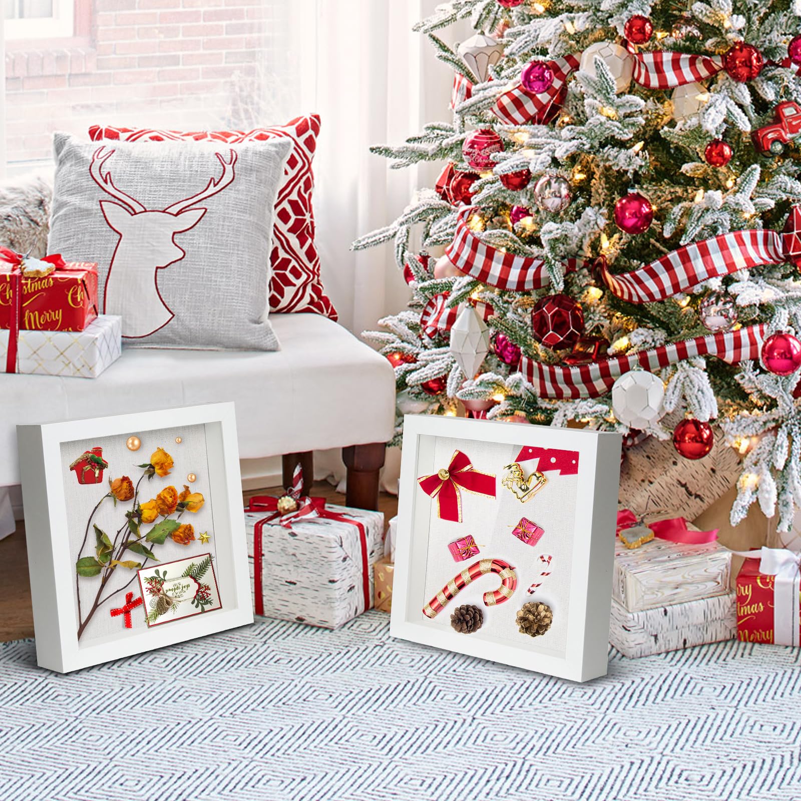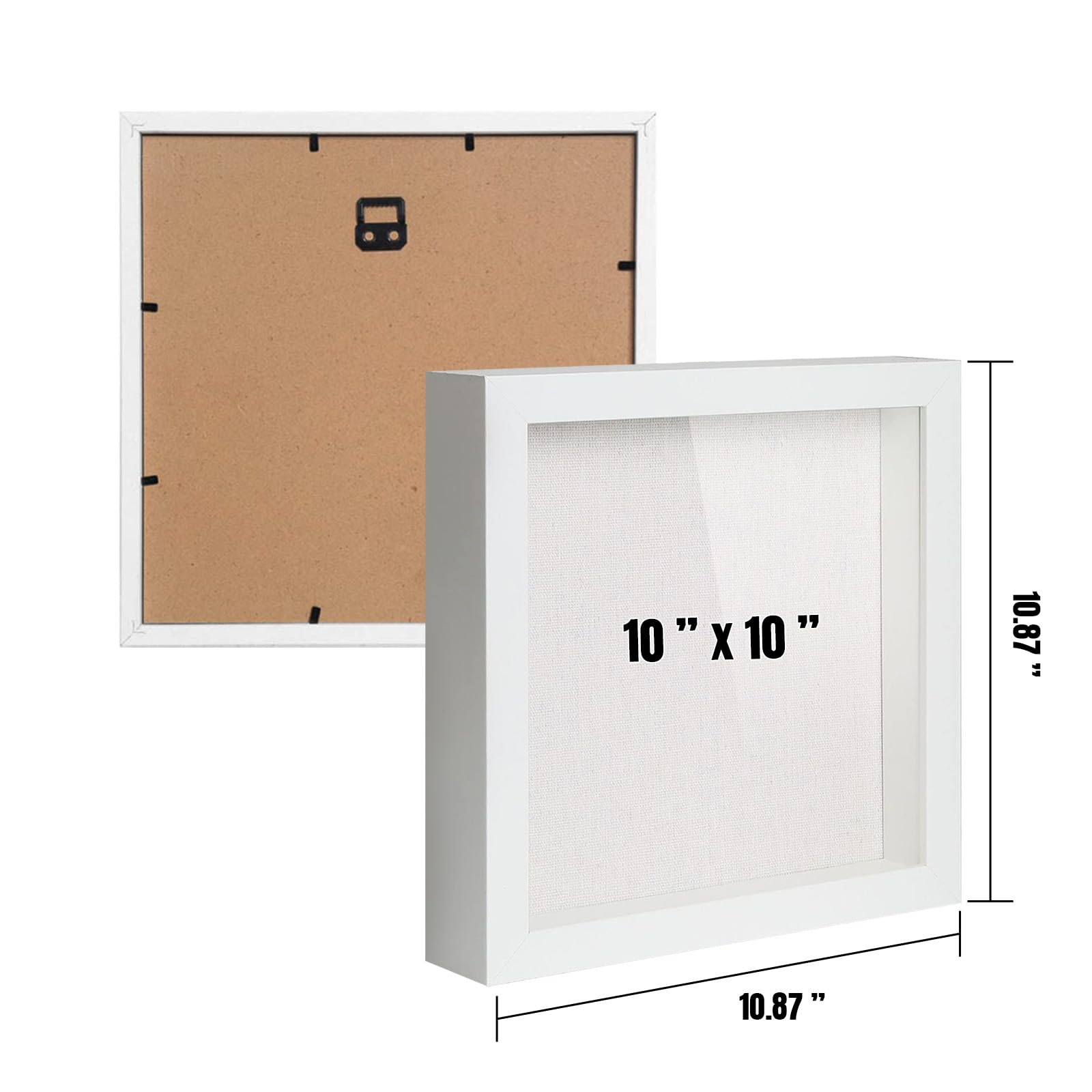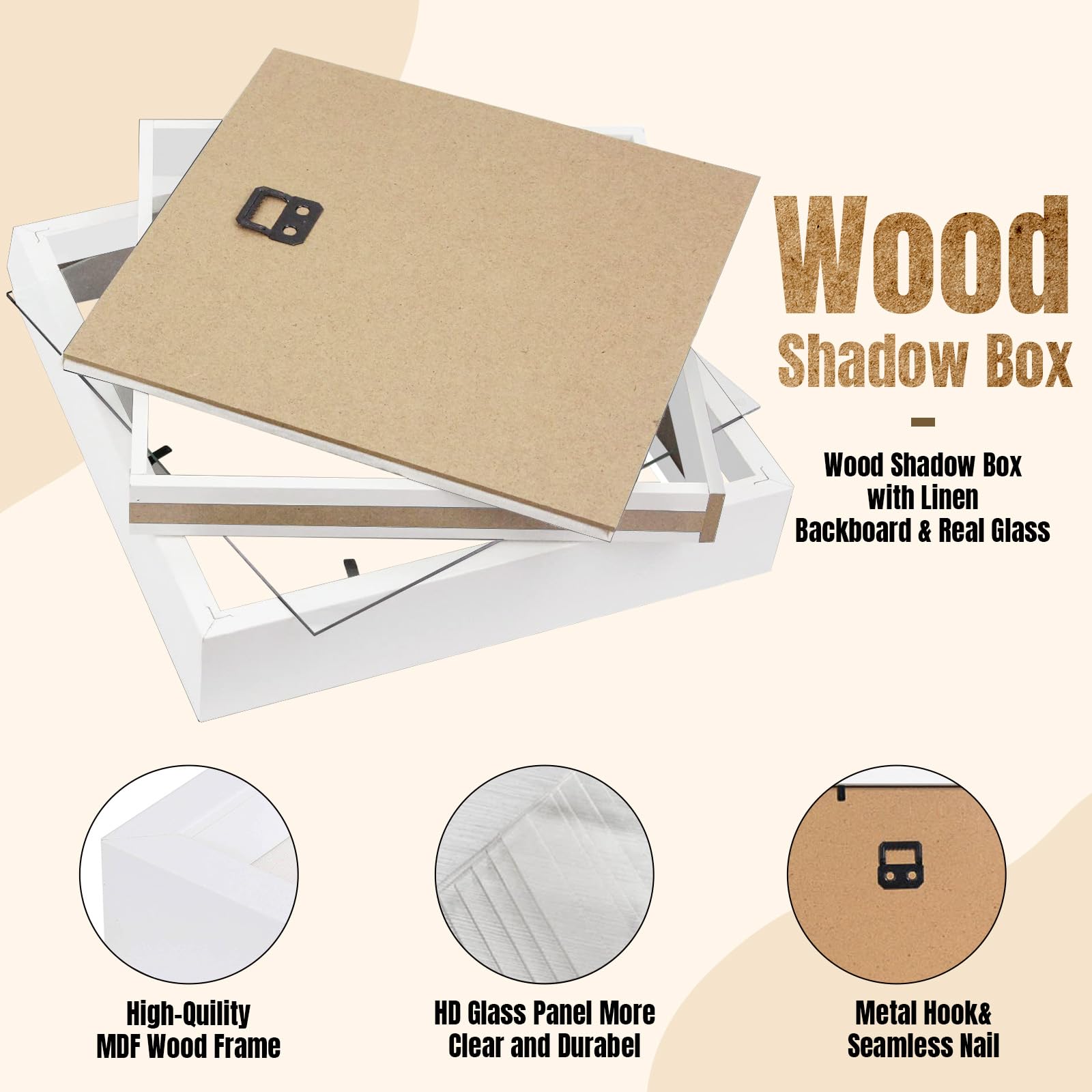 QDSSDECO 10"x10" Shadow Boxes Display Cases with Soft Linen Back Deep Wood Glass 3D Shadow Box Set for Wall and Tabletop Baby Sports, 2 Pack White