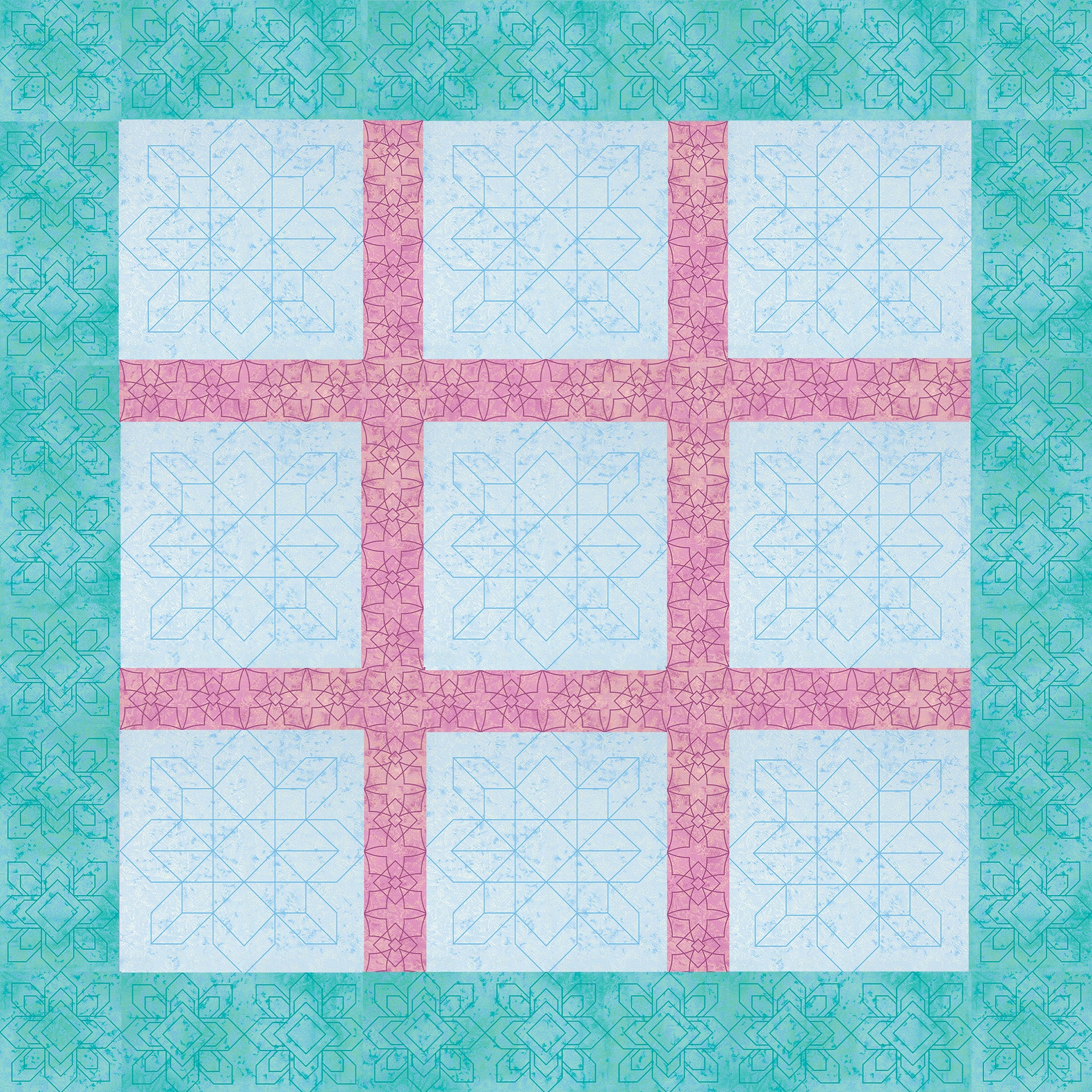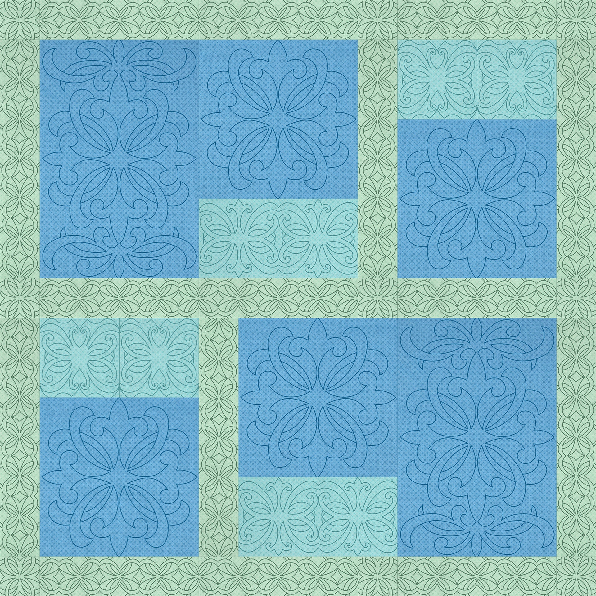 This color melt quilt is sure to melt the heart of whomever recieves it! The interwoven cable designs used throughout the main blocks and sashing provide the quilt with an air of tradition without becoming too complex or difficult to decipher. Longer, more delicate fan designs used in the borders help surround the tighter patterns with an open weave. In a wash of blues, this quilt is sure to drop some jaws with its simple yet stunning patterns.