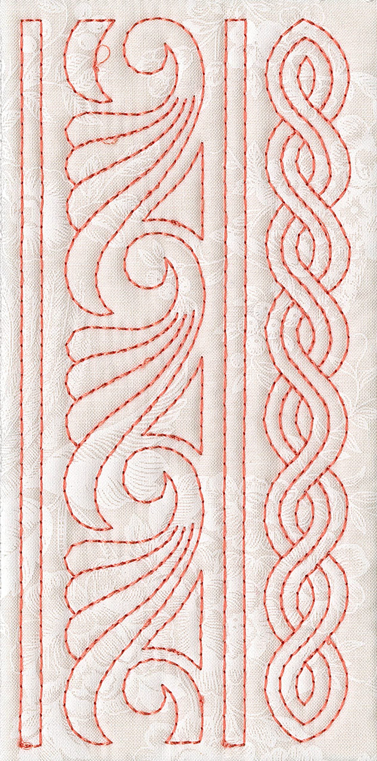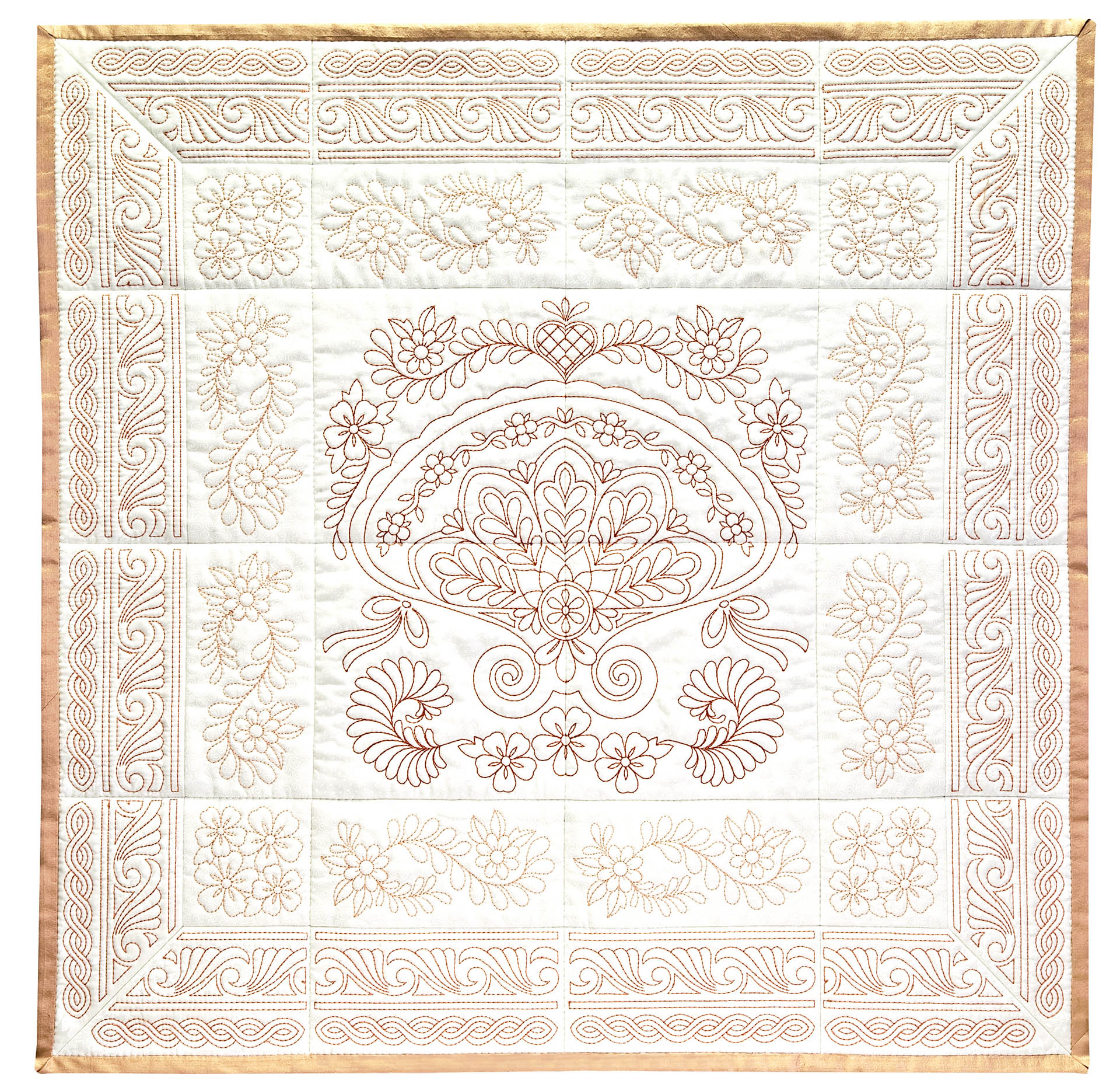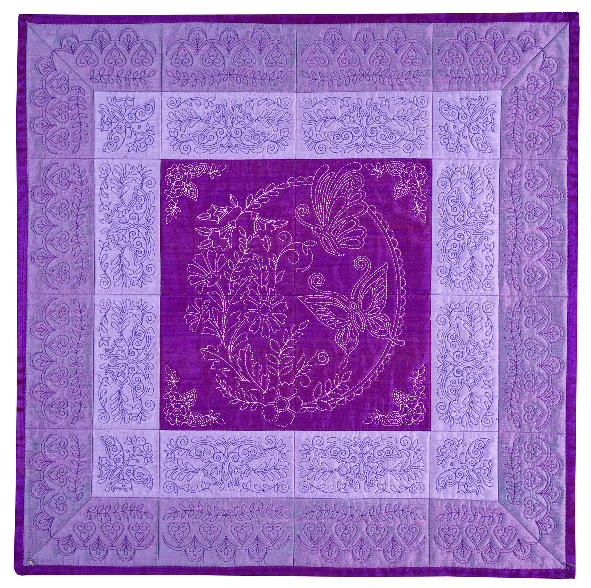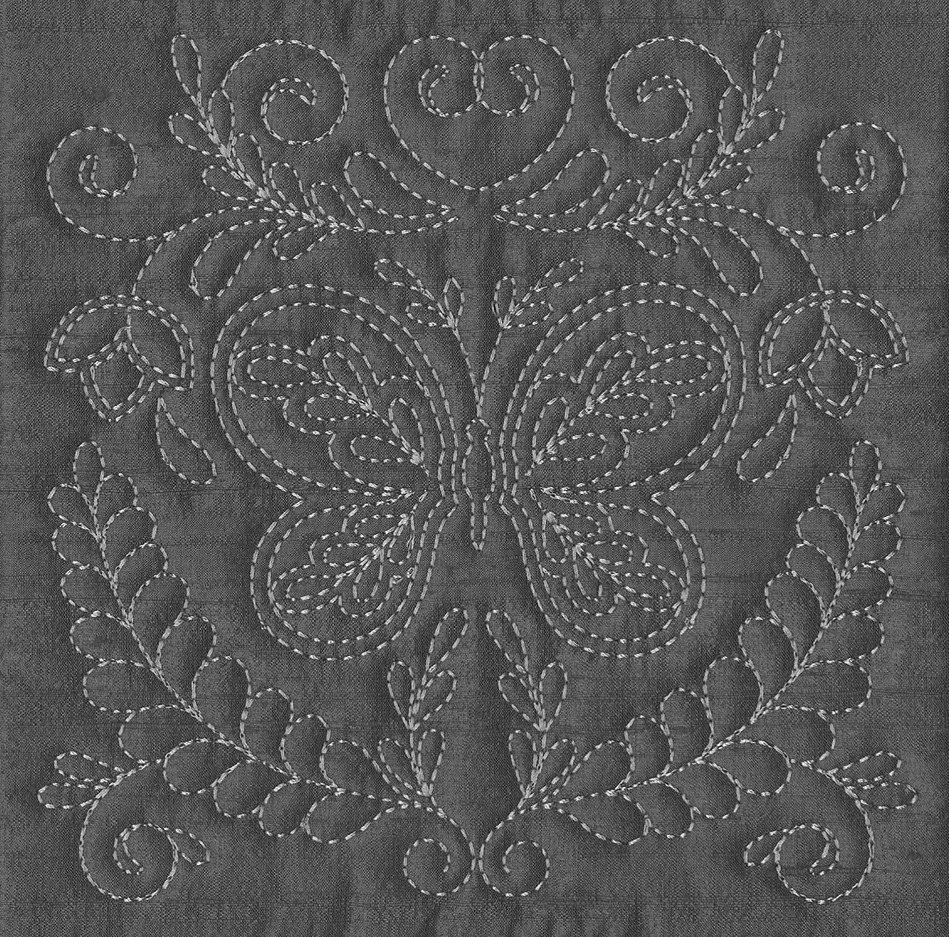 The Quilters Dream collection has so many design options available to you that you will not know where to start first. There are two different design themes, butterflies and floral fans. Each of the themes comes with a large 4 block scene. 2 individual blocks, as well as 2 multi part borders. All of these design elements can be combined to create a quilt of any size. Each of the quilt blocks come in 4 sizes, so no matter which machine you have you can enjoy these designs. There are also stippled blocks, blank blocks and individual running stitch designs. We created this collection in a unique way , you no longer have to center your designs, waste fabric or worry about trimming your blocks wrong. The first step is to hoop muslin as a base, you then add batting and your top fabric to create the block. By doing this you save fabric because you don’t hoop your base fabric. Also the designs are truly quilted because you added batting in between the layers. This is a simple technique to master. The tutorial on the following pages will show you how to do this step by step as well as give you dozens of other design options.