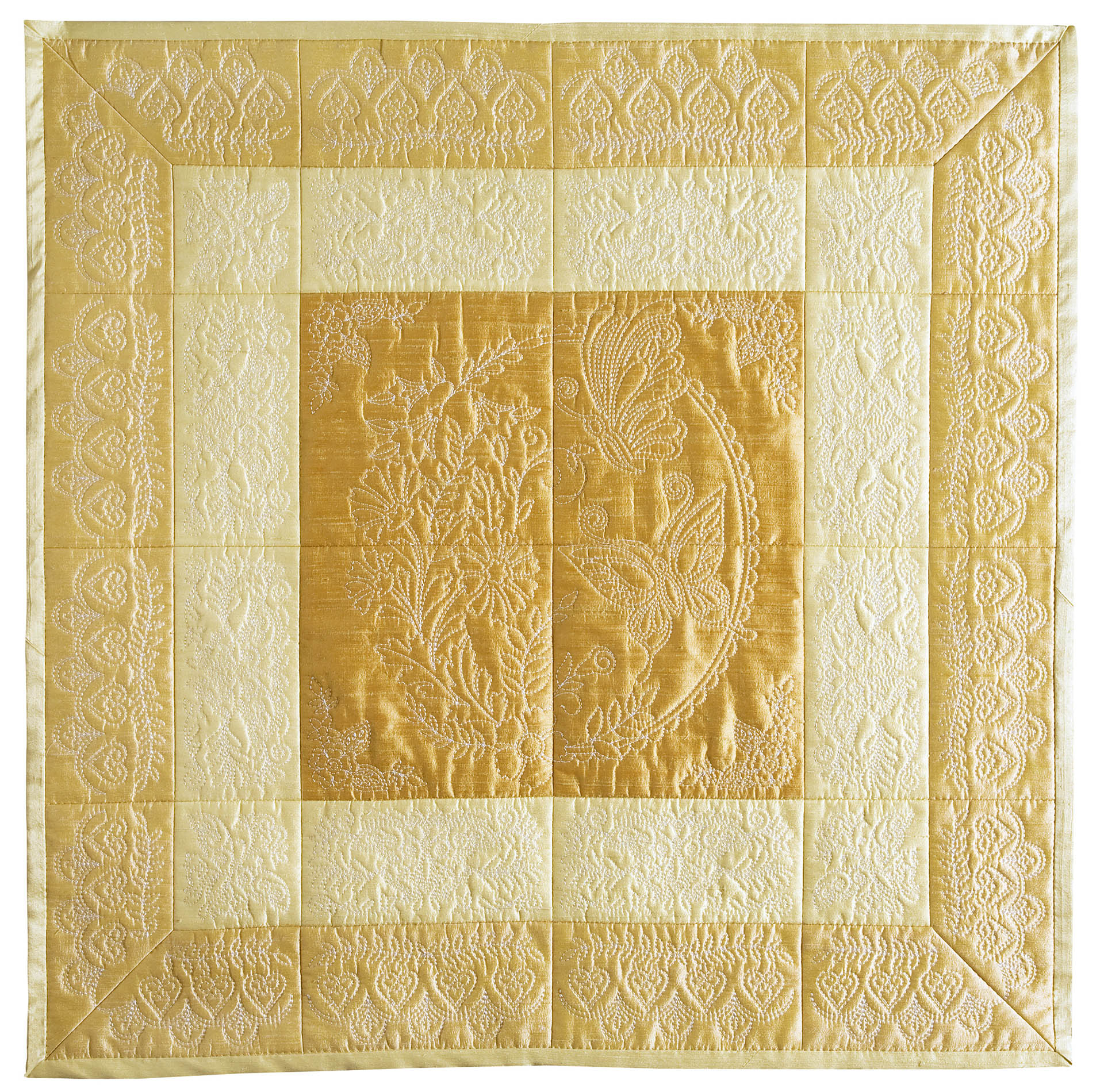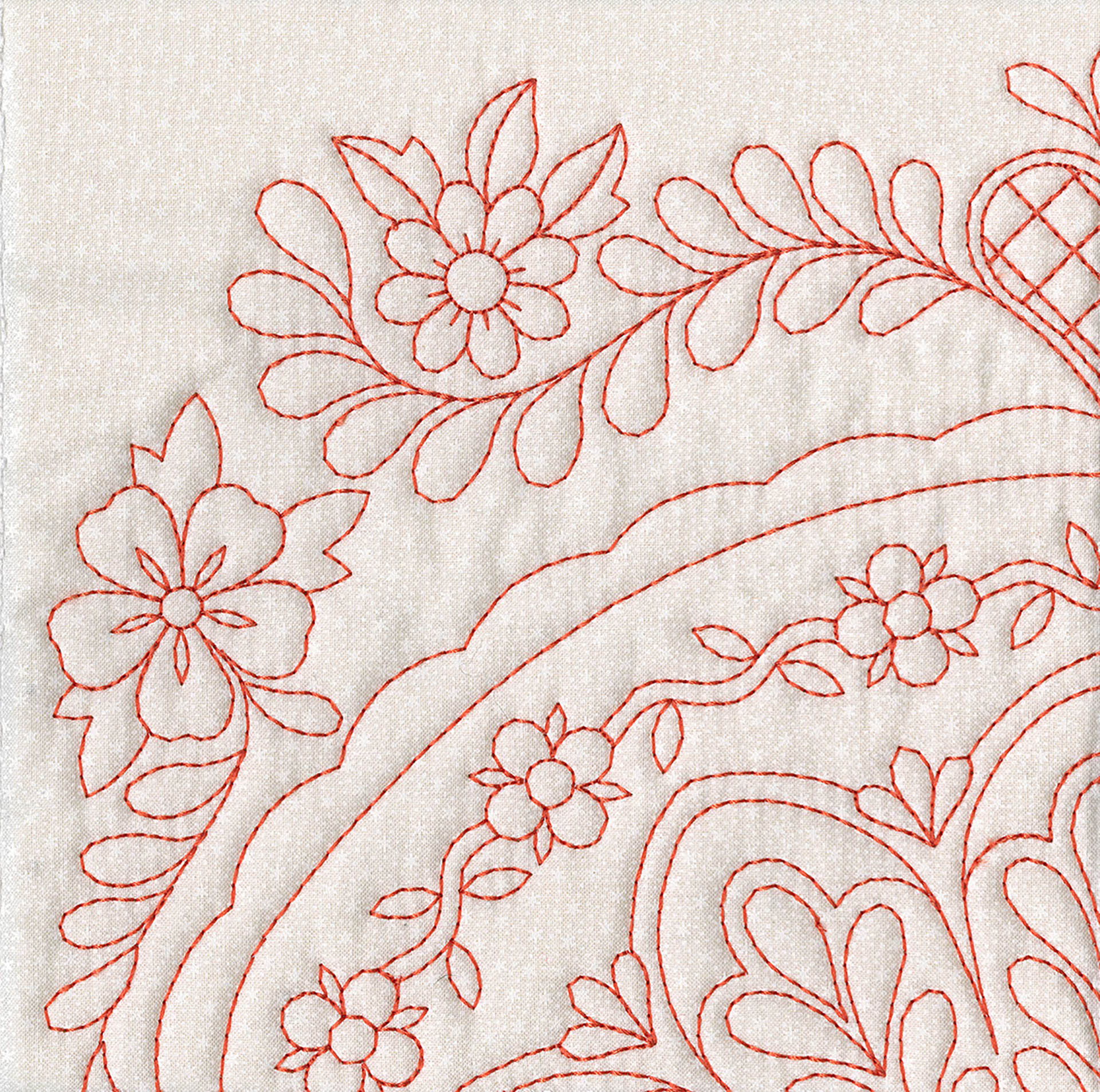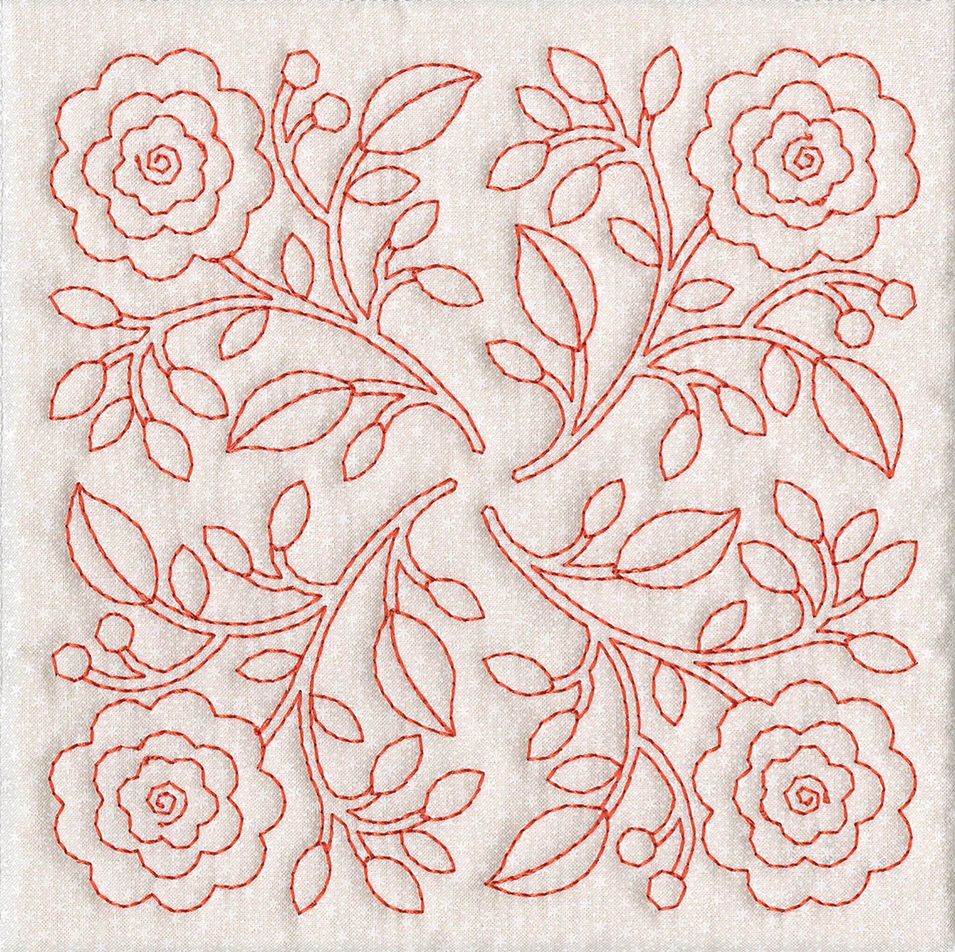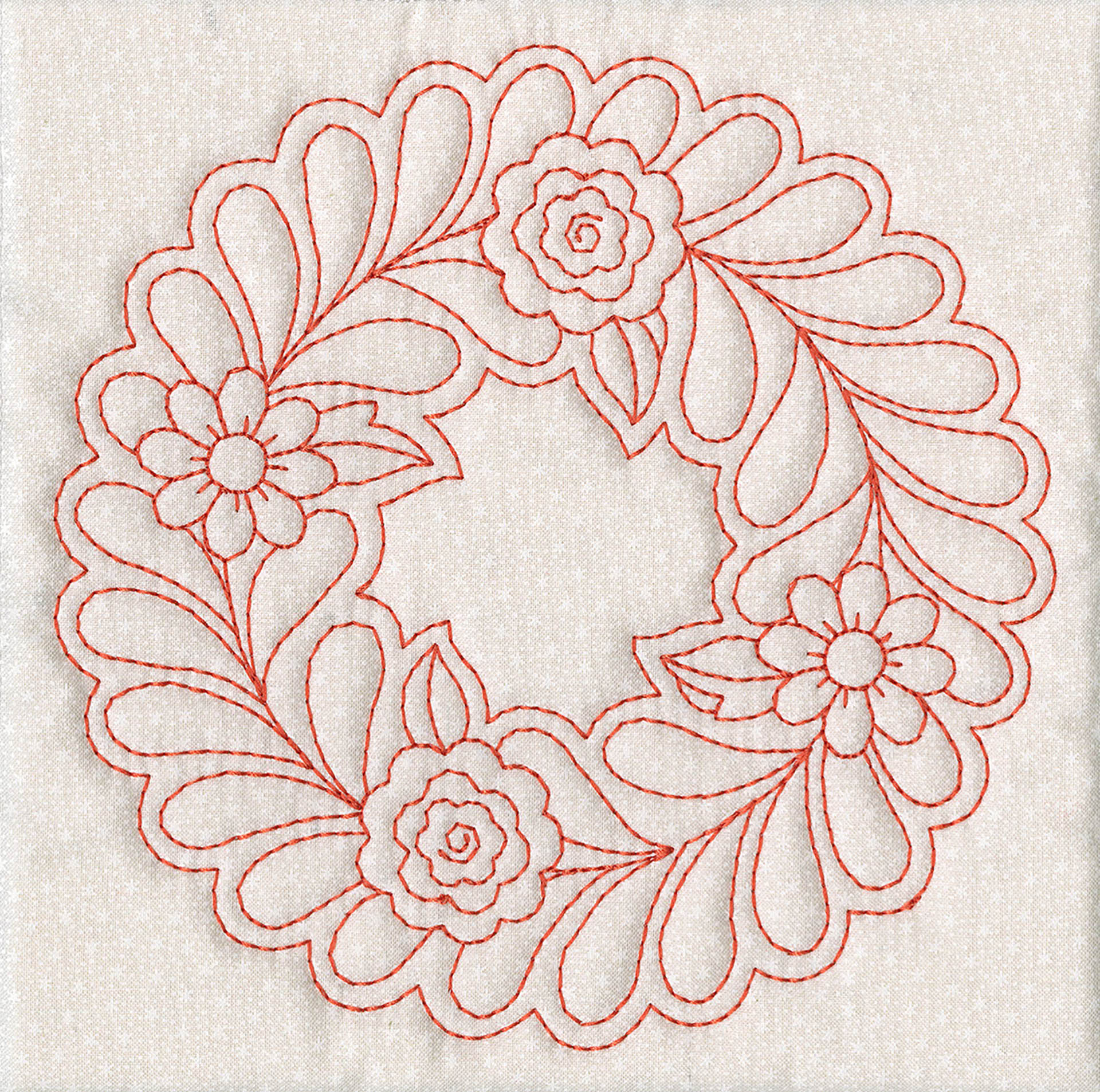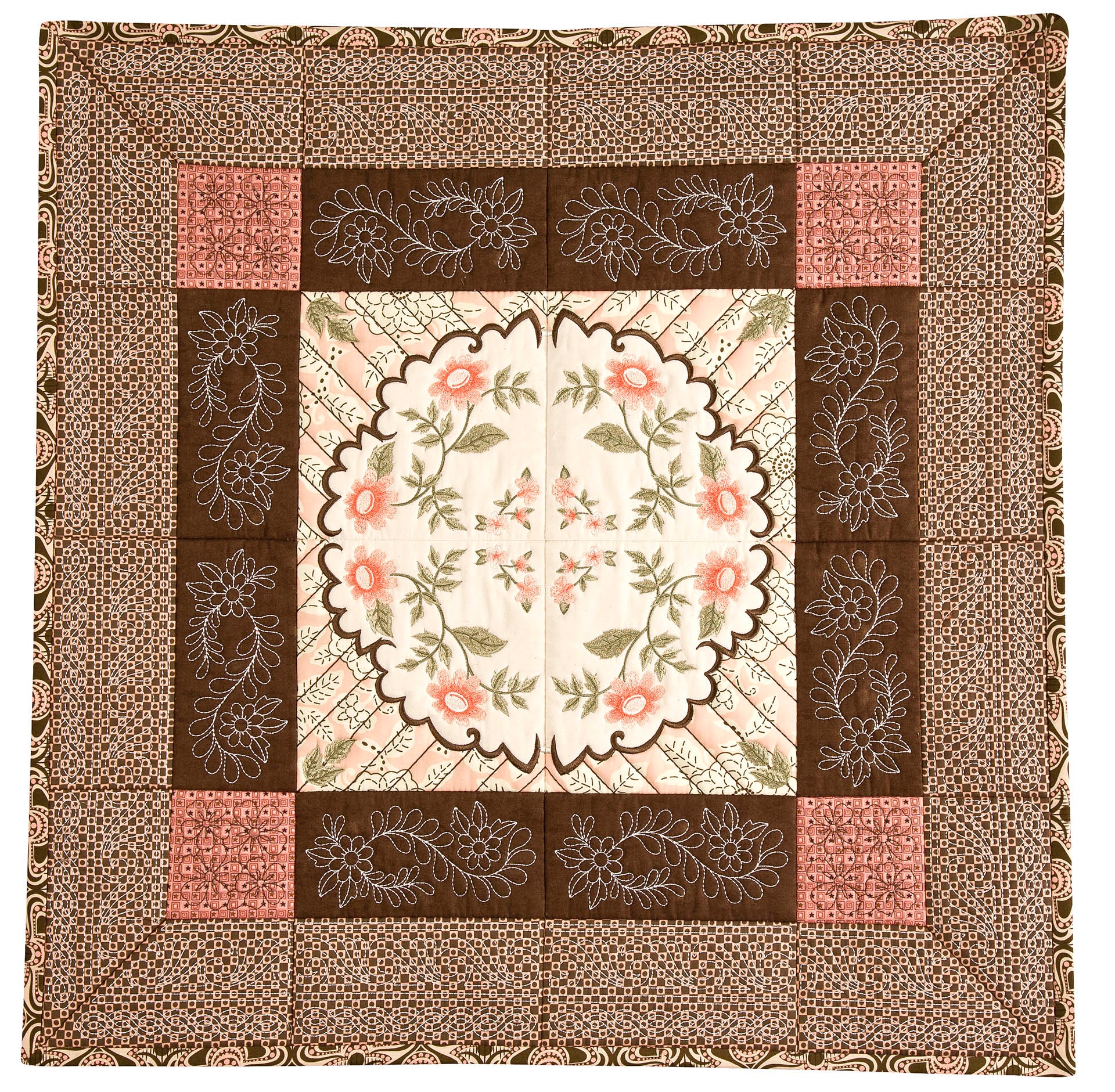 The Quilters Dream collection has so many design options available to you that you will not know where to start first. There are two different design themes, butterflies and floral fans. Each of the themes comes with a large 4 block scene. 2 individual blocks, as well as 2 multi part borders. All of these design elements can be combined to create a quilt of any size. Each of the quilt blocks come in 4 sizes, so no matter which machine you have you can enjoy these designs. There are also stippled blocks, blank blocks and individual running stitch designs. We created this collection in a unique way , you no longer have to center your designs, waste fabric or worry about trimming your blocks wrong. The first step is to hoop muslin as a base, you then add batting and your top fabric to create the block. By doing this you save fabric because you don’t hoop your base fabric. Also the designs are truly quilted because you added batting in between the layers. This is a simple technique to master. The tutorial on the following pages will show you how to do this step by step as well as give you dozens of other design options.
