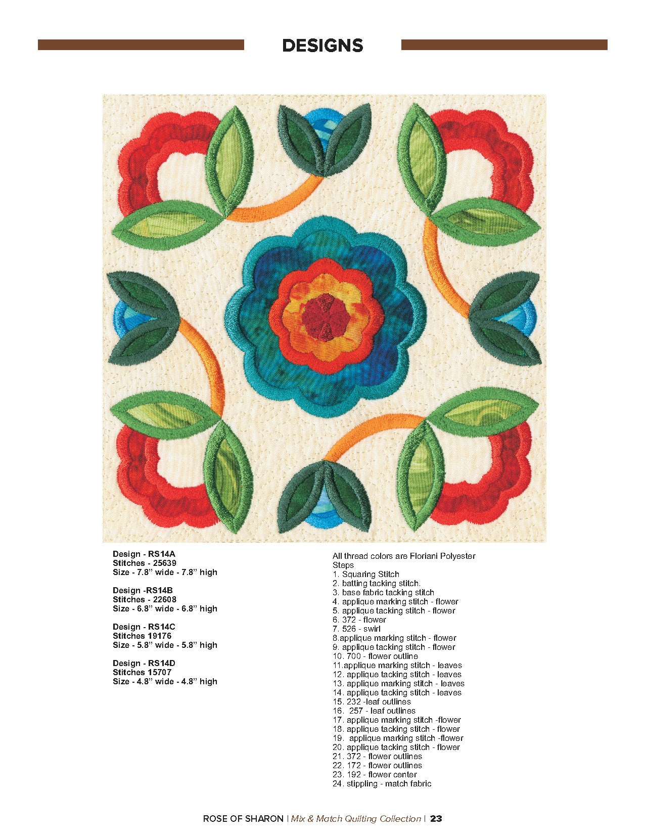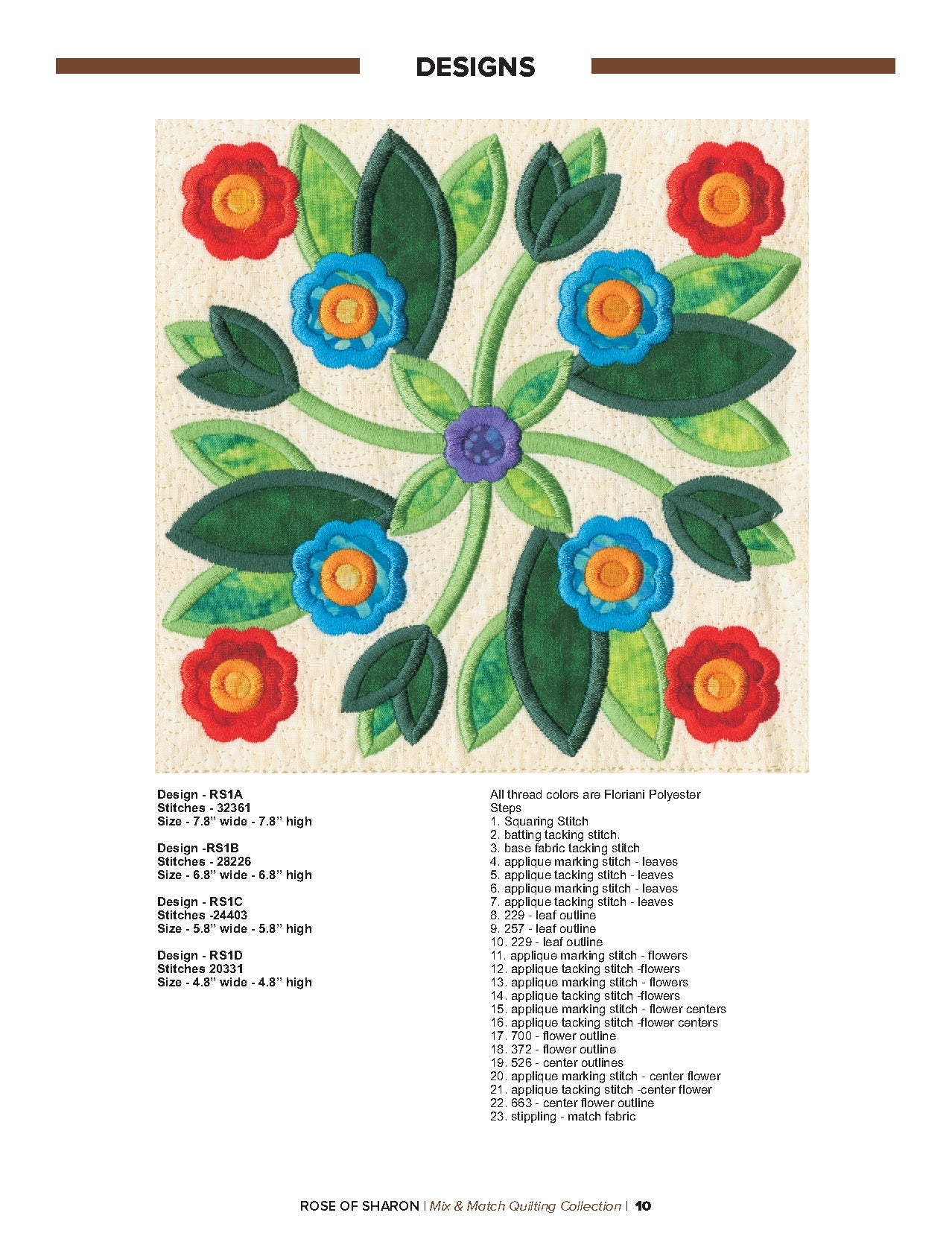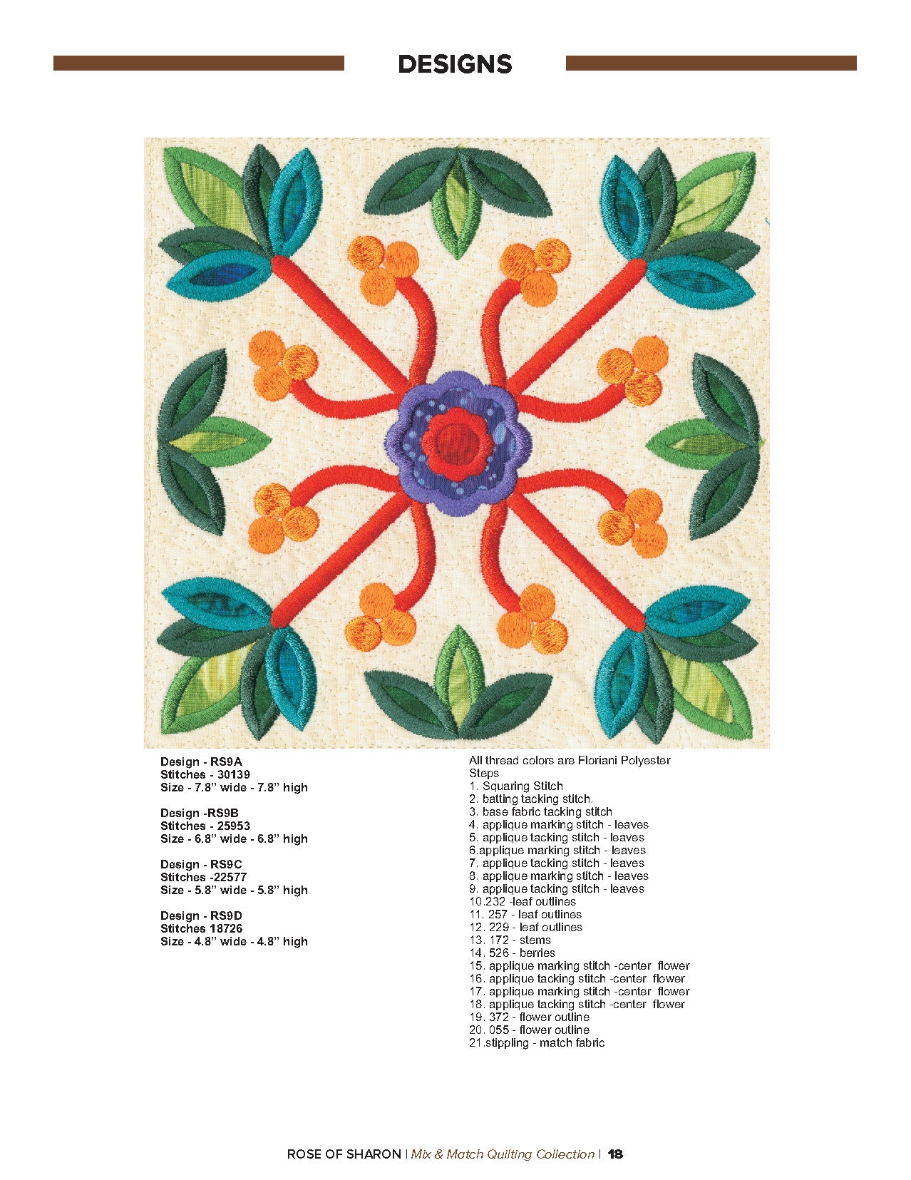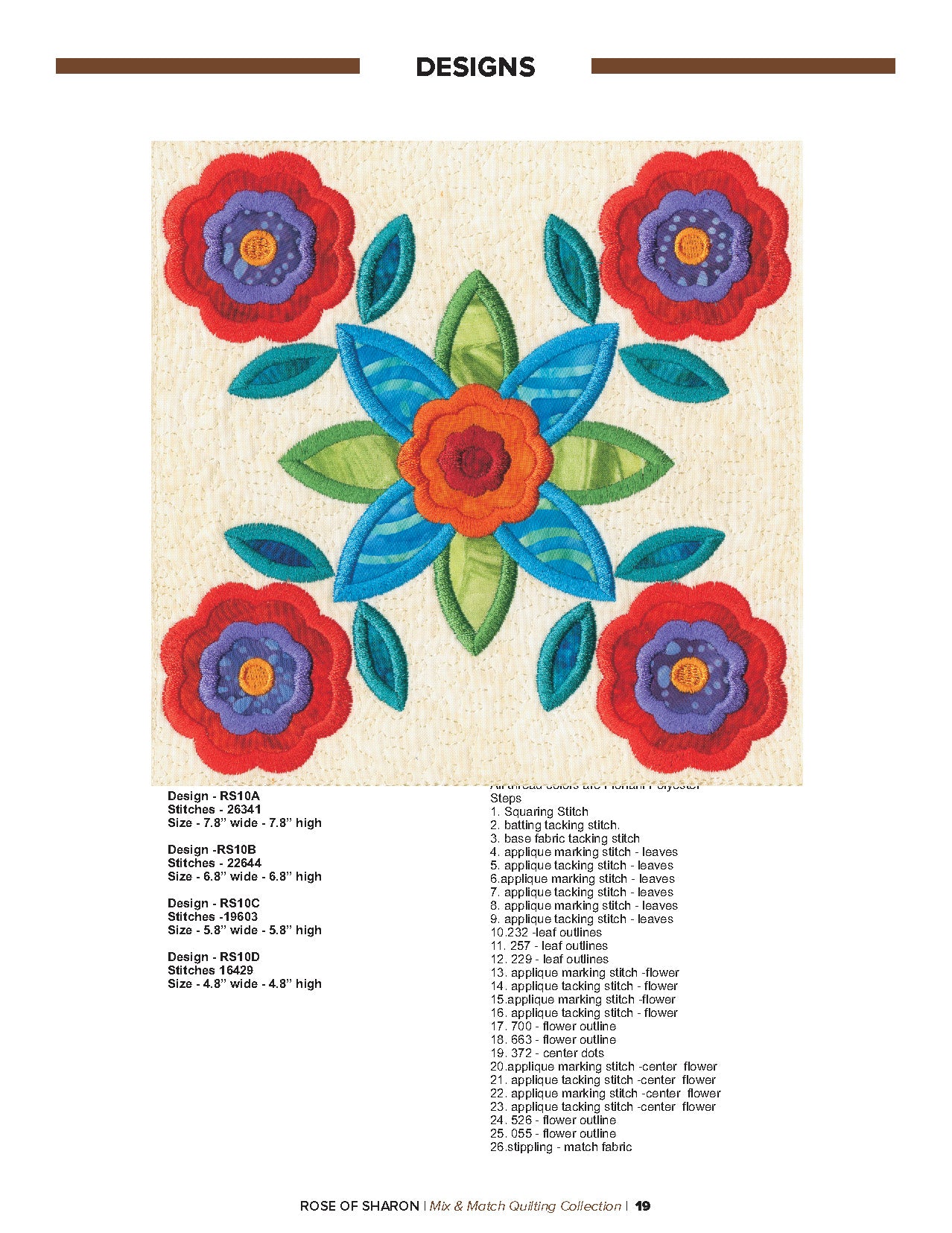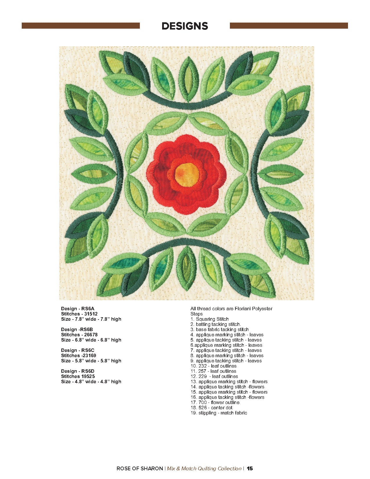 For this “Mix and Match” collection we chose a traditional quilting theme, Rose of Sharon. This type of quilt was typically created by hand using dozens of small applique pieces. The end result was beautiful but very time consuming. Instead of hand piecing and sewing blanket stitches around all of the beautiful leaves and flowers we decided to use machine applique and surround the shapes with stain stitches. The end result is stunning!