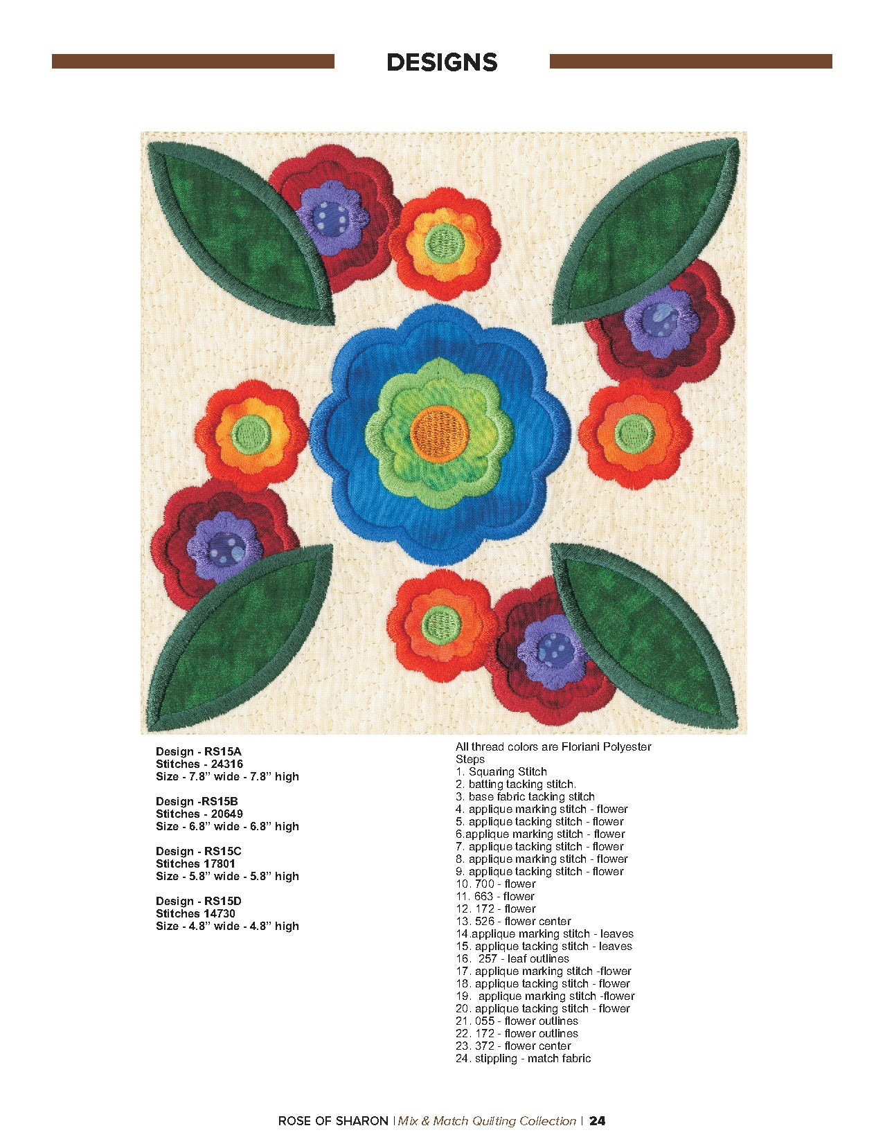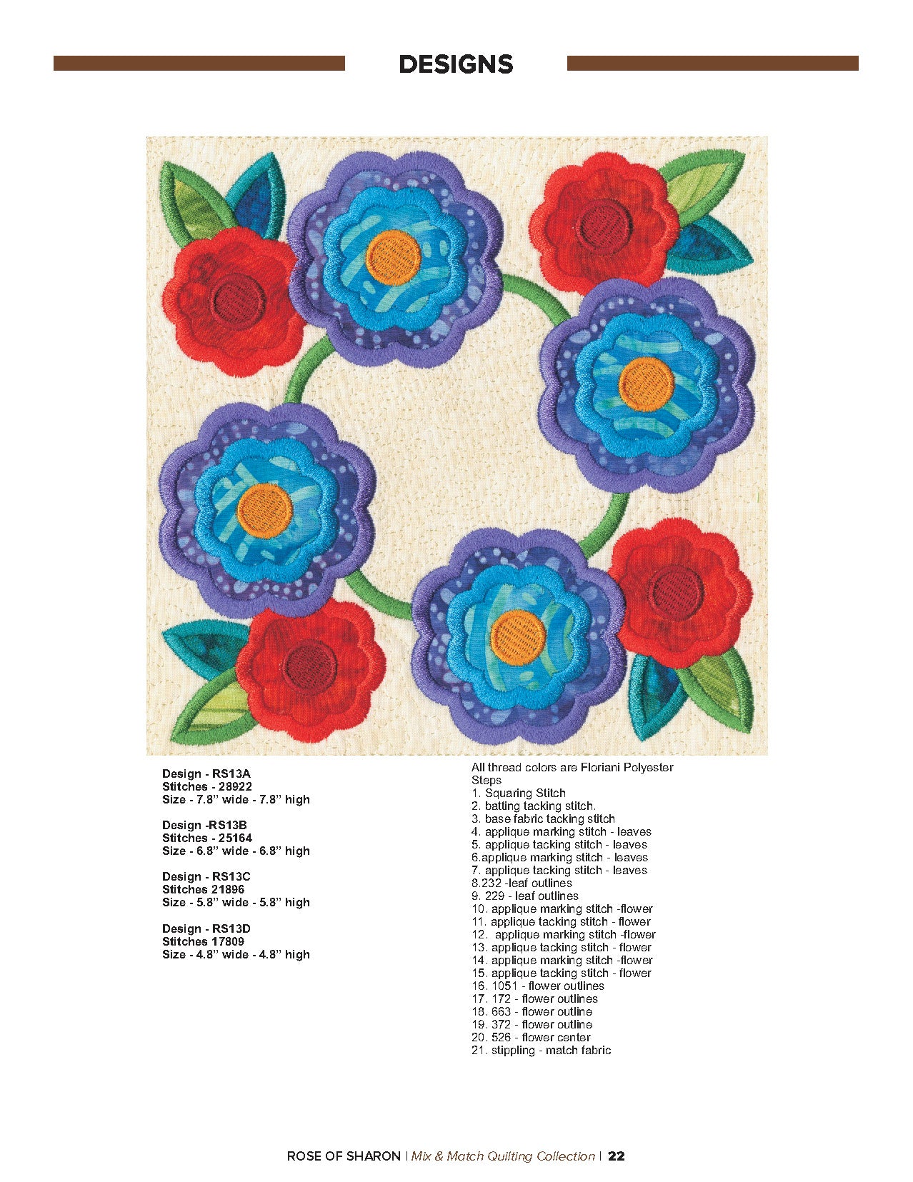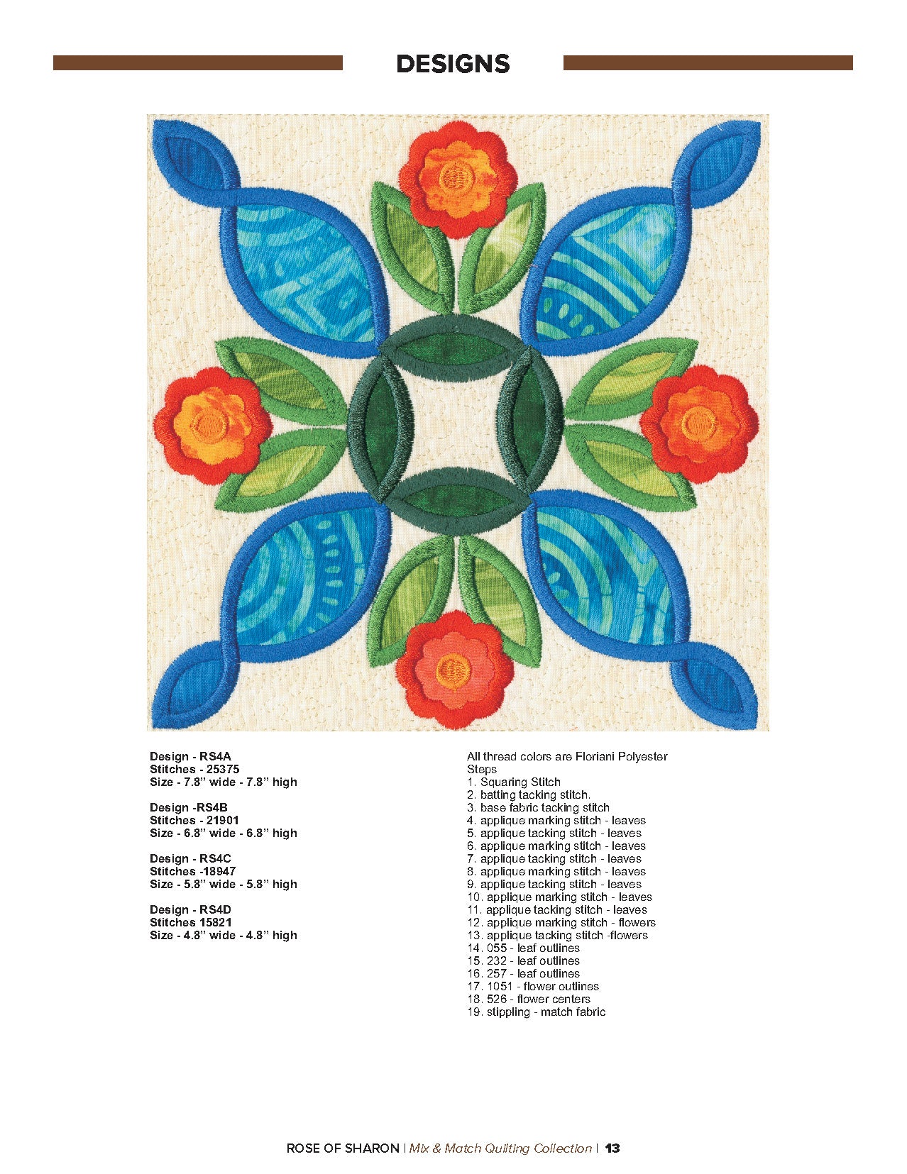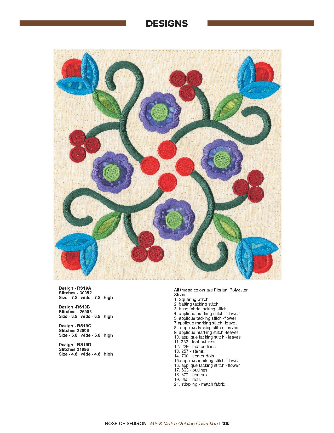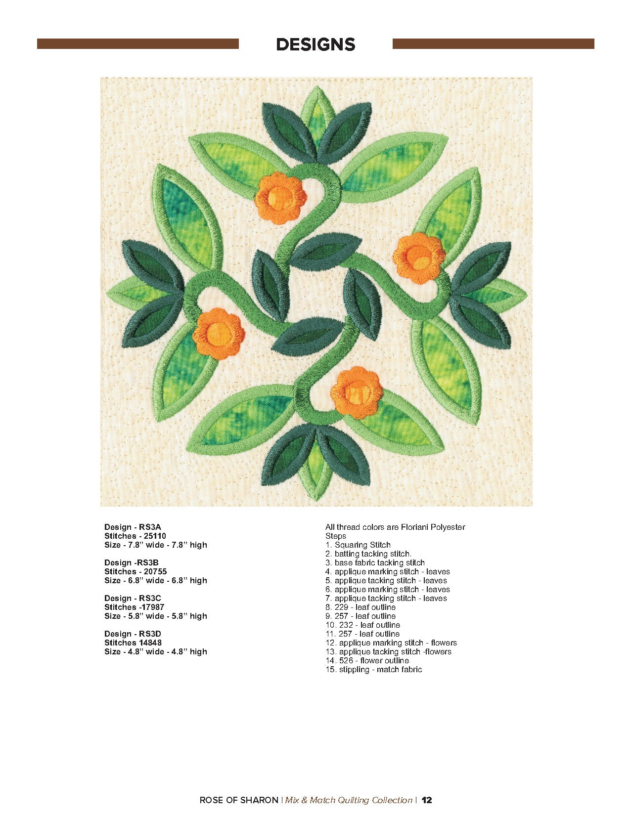 For this “Mix and Match” collection we chose a traditional quilting theme, Rose of Sharon. This type of quilt was typically created by hand using dozens of small applique pieces. The end result was beautiful but very time consuming. Instead of hand piecing and sewing blanket stitches around all of the beautiful leaves and flowers we decided to use machine applique and surround the shapes with stain stitches. The end result is stunning!