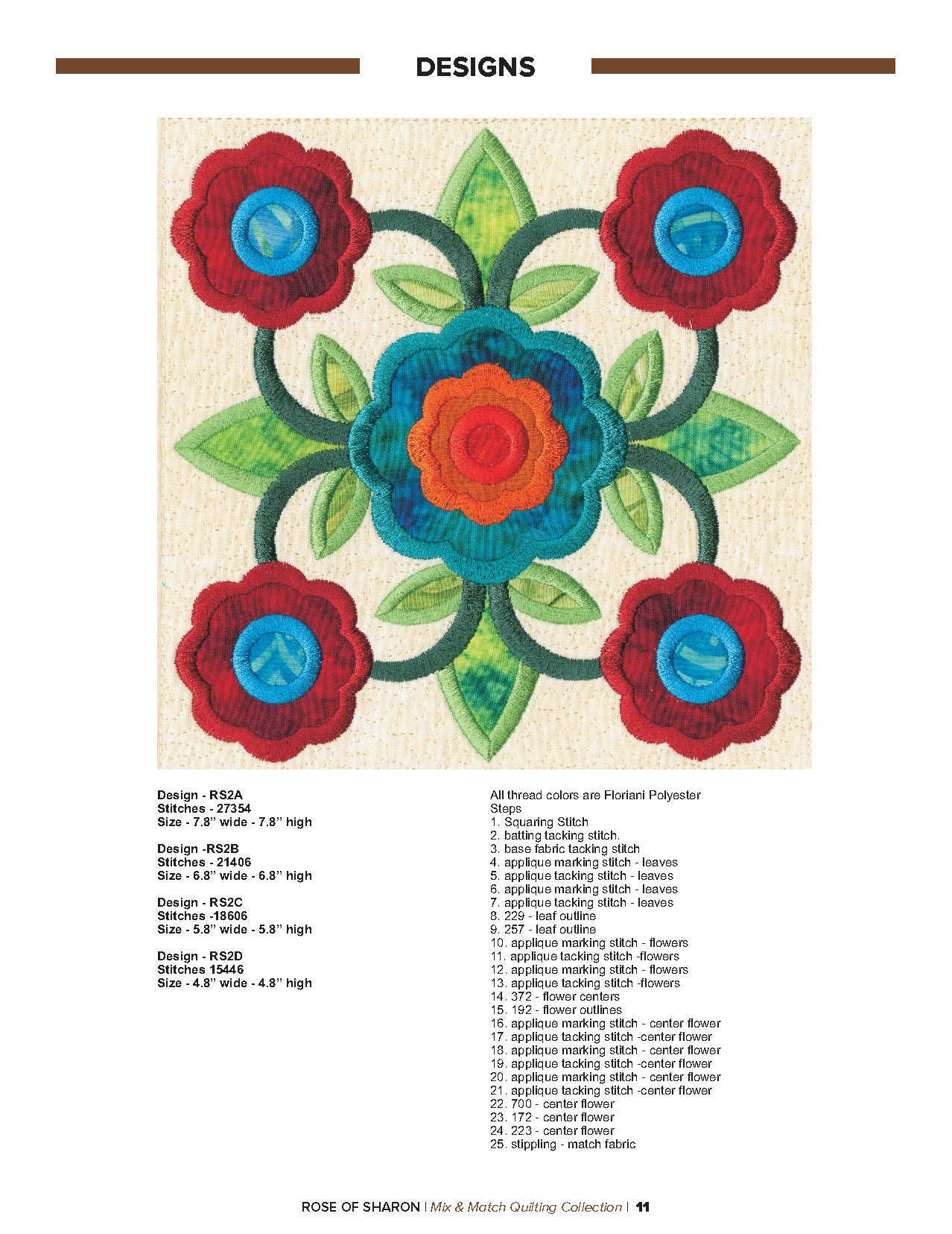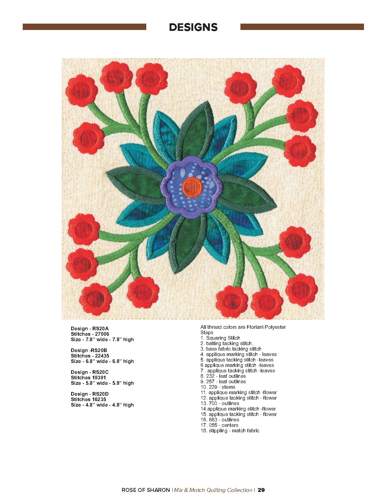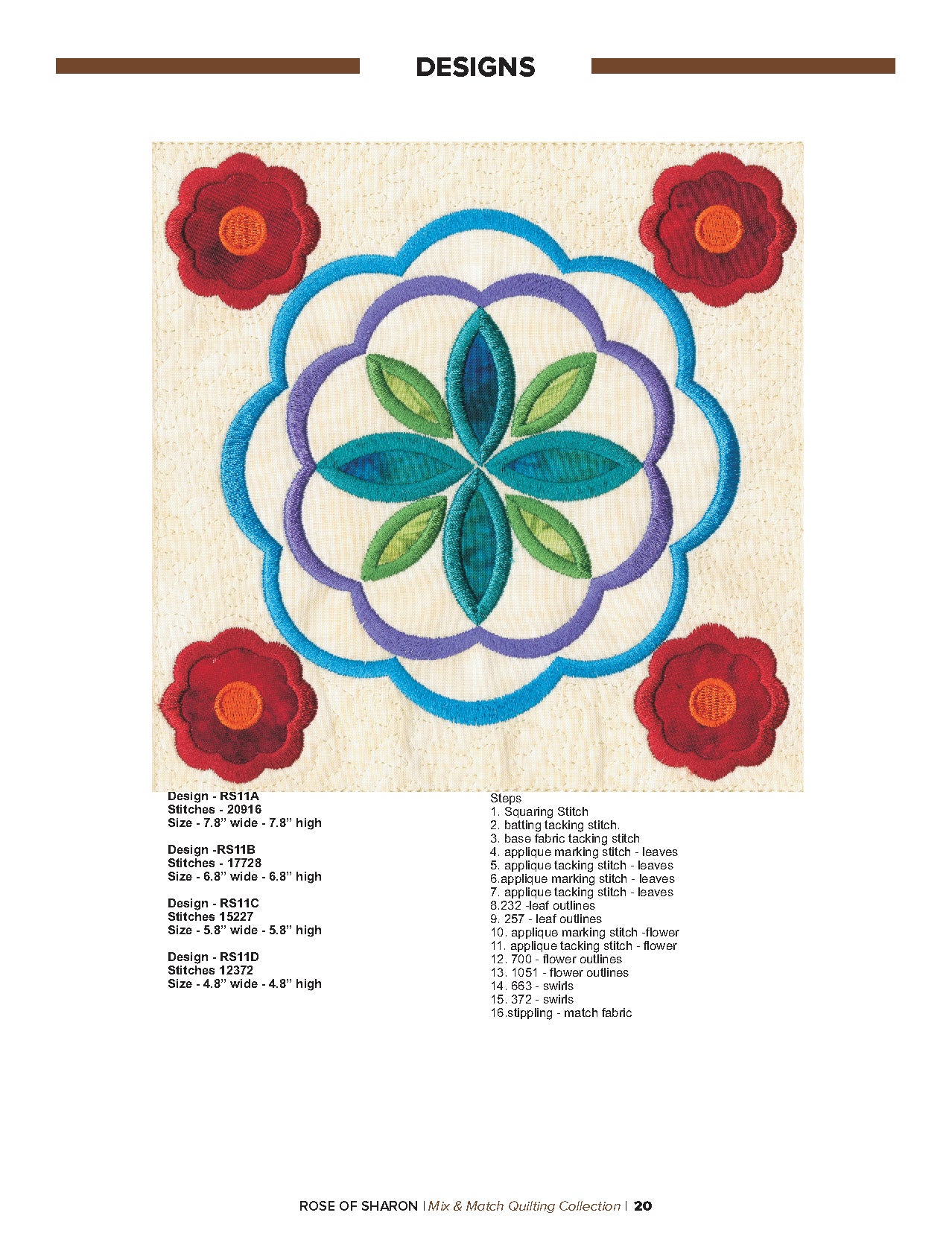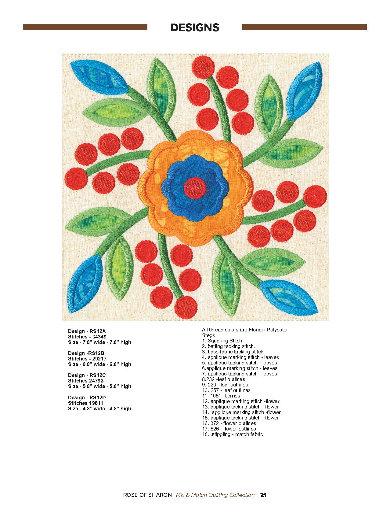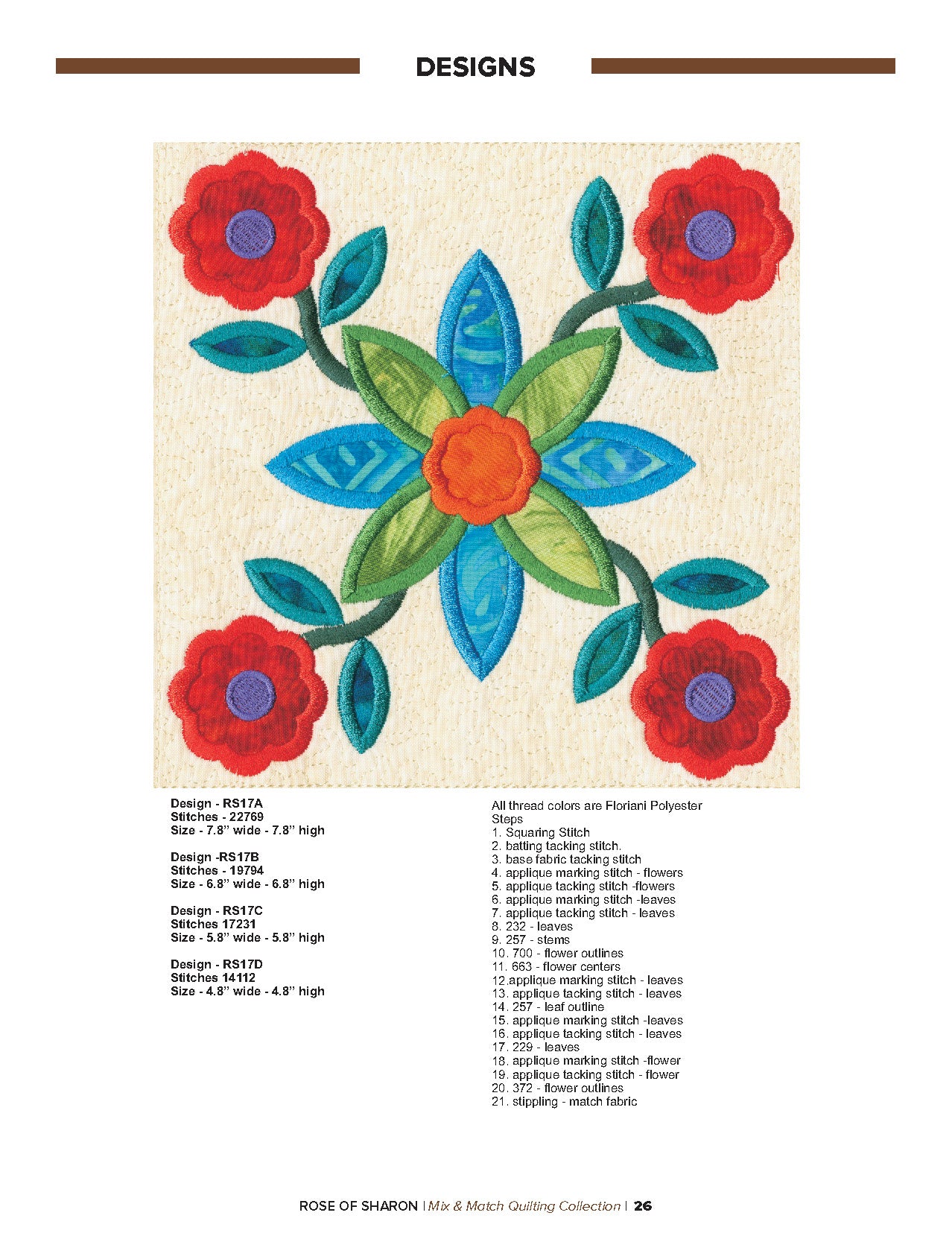 For this “Mix and Match” collection we chose a traditional quilting theme, Rose of Sharon. This type of quilt was typically created by hand using dozens of small applique pieces. The end result was beautiful but very time consuming. Instead of hand piecing and sewing blanket stitches around all of the beautiful leaves and flowers we decided to use machine applique and surround the shapes with stain stitches. The end result is stunning!