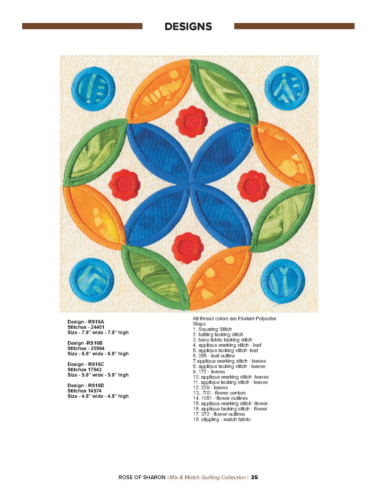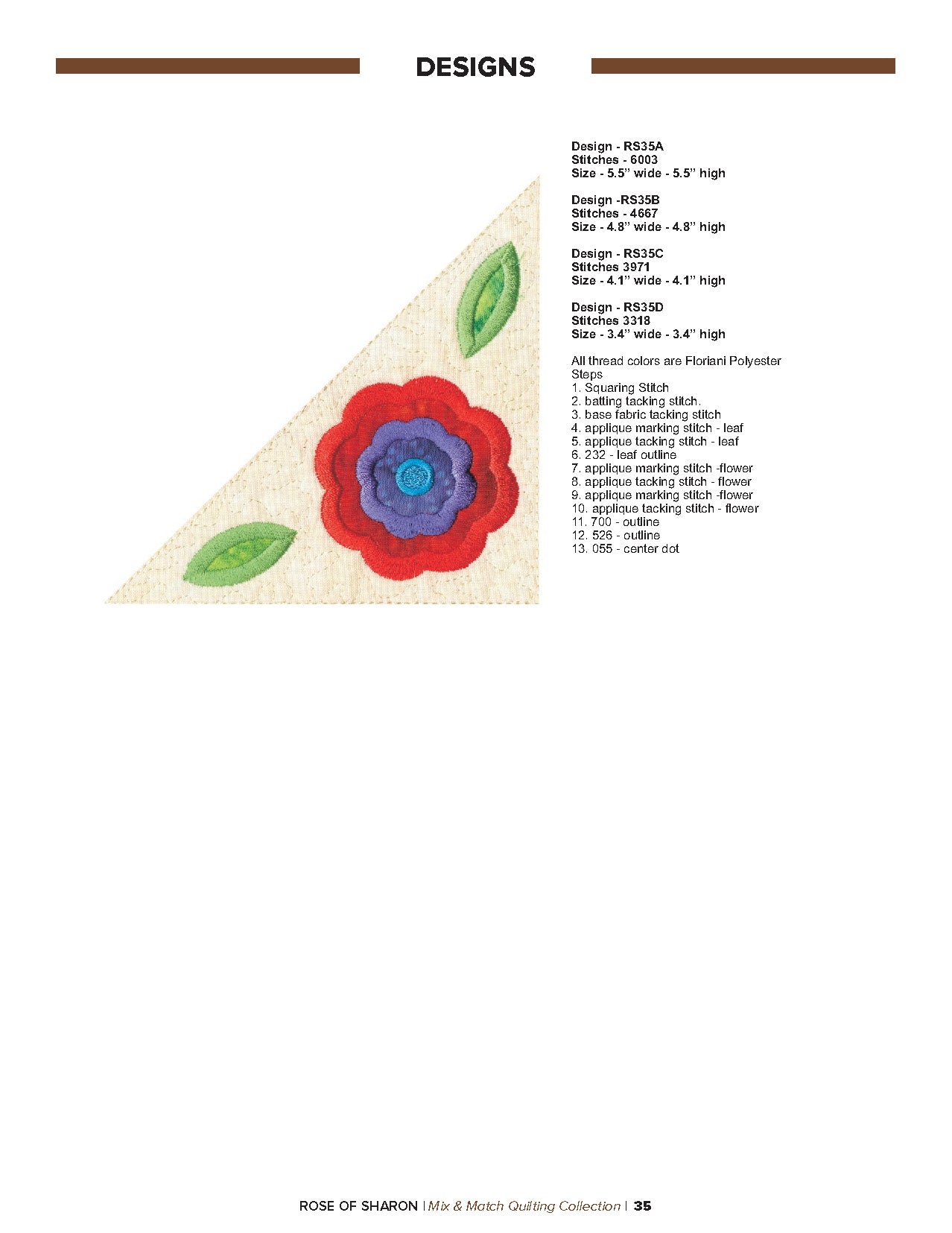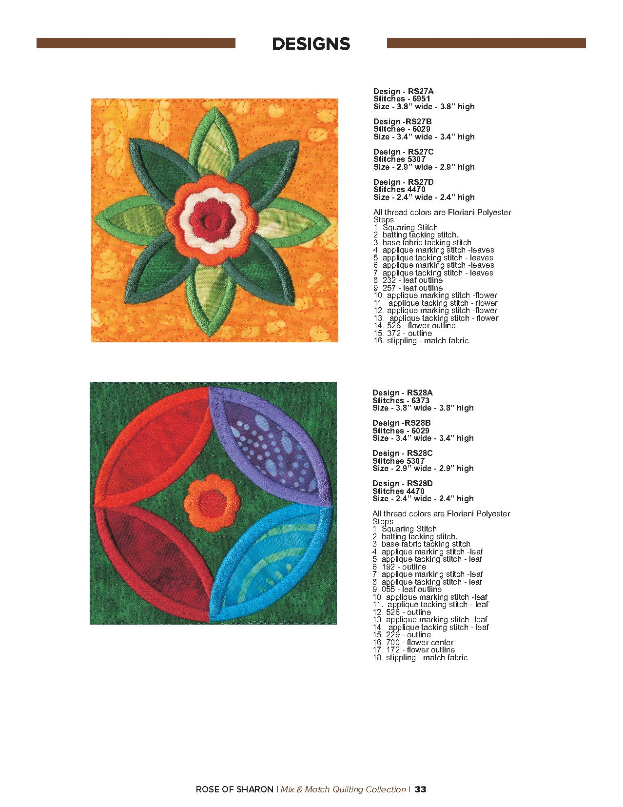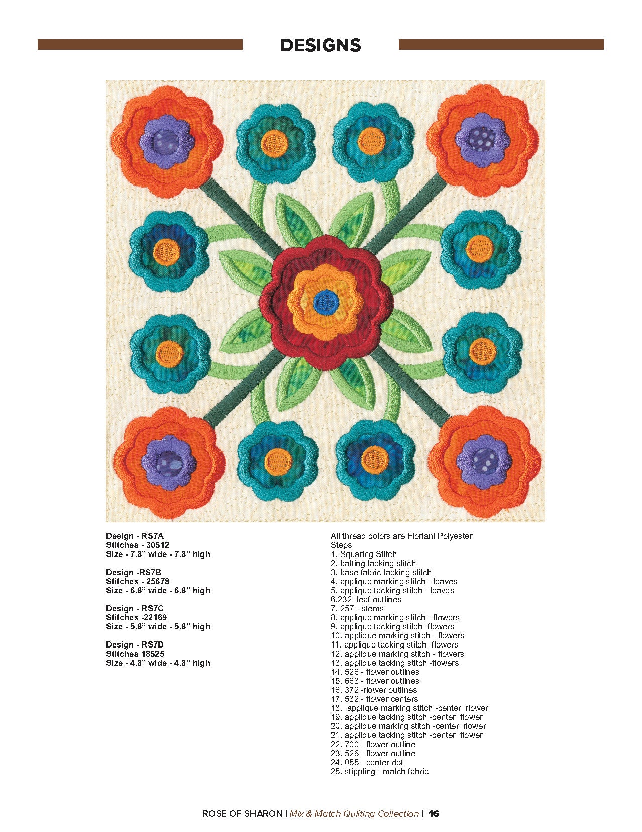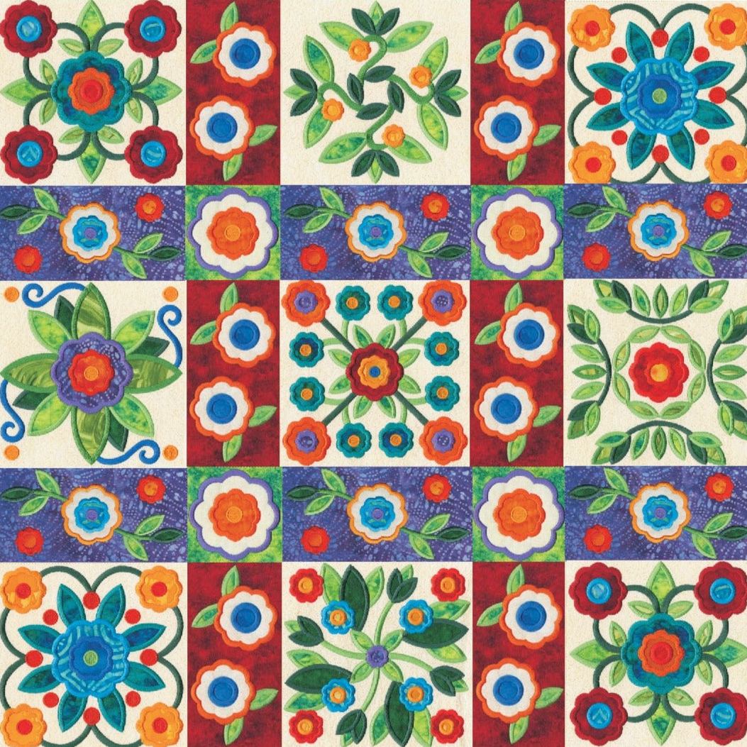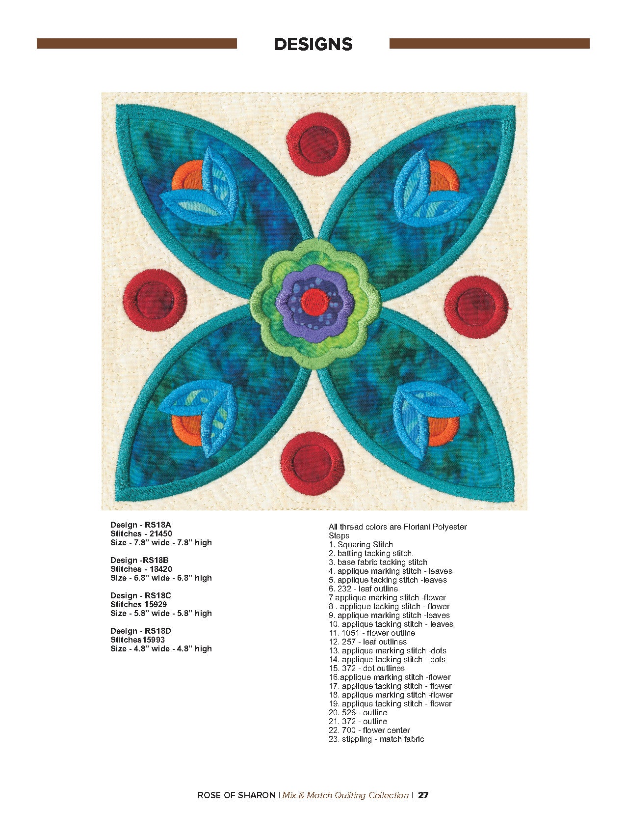 For this “Mix and Match” collection we chose a traditional quilting theme, Rose of Sharon. This type of quilt was typically created by hand using dozens of small applique pieces. The end result was beautiful but very time consuming. Instead of hand piecing and sewing blanket stitches around all of the beautiful leaves and flowers we decided to use machine applique and surround the shapes with stain stitches. The end result is stunning!
