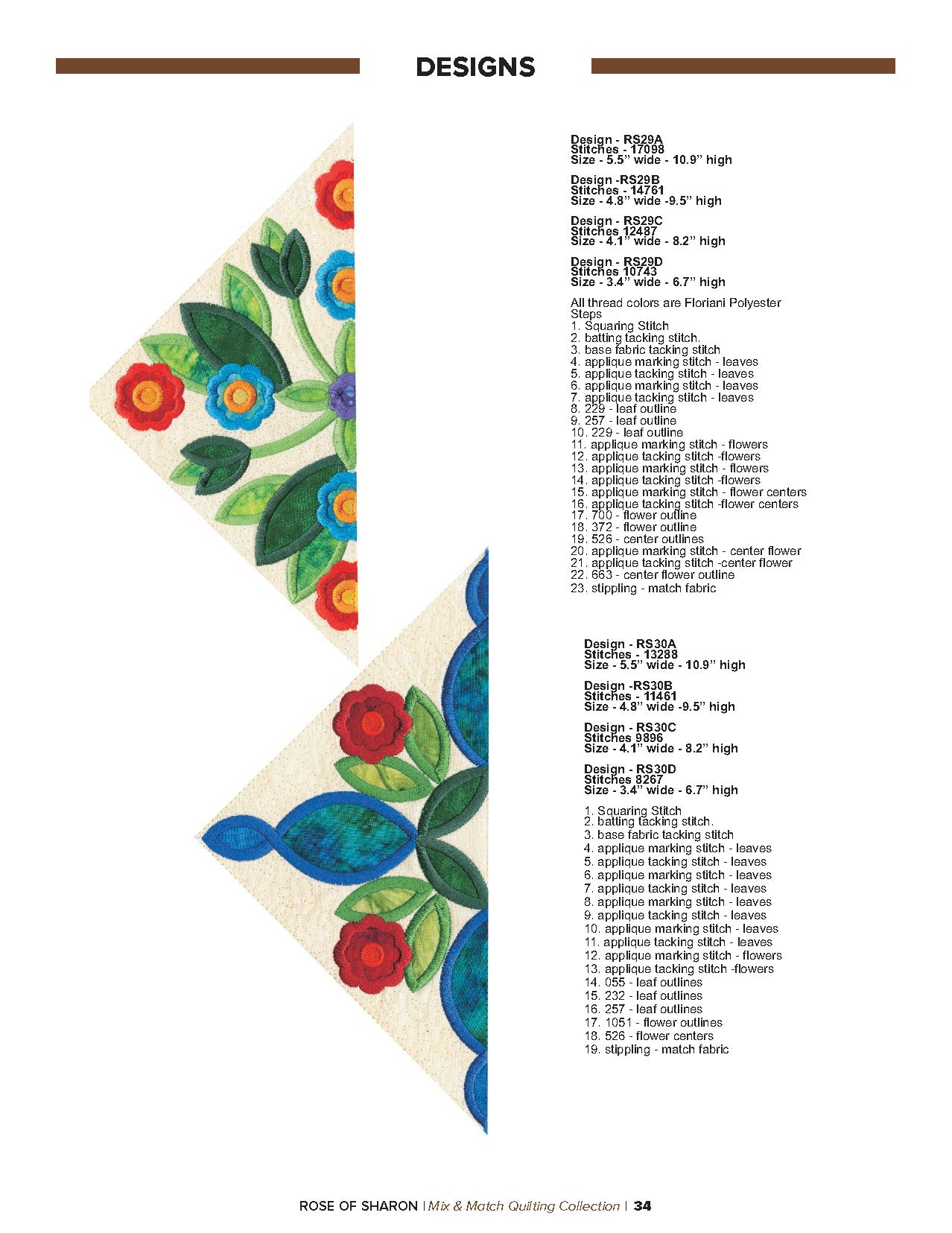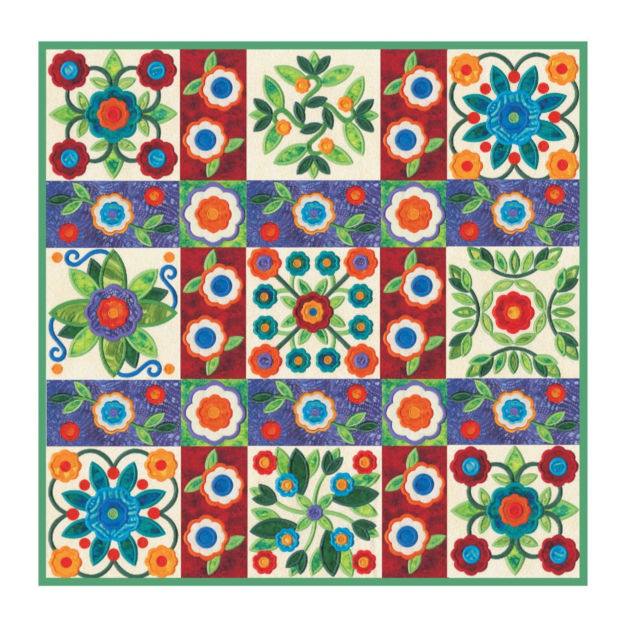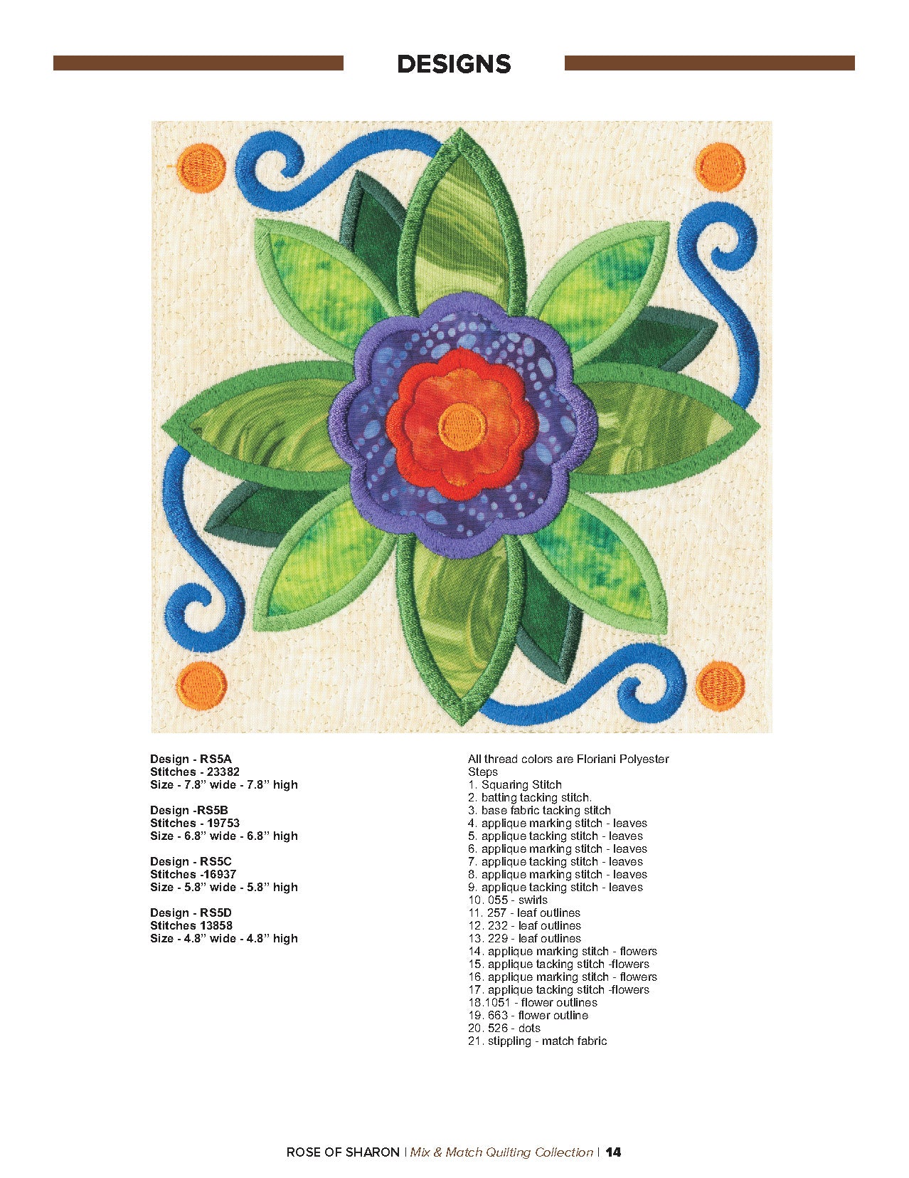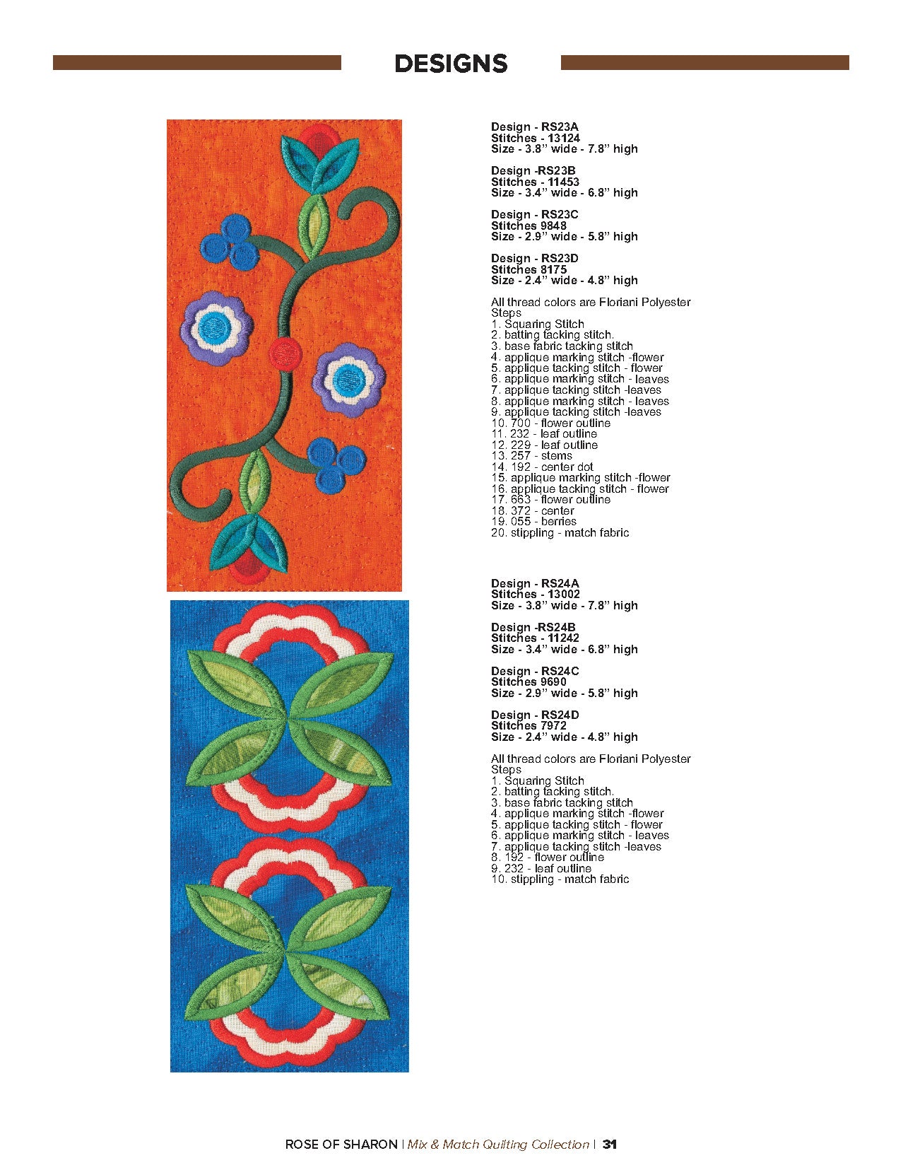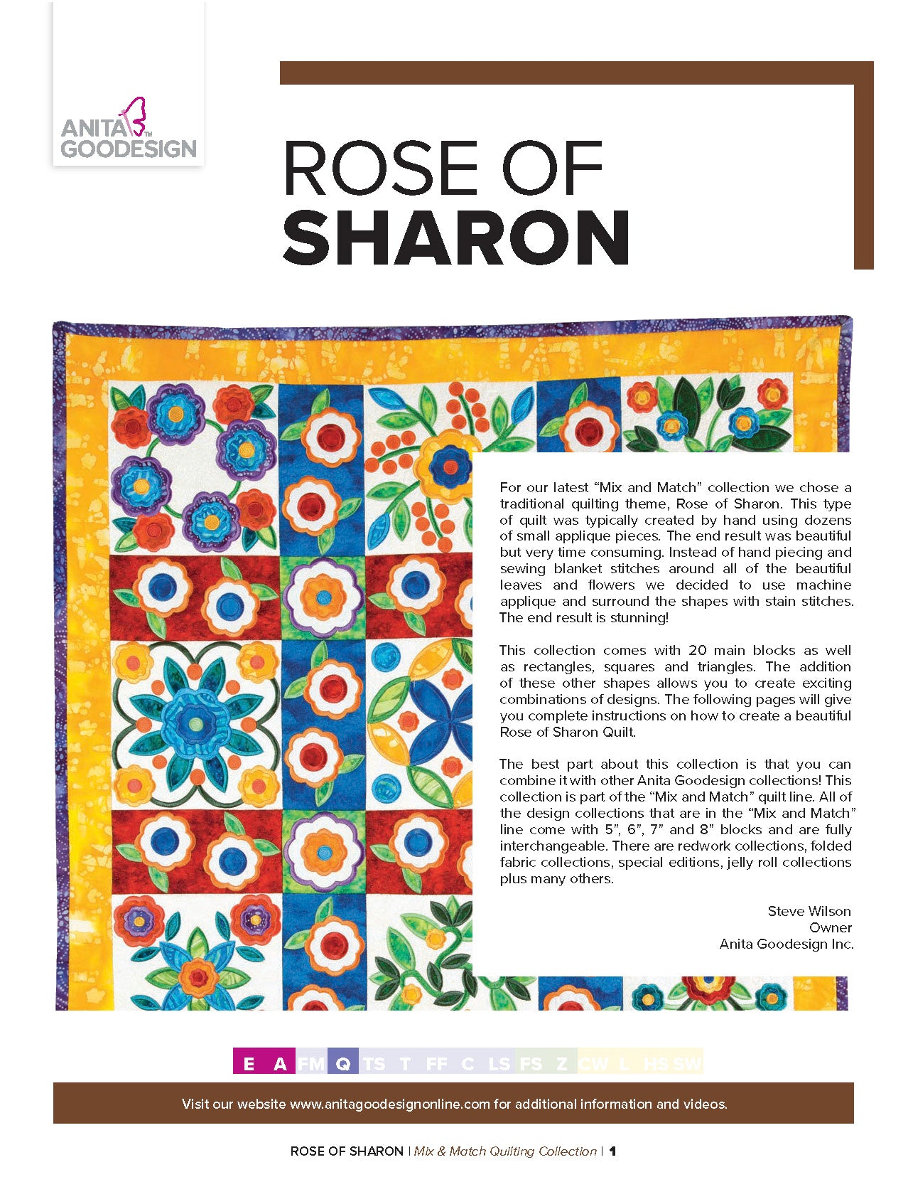 For this “Mix and Match” collection we chose a traditional quilting theme, Rose of Sharon. This type of quilt was typically created by hand using dozens of small applique pieces. The end result was beautiful but very time consuming. Instead of hand piecing and sewing blanket stitches around all of the beautiful leaves and flowers we decided to use machine applique and surround the shapes with stain stitches. The end result is stunning!