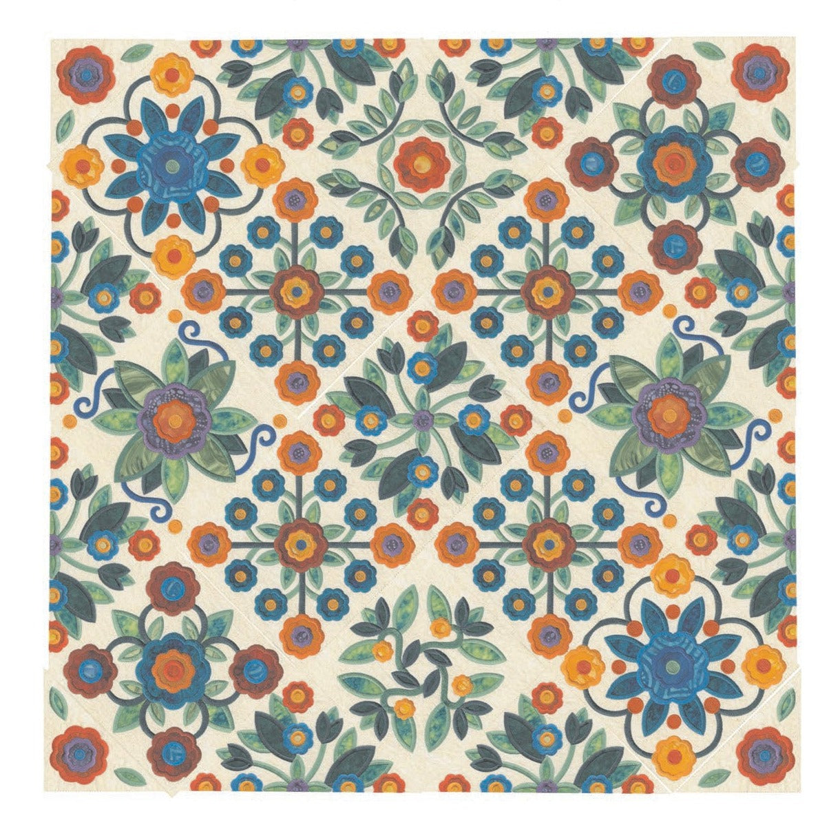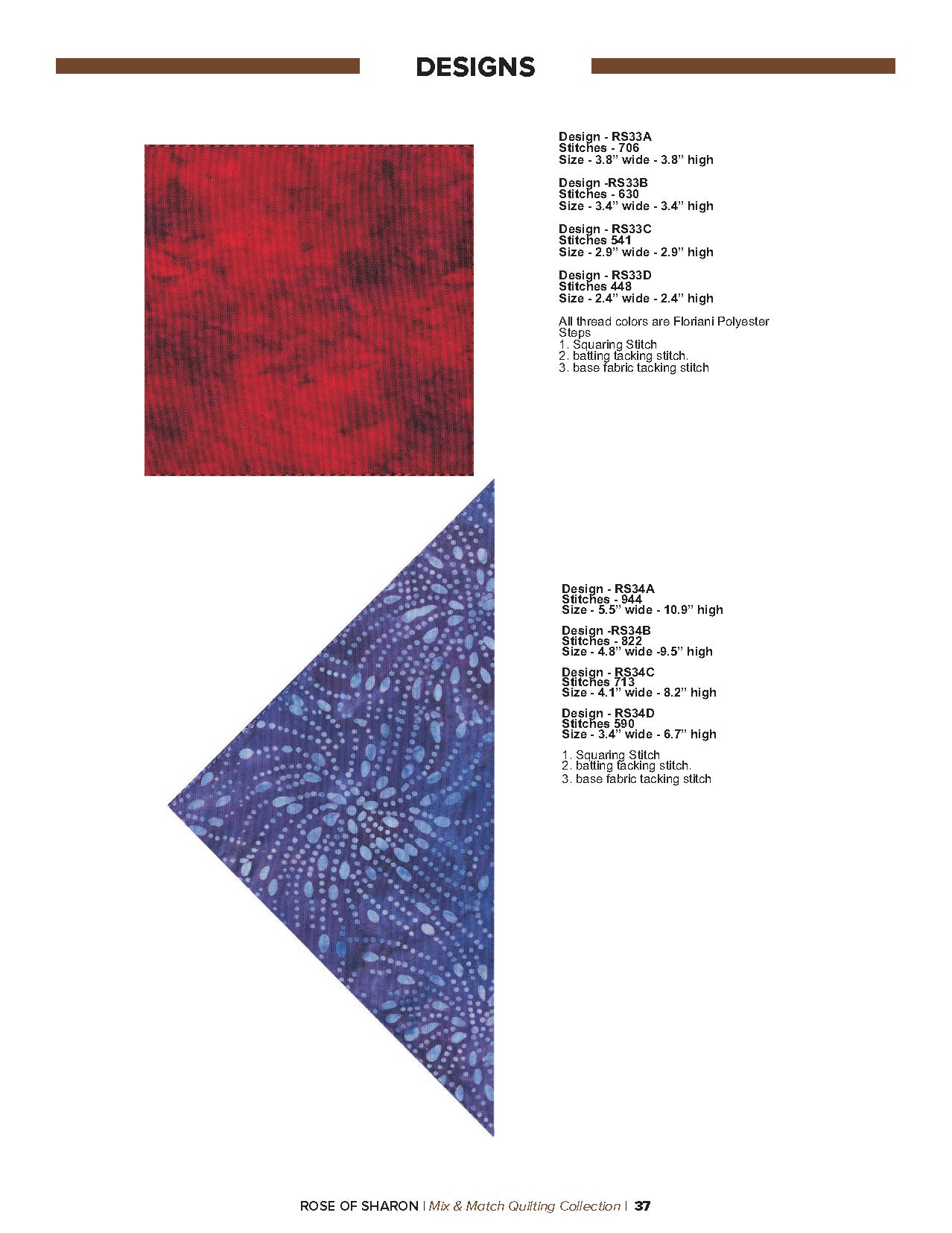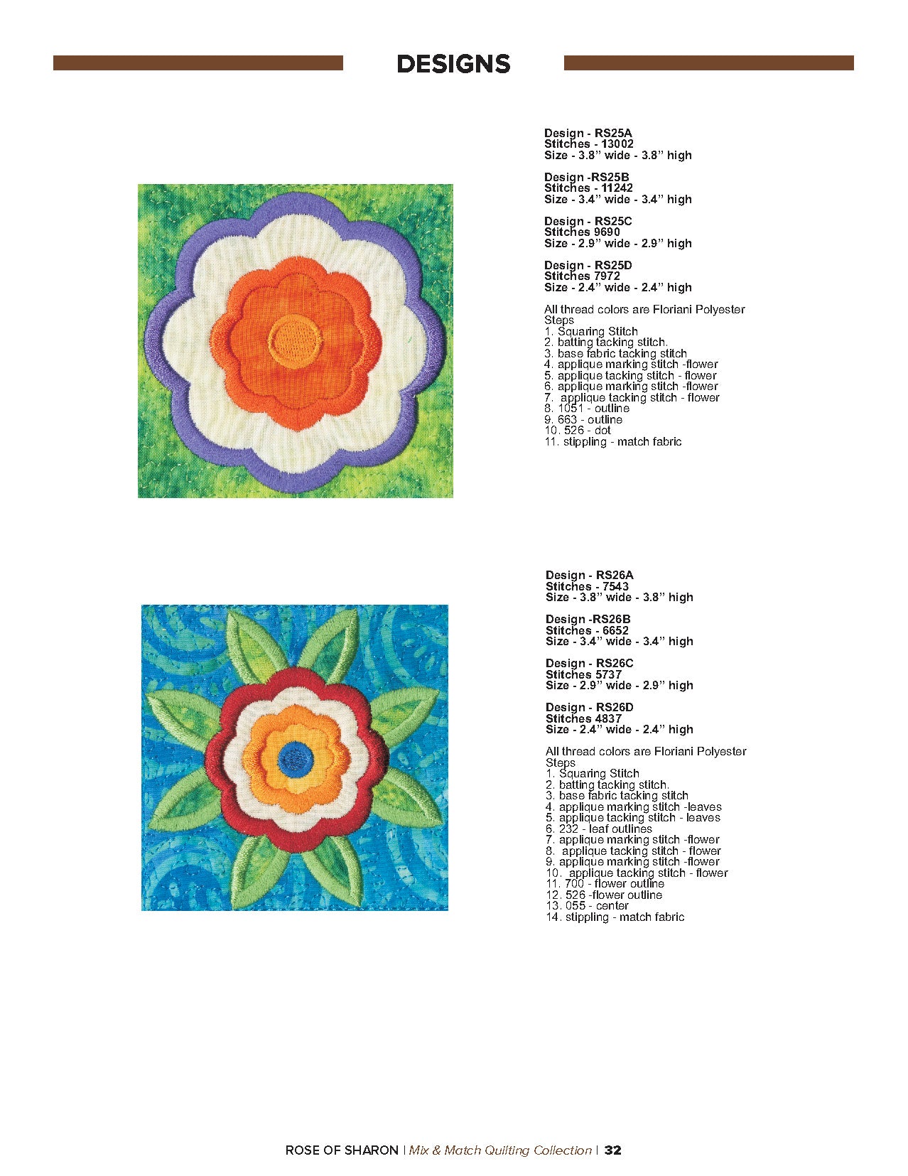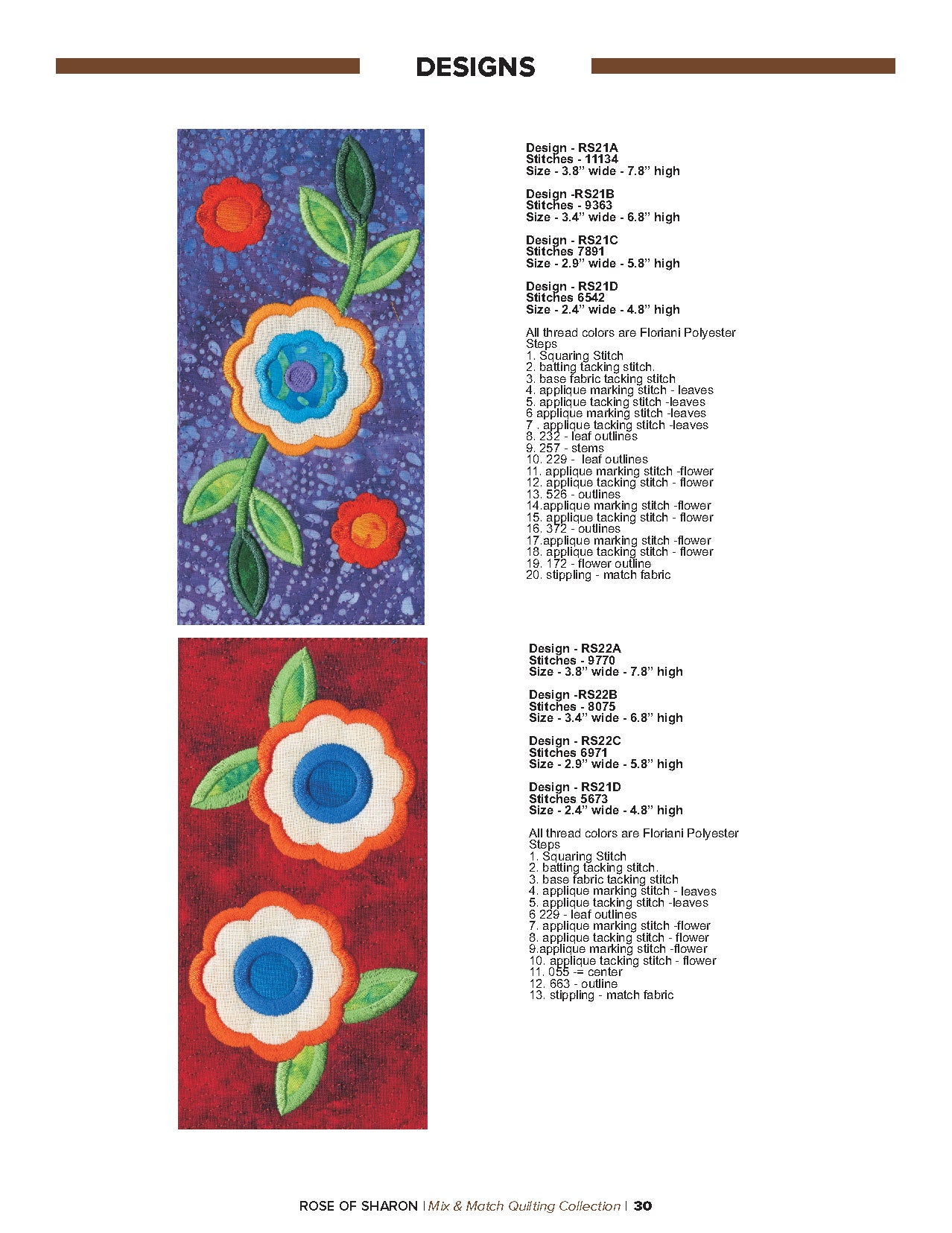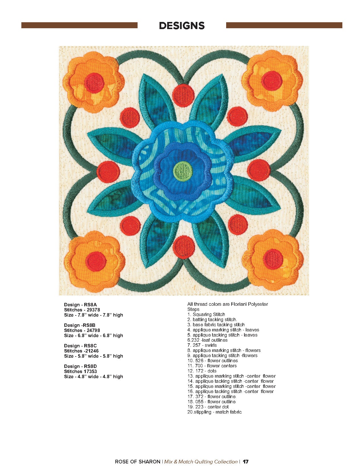 For this “Mix and Match” collection we chose a traditional quilting theme, Rose of Sharon. This type of quilt was typically created by hand using dozens of small applique pieces. The end result was beautiful but very time consuming. Instead of hand piecing and sewing blanket stitches around all of the beautiful leaves and flowers we decided to use machine applique and surround the shapes with stain stitches. The end result is stunning!