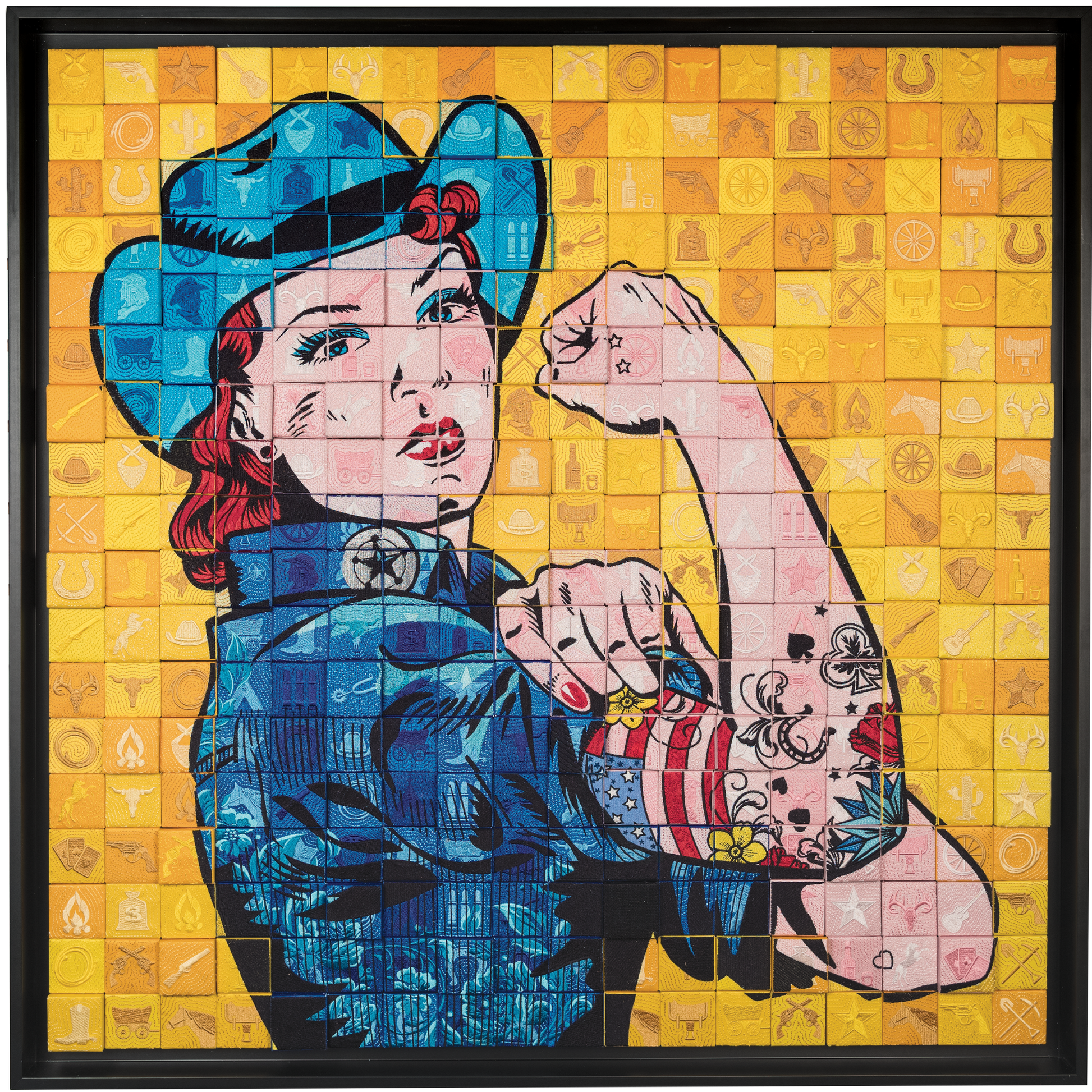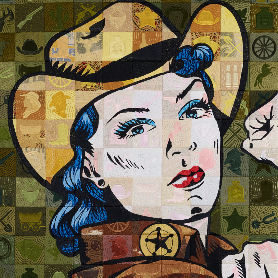 Originally envisioned for the Americana Series years ago, this design was too intricate—until now. I’ve cracked the code, and the result is truly breathtaking! This stunning piece features 224 meticulously embroidered and stitched quilt blocks arranged to create a mesmerizing tiled scene. Crafted with vintage, recycled fabrics, it radiates nostalgic charm and timeless appeal.