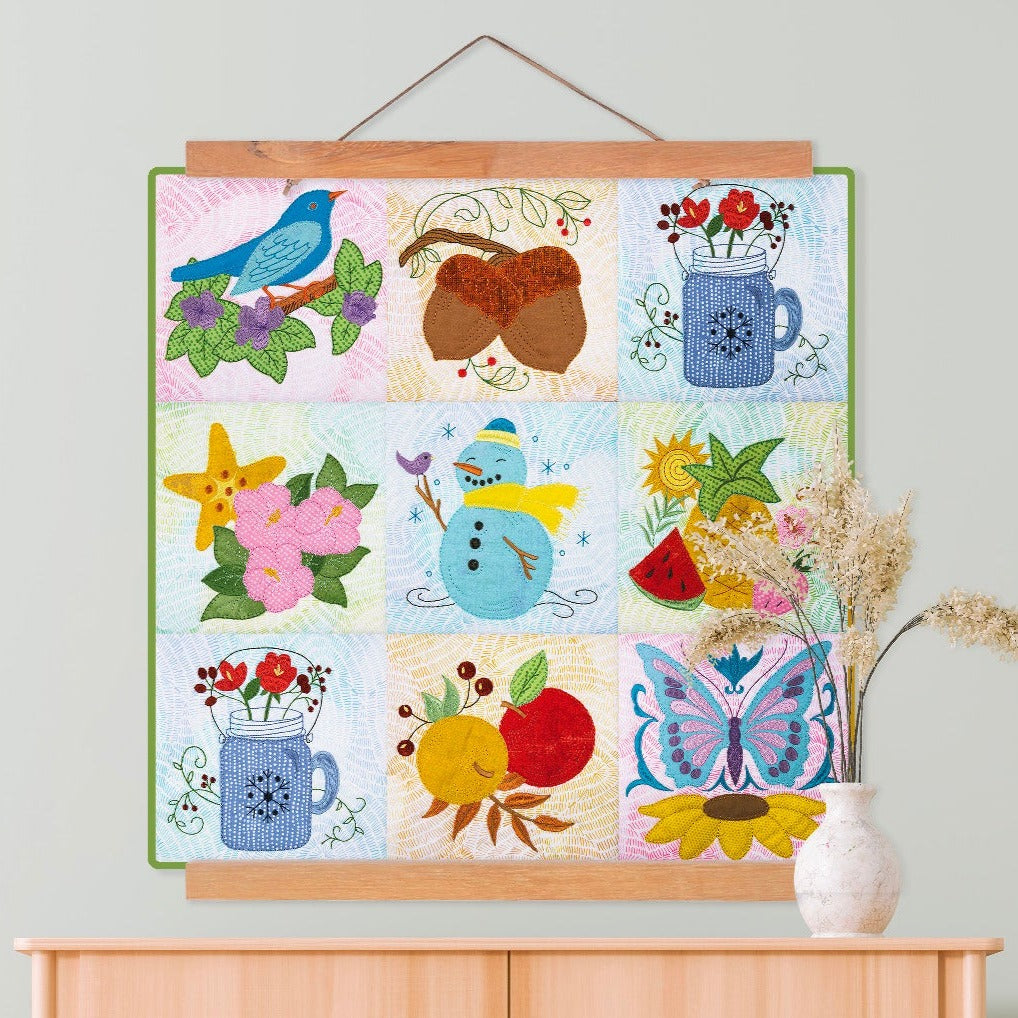 We've carefully selected traditional imagery for each season, ensuring that the essence of spring, summer, autumn, and winter shines through. Delicate flowers and graceful butterflies symbolize the rejuvenation of spring, while vibrant apples and rustic acorns evoke the cozy charm of autumn. Each block is meticulously crafted with appliqué and satin stitches, creating bold and vibrant areas of color.