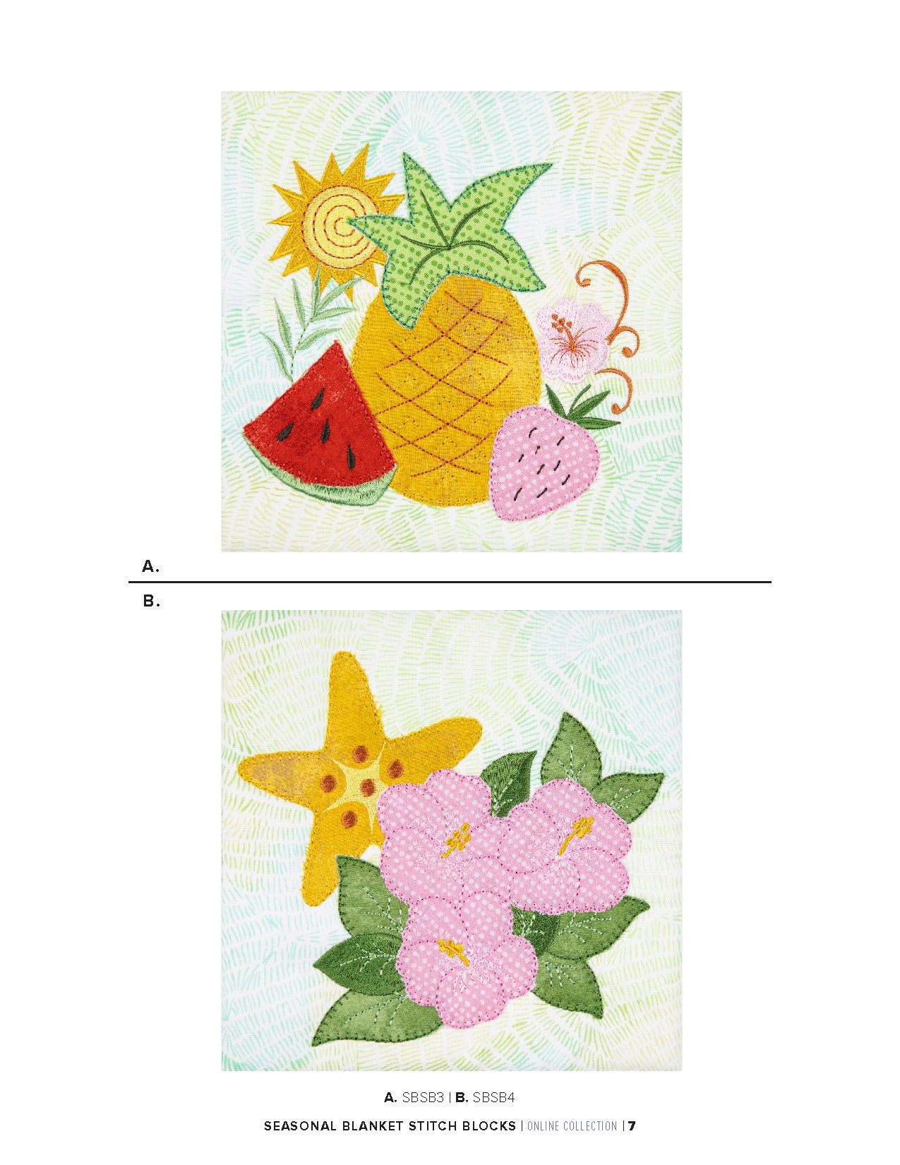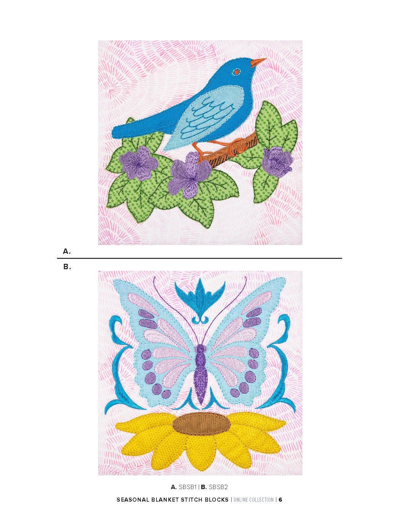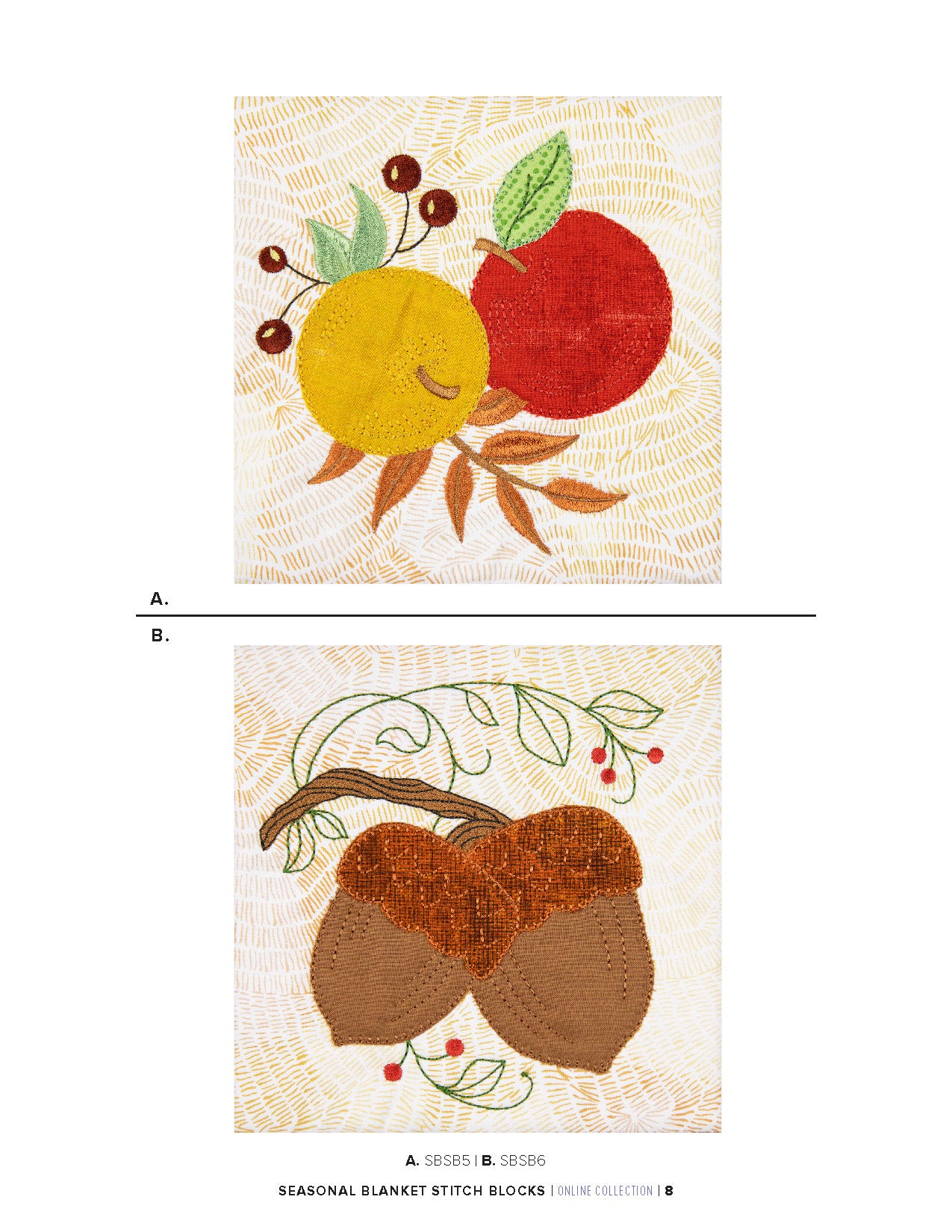 What sets these blocks apart is the blanket stitch technique that beautifully finishes the appliqué edges, giving them an exquisite hand-embroidered appearance.