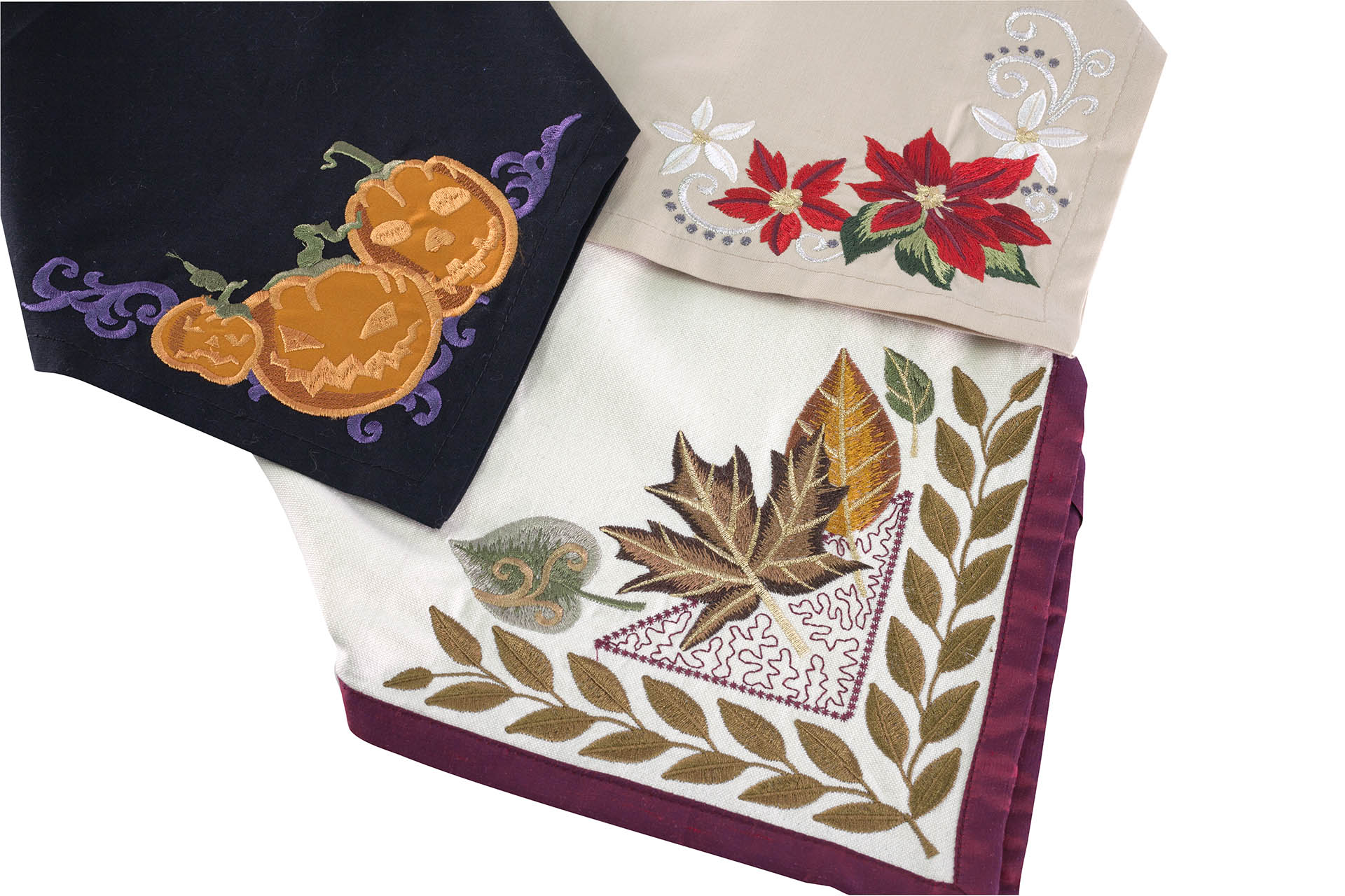 We have released Napkin Corners and Christmas Napkin Corners, but this is the first time we’ve released a Seasonal Napkin Corners collection. This is a Projects Collection with a design for every season. With so many options, you’ll want to throw a dinner party every month! Choose between Halloween pumpkins, Easter bunnies and eggs, or spice it up with our fiesta design! Be sure to check out the Seasonal Corners and Borders collection to receive matching designs to spruce up tablecloths as well. By having both collections you’ll be able to create a table masterpiece! All of the napkin corner designs have a corner and border that matches in order to create a spectacular spread for your dinning table. Visit our website www. anitagoodesignonline.com for additional information and videos.