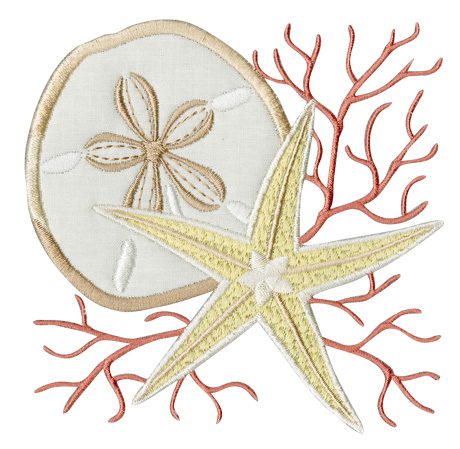 This dynamic duo design features two iconic beach motifs: the sand dollar and starfish. To make it even better, we have added a hint of pink coral behind them. Choose a white, cream, or tan appliqué fabric for the sand dollar, then create the rest of the design with embroidery threads.