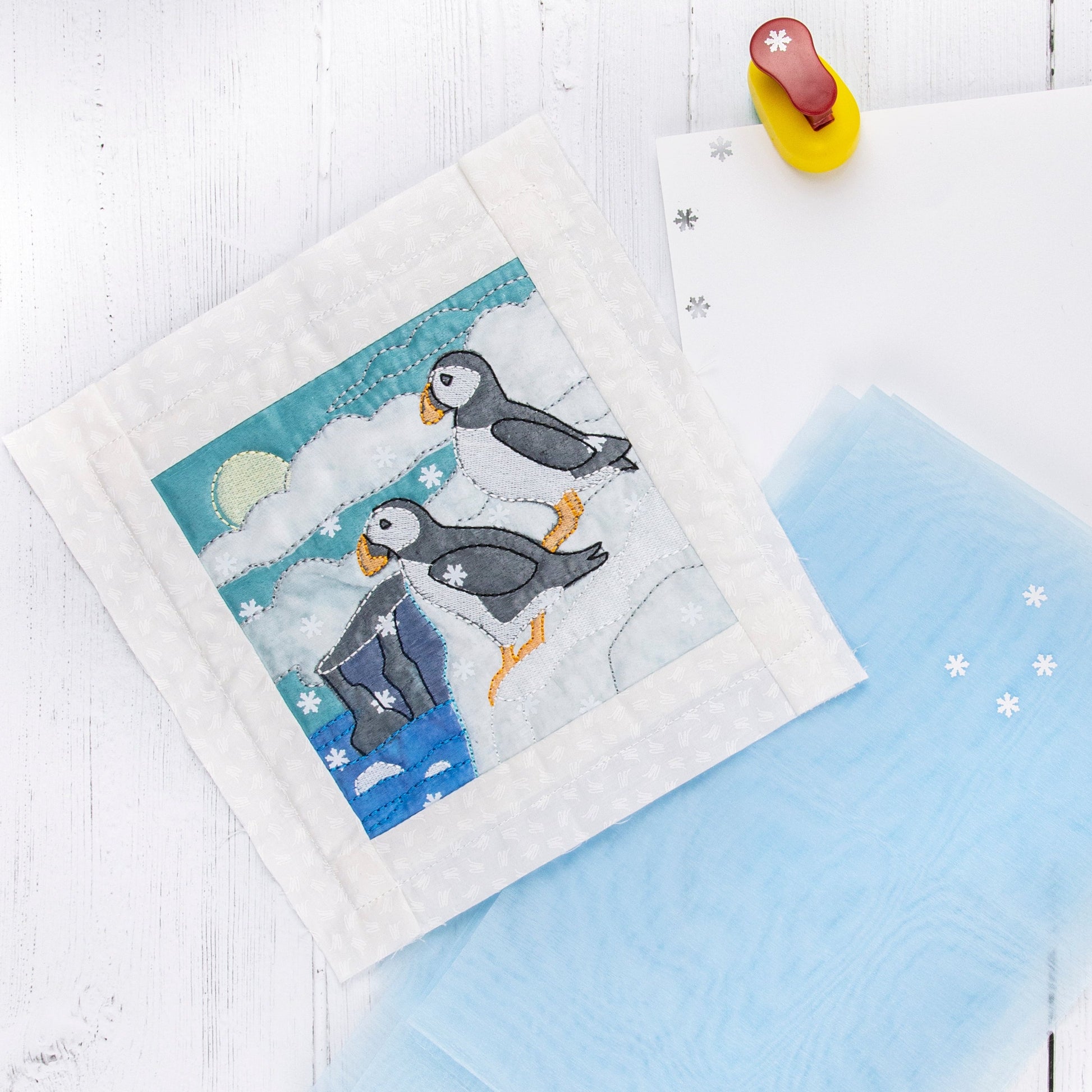 Experience the whimsical beauty of falling snow with our unique quilt blocks from the Snowy Confetti Quilt collection. To achieve the enchanting effect of snowfall, we have incorporated a delightful technique using a snowflake-shaped paper punch. By punching delicate snowflakes out of paper, you can create a charming confetti-like effect that adds a touch of magic to each quilt block.