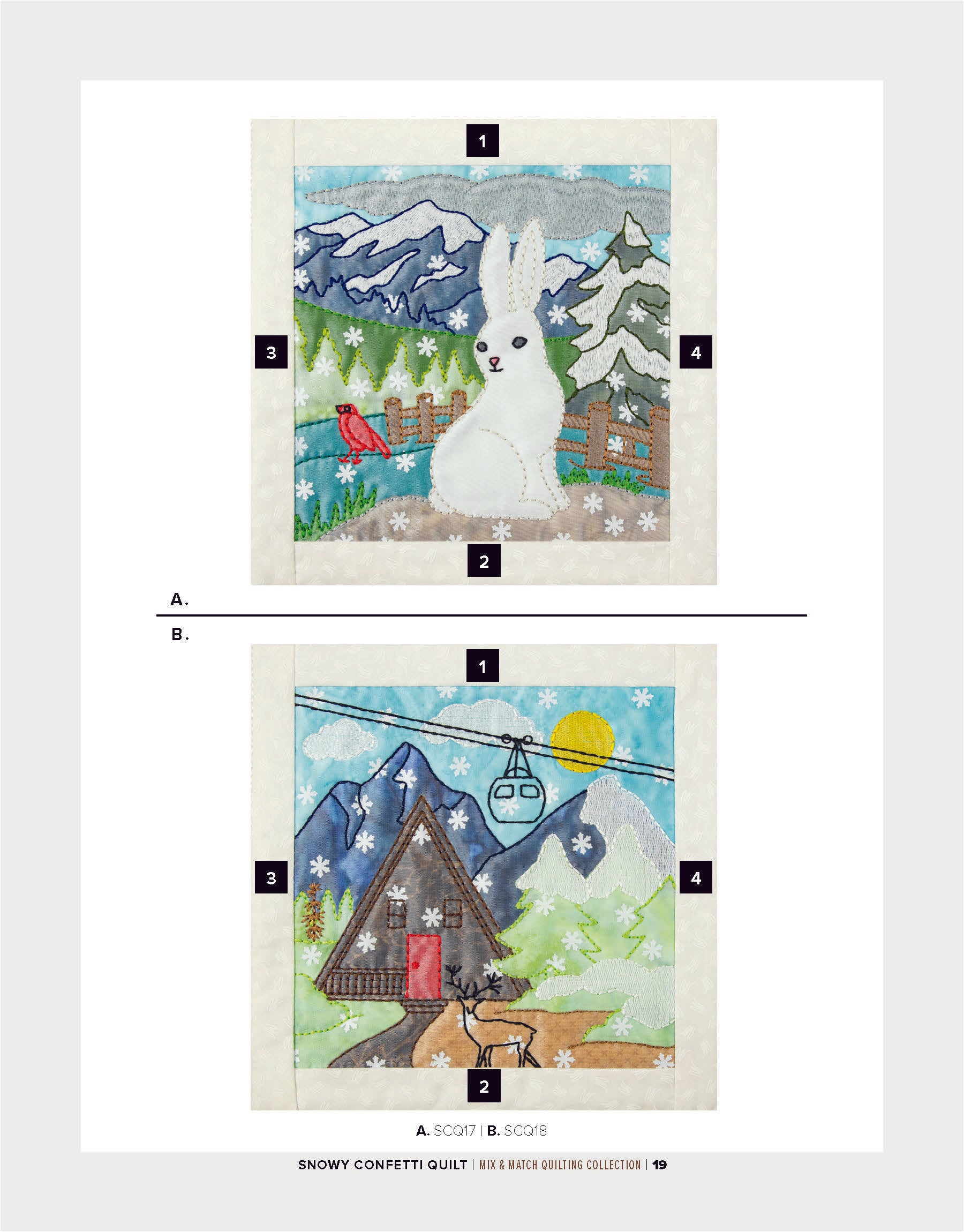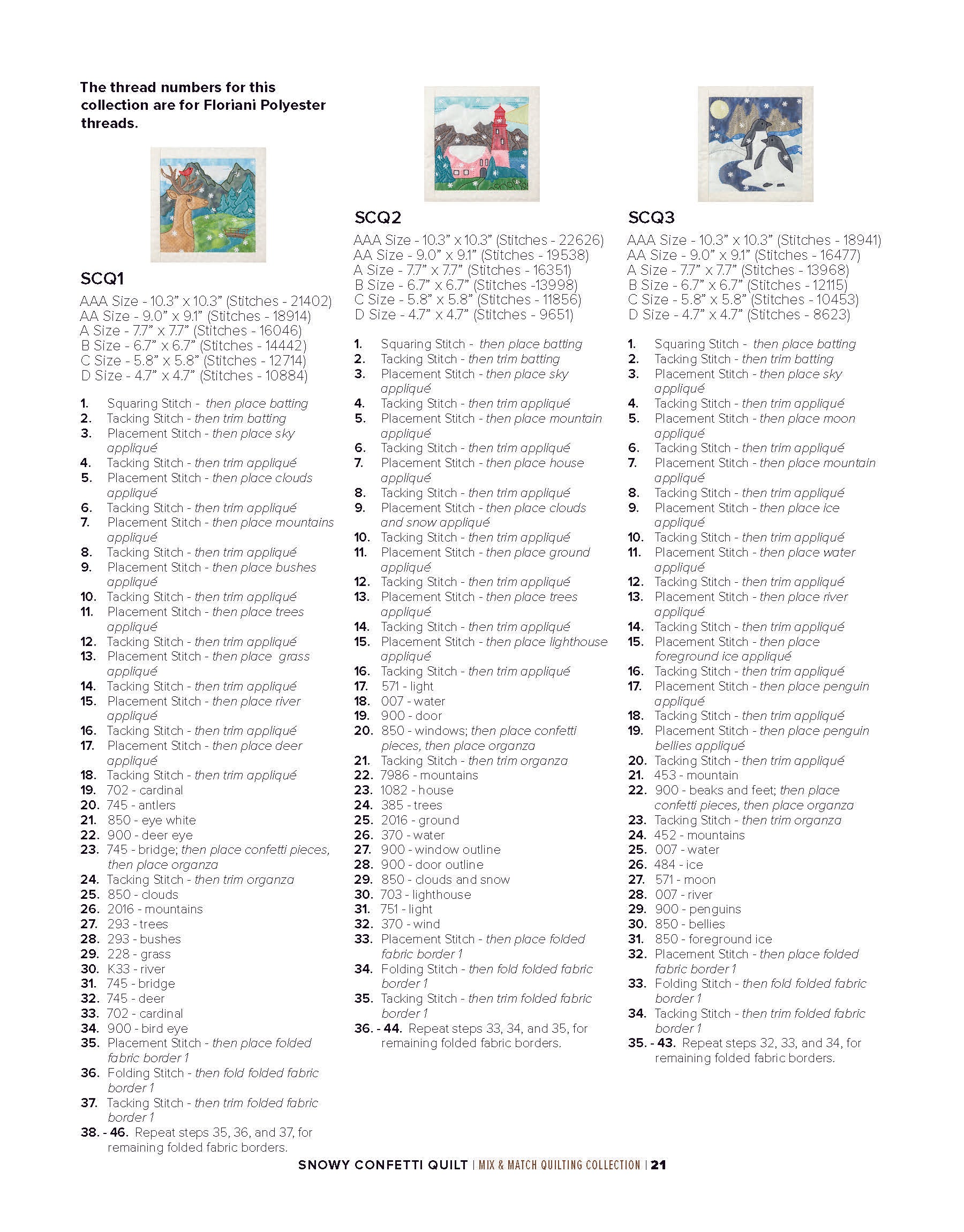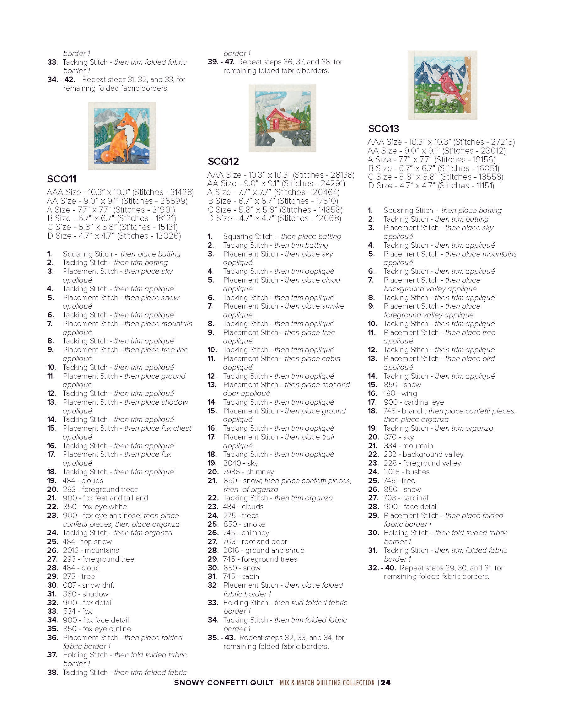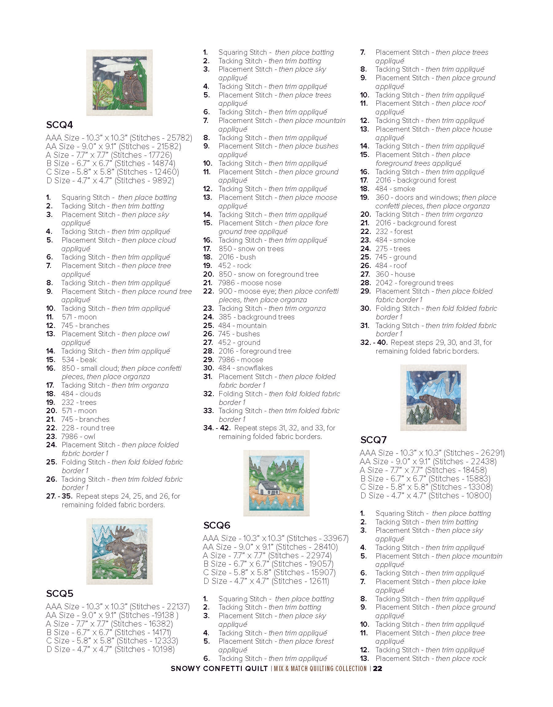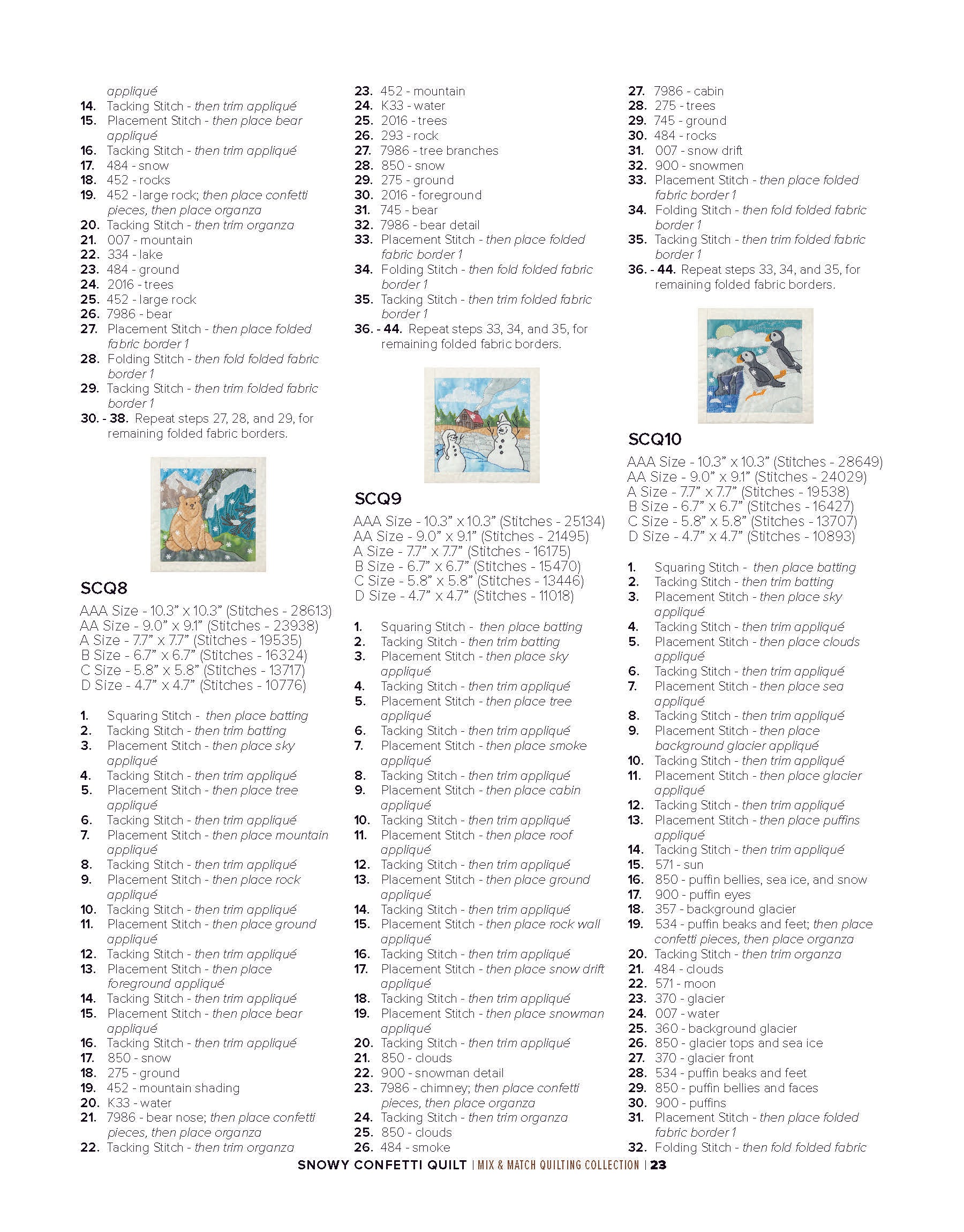 To enhance the wintry ambiance of the quilt blocks, a layer of sheer organza is incorporated. Not only does the organza provide an icy finish, but it also acts as a clever way to secure the snowflake confetti in place within the blocks. The detailed bean stitches atop the organza further accentuate the underlying appliqué shapes, resulting in a mesmerizing winter wonderland.