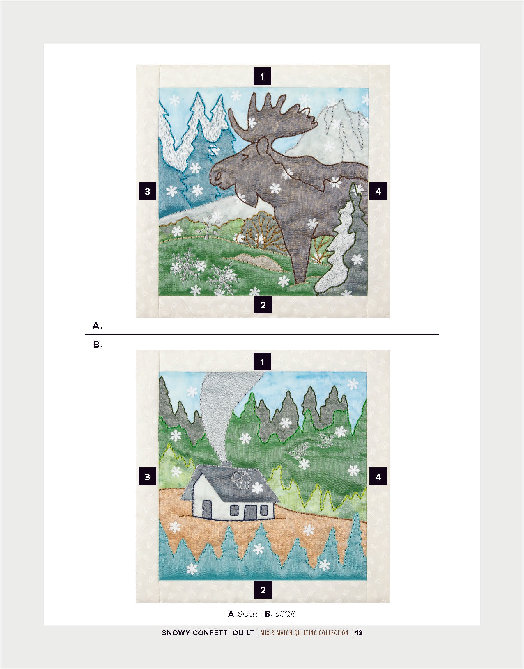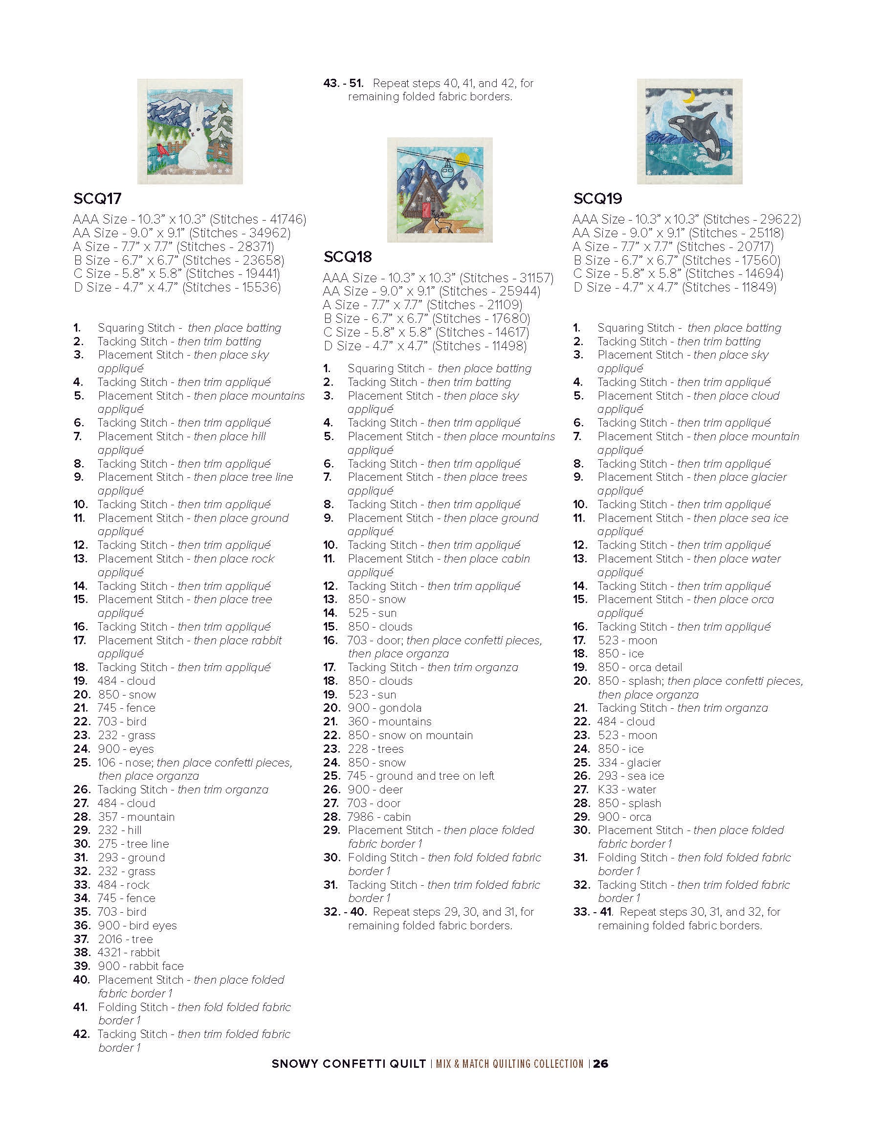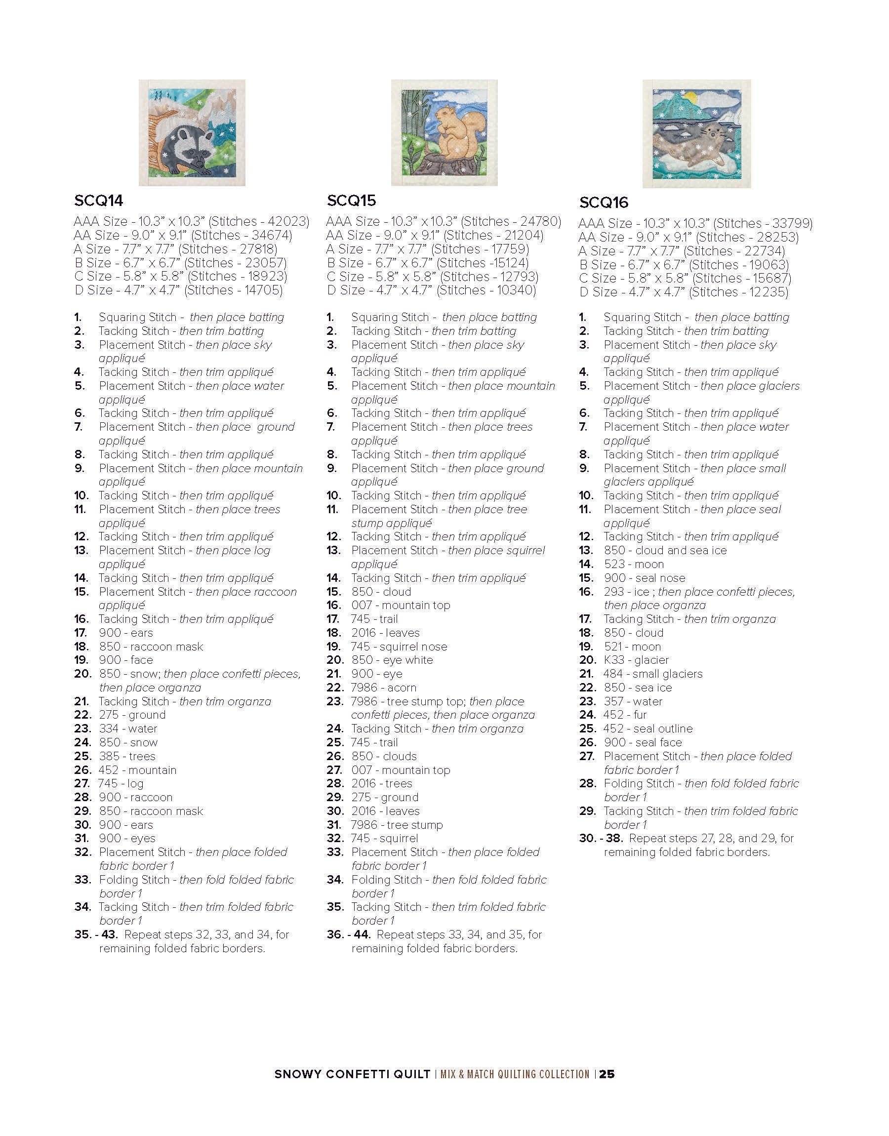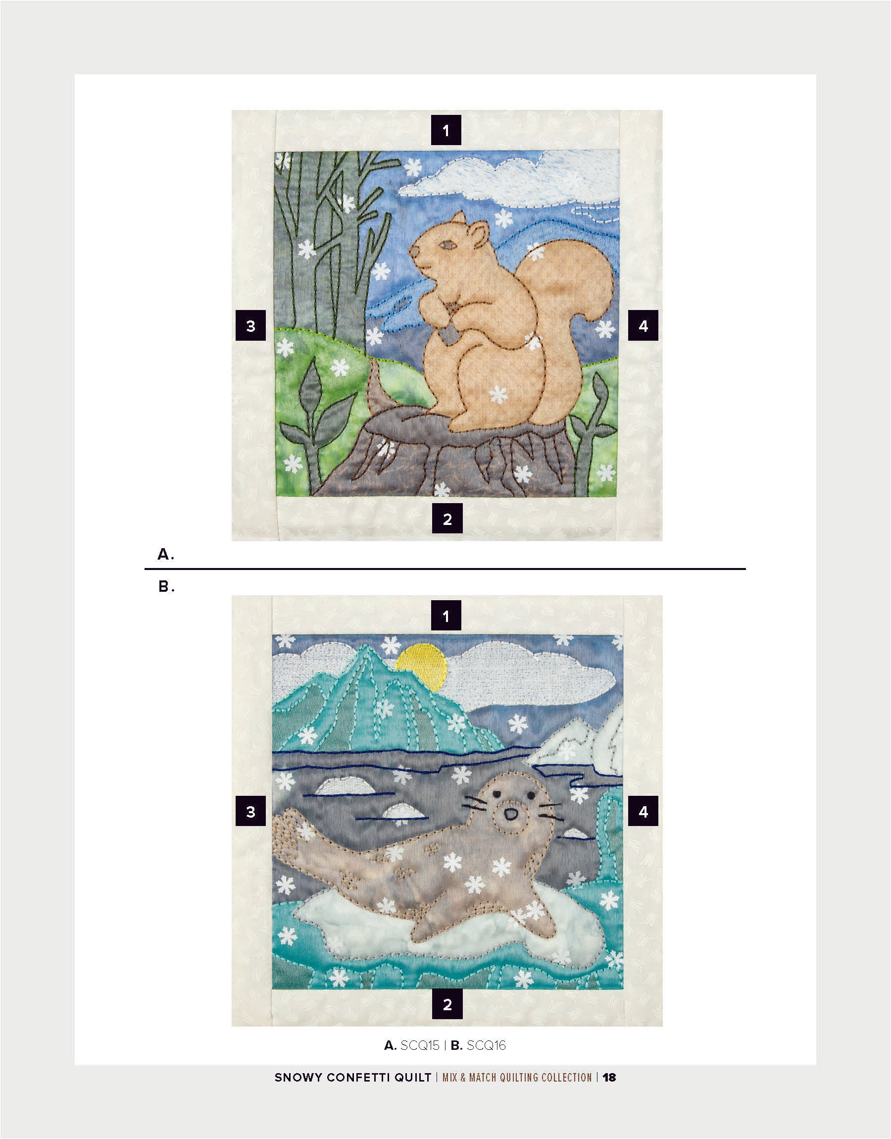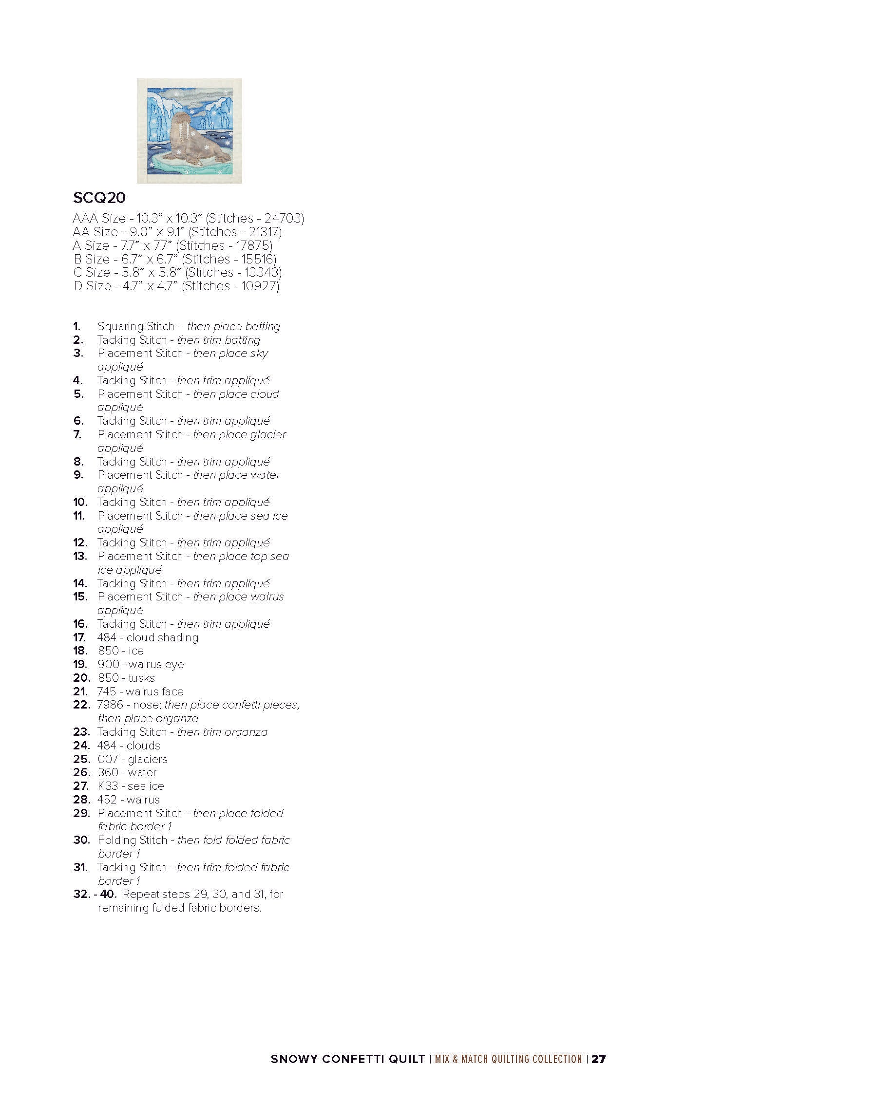 To enhance the wintry ambiance of the quilt blocks, a layer of sheer organza is incorporated. Not only does the organza provide an icy finish, but it also acts as a clever way to secure the snowflake confetti in place within the blocks. The detailed bean stitches atop the organza further accentuate the underlying appliqué shapes, resulting in a mesmerizing winter wonderland.