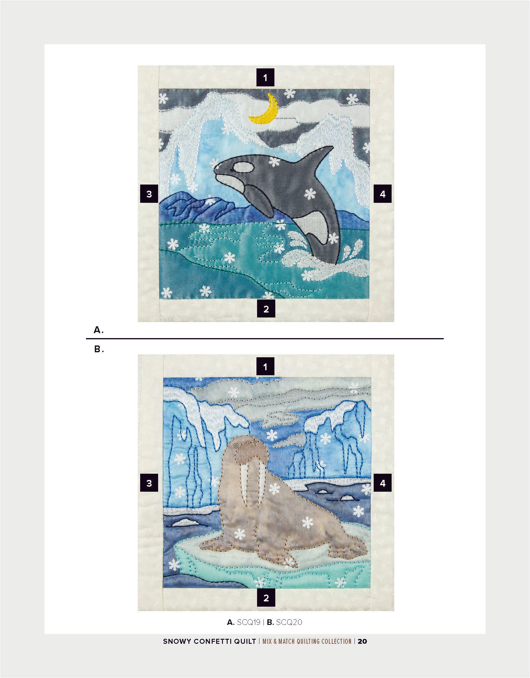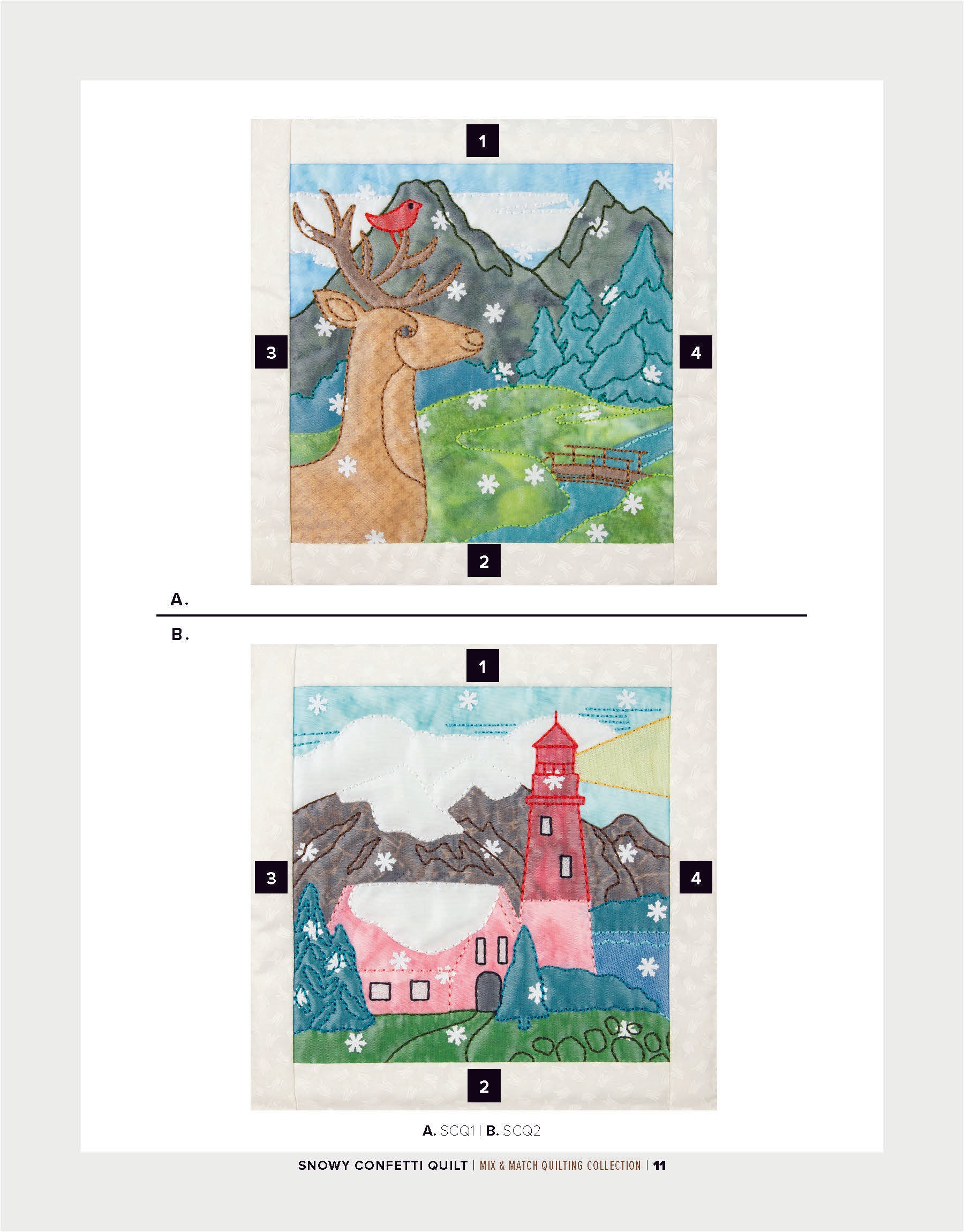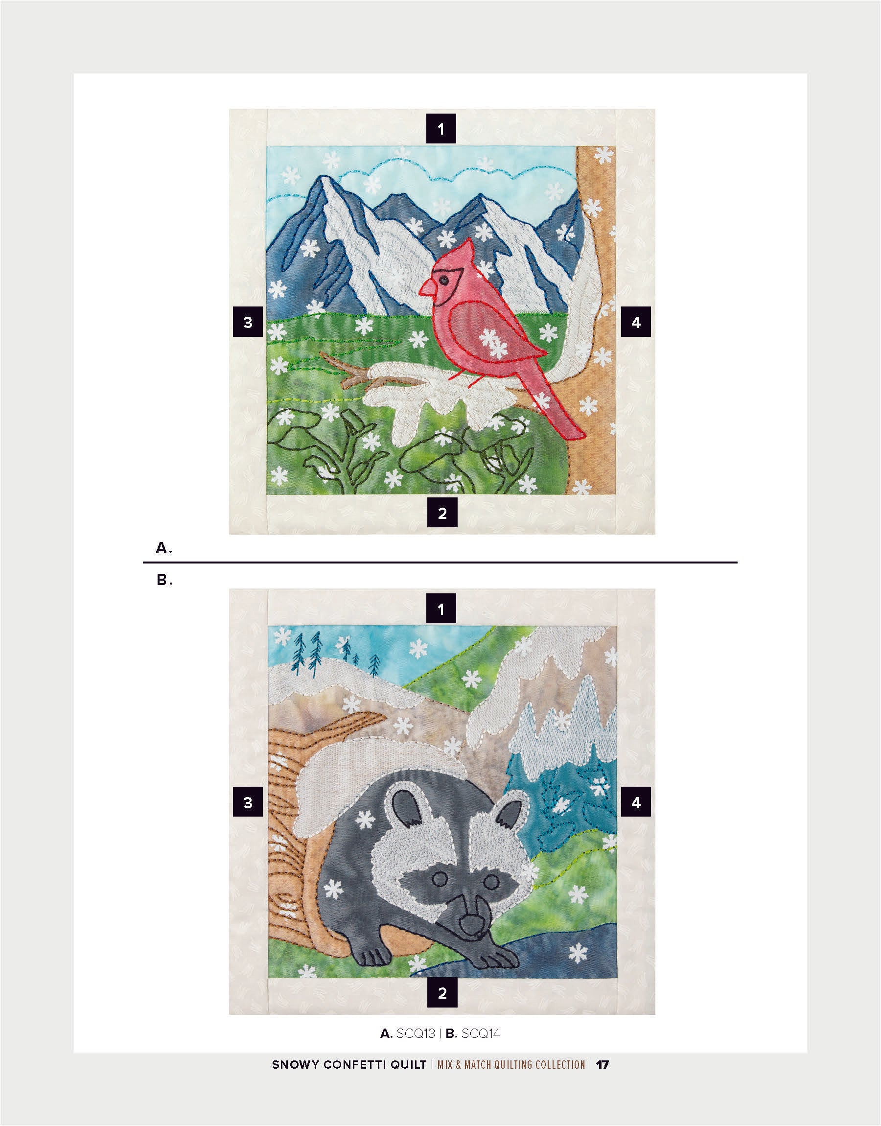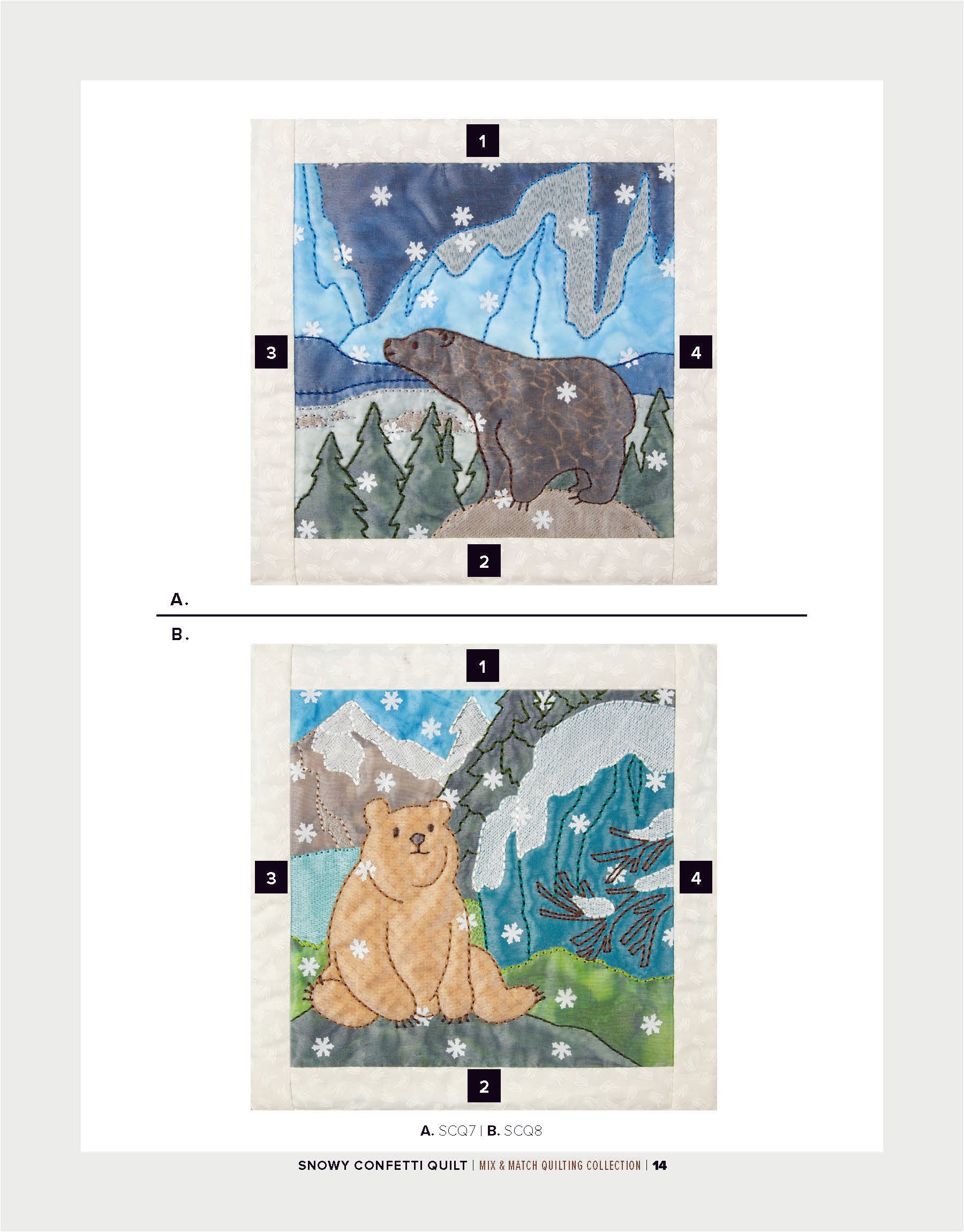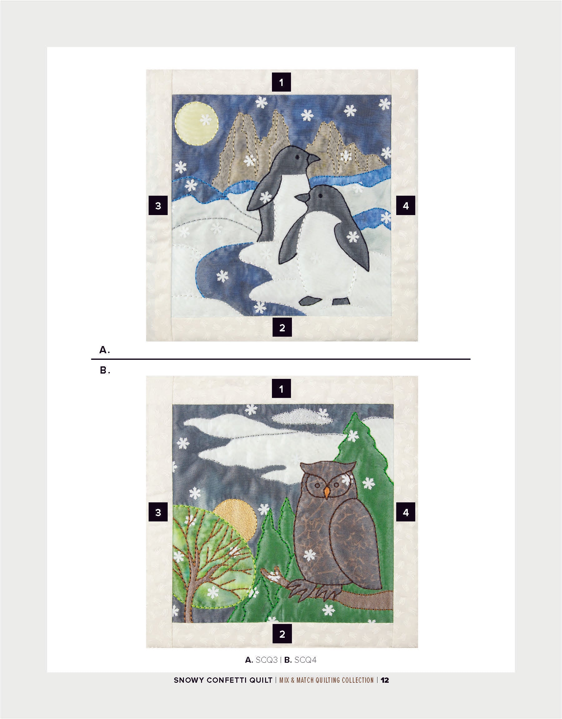 To enhance the wintry ambiance of the quilt blocks, a layer of sheer organza is incorporated. Not only does the organza provide an icy finish, but it also acts as a clever way to secure the snowflake confetti in place within the blocks. The detailed bean stitches atop the organza further accentuate the underlying appliqué shapes, resulting in a mesmerizing winter wonderland.