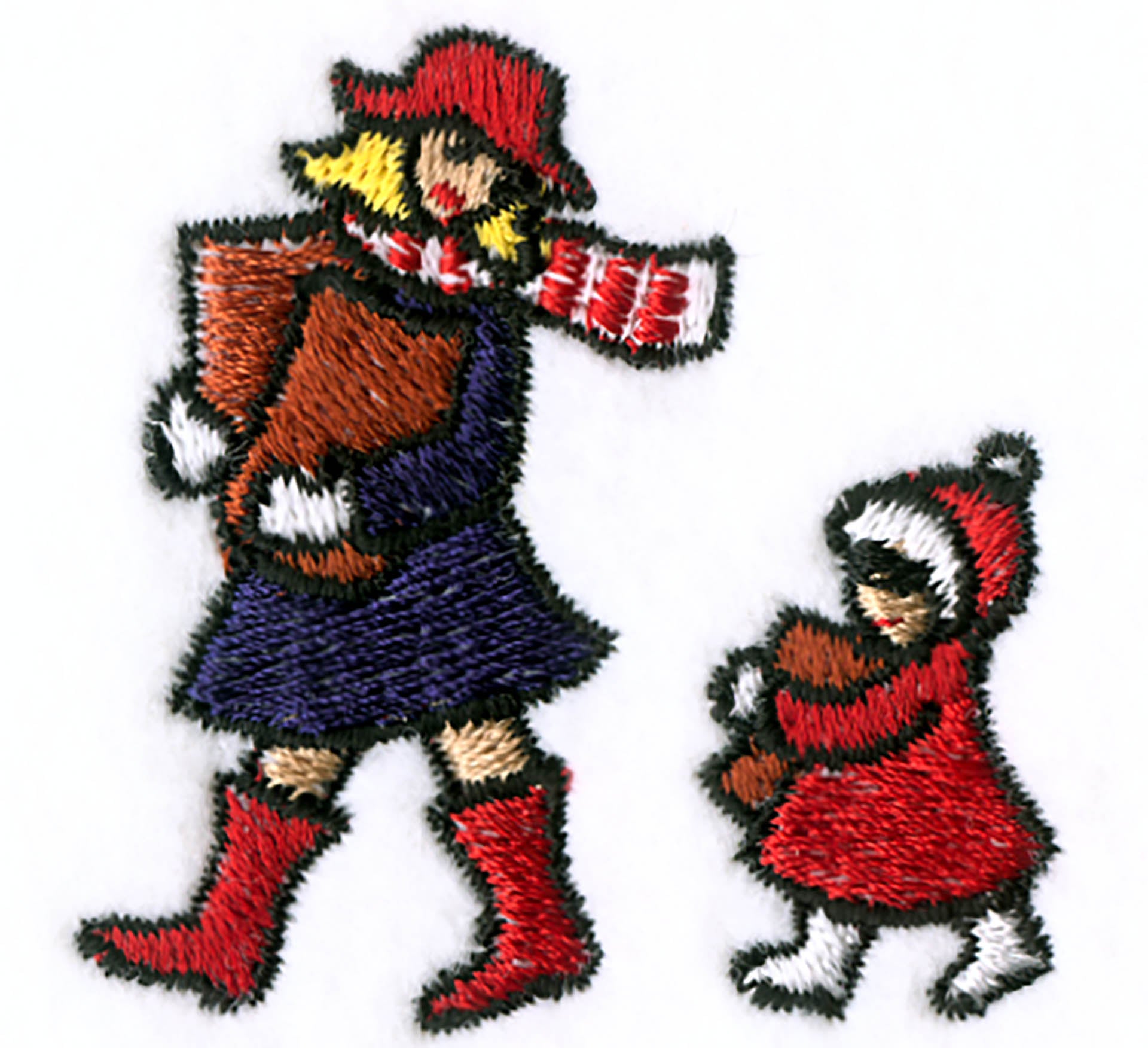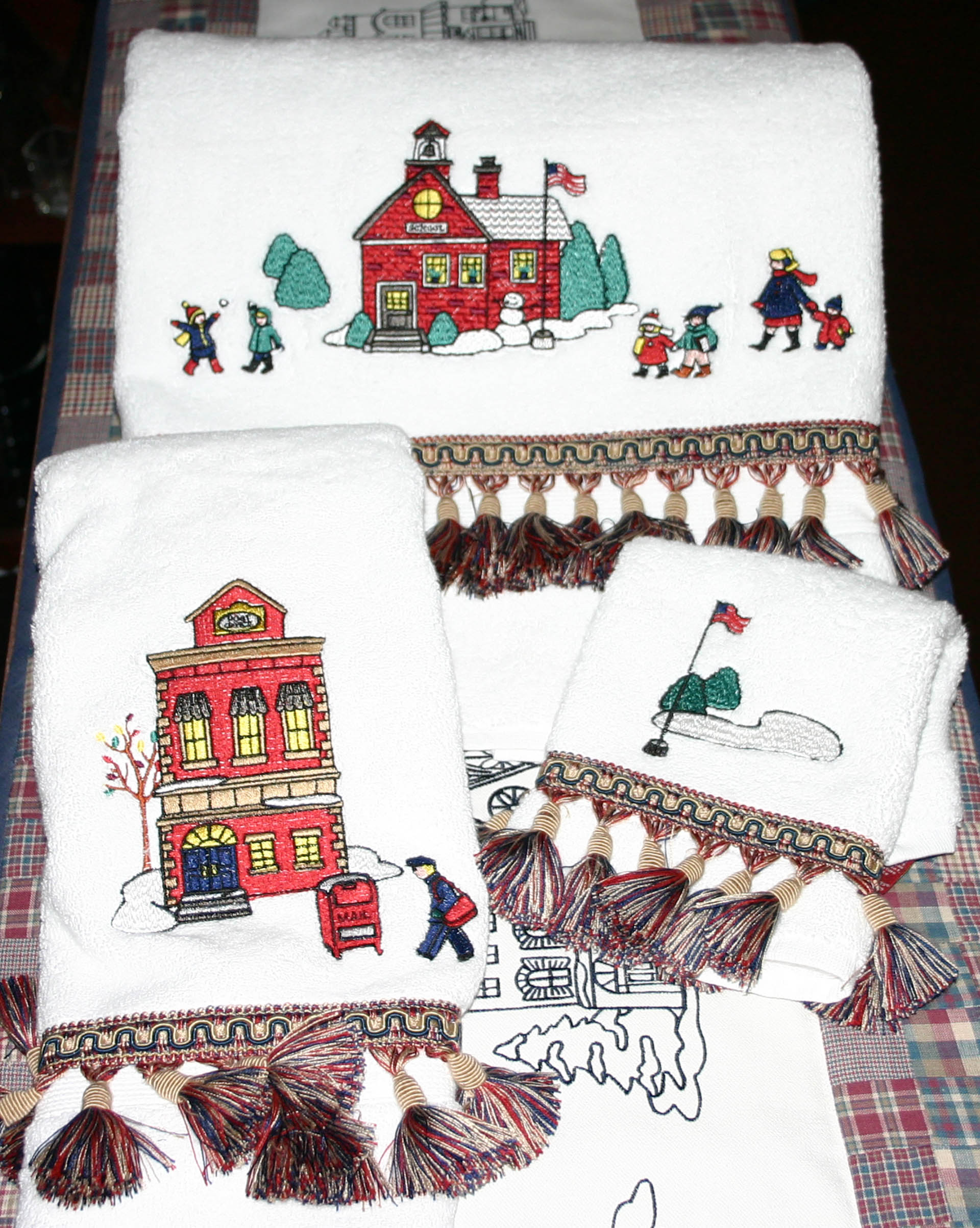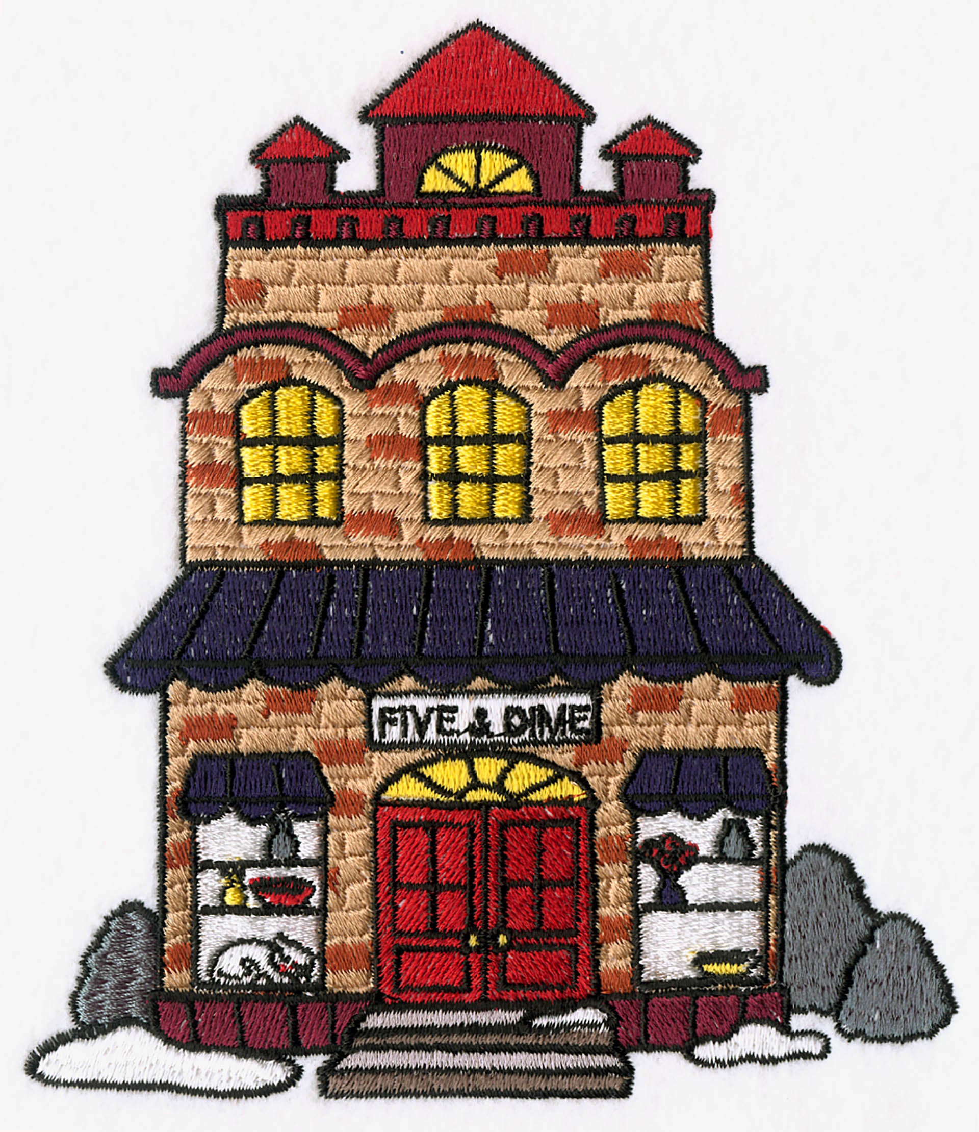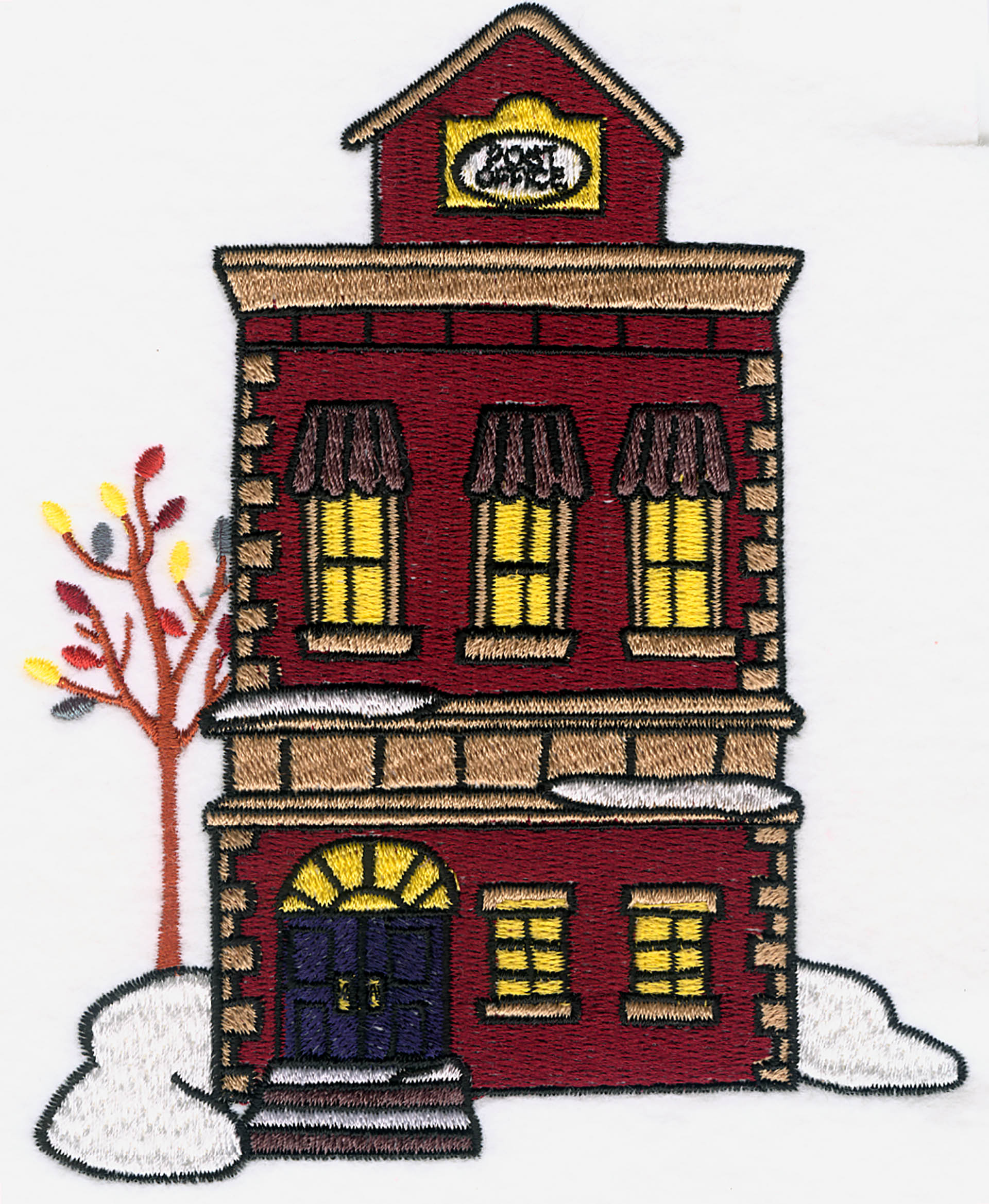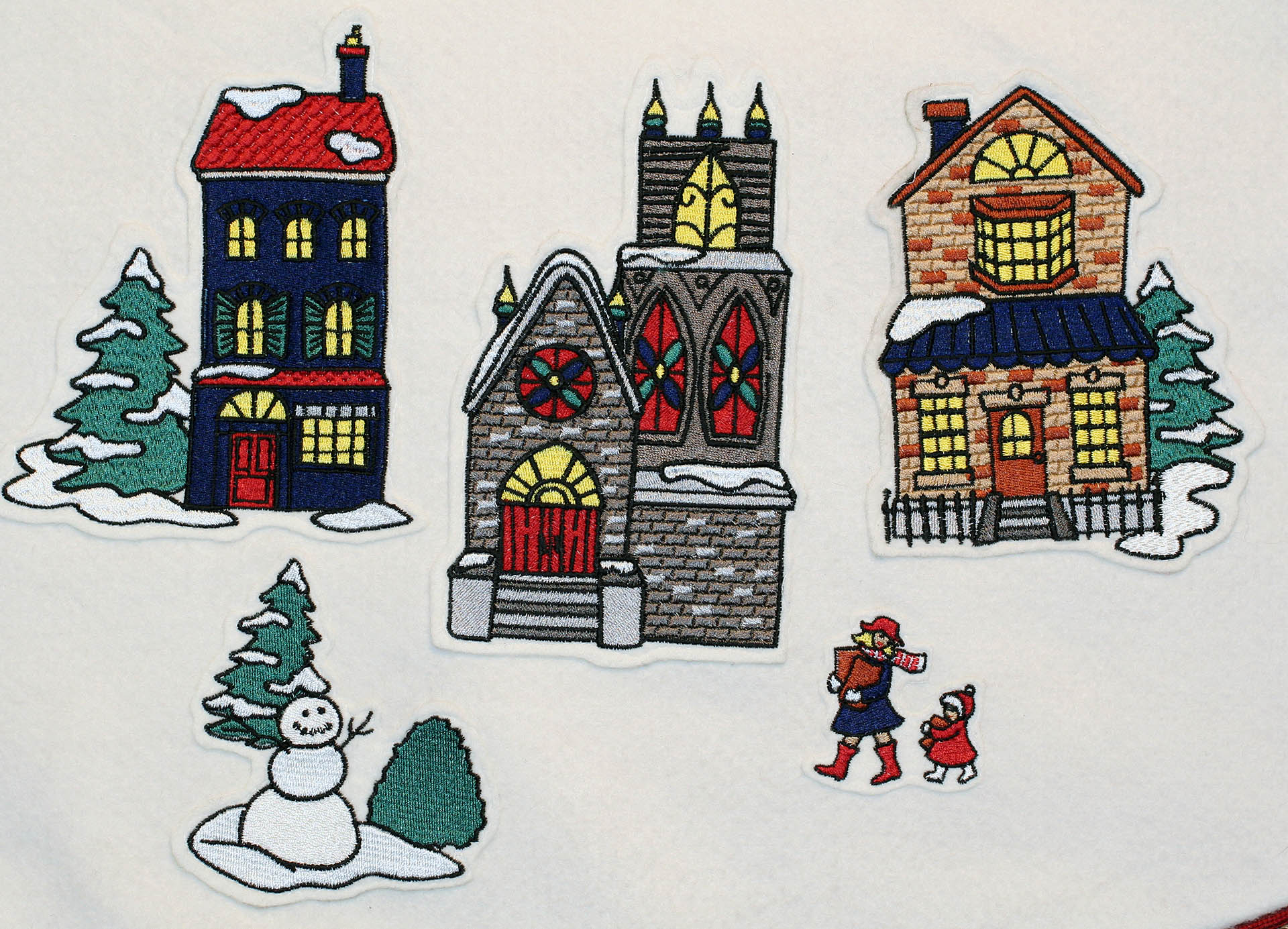 Create your own snow-filled village scene with these designs. This pack is great for quilts or use the different buildings in a curtain valance & pillowcases. The schoolhouse and church along with the other motifs are all very cute and waiting for a creative touch from you. Bundle up as you take a stroll down Main Street to see dog walkers, shoppers, mail personnel and other friendly faces as you pass by the school, church, barber shop, and the park!