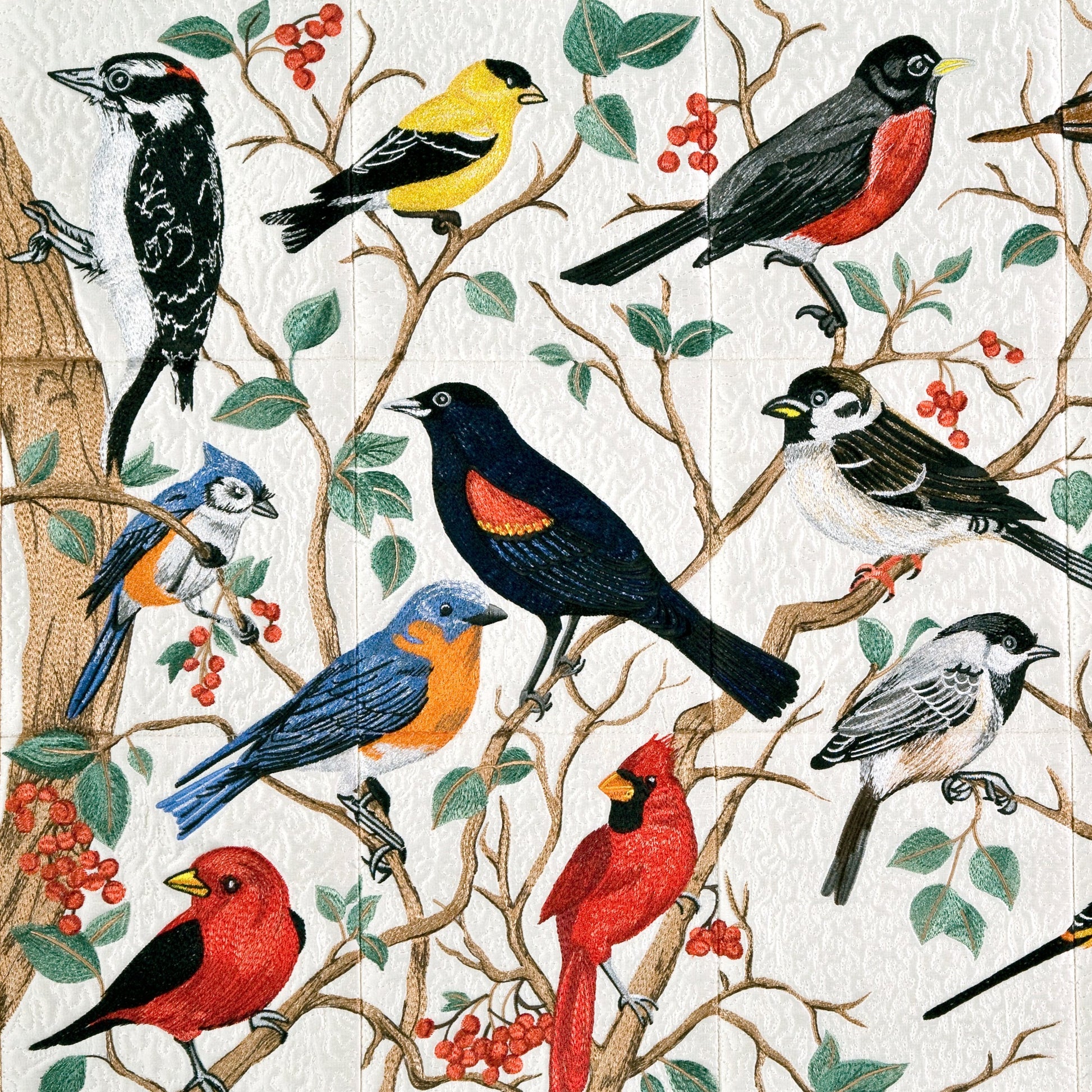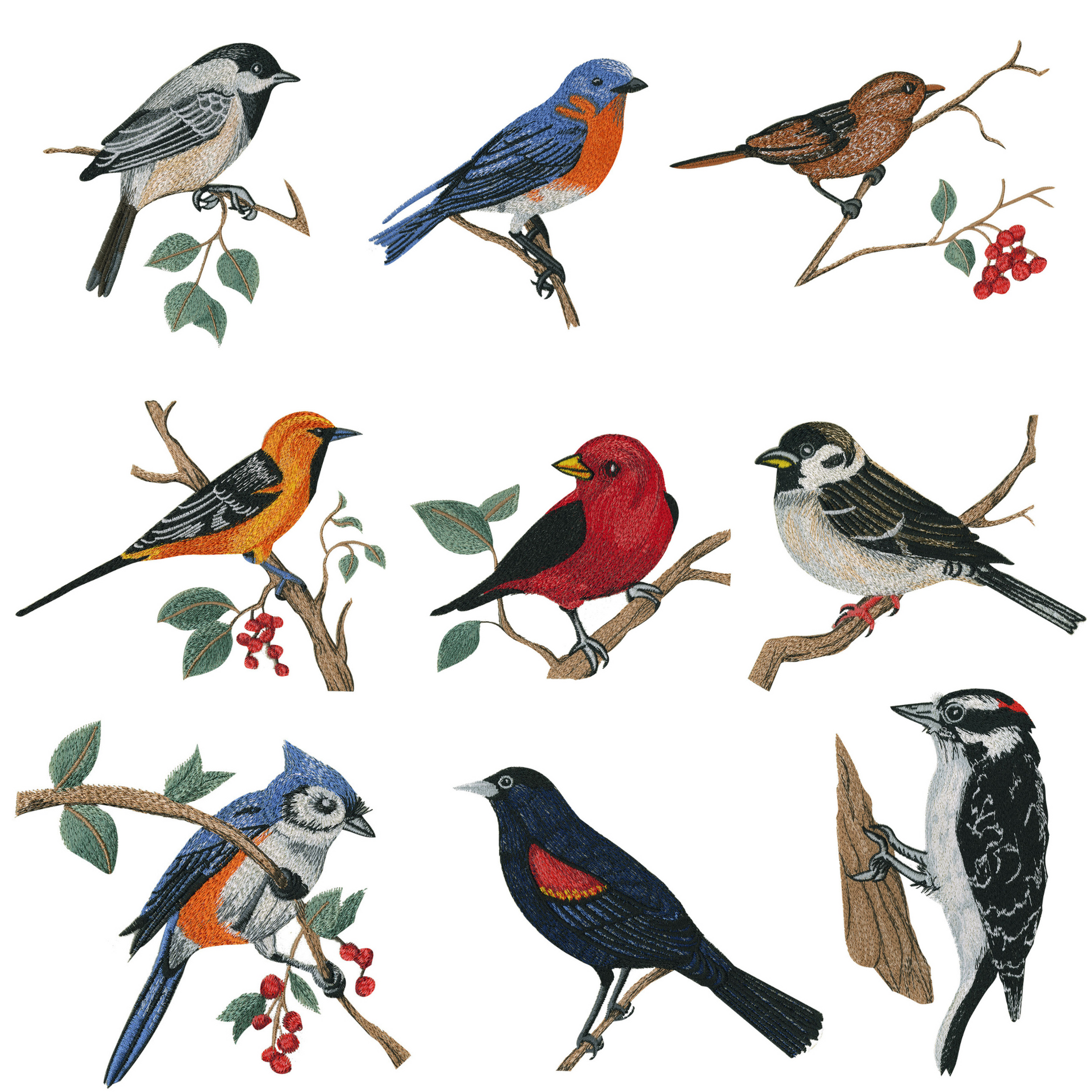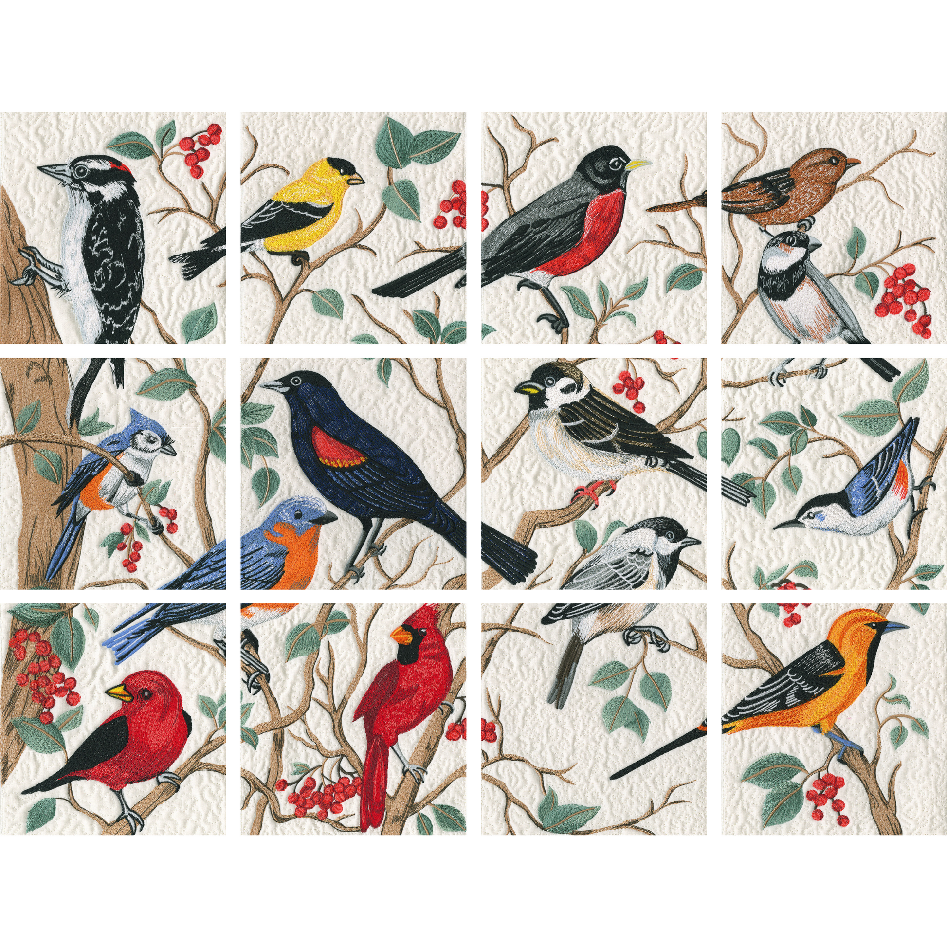 But that's not all—the second part of the collection presents a breathtaking 12-block tile scene that brings all the songbirds together in a harmonious arrangement. This arrangement showcases the birds in a beautifully balanced composition, allowing you to appreciate the diversity and splendor of these winged wonders. The seamless integration of the birds within the tile scene creates an enchanting visual narrative that can serve as a centerpiece for larger embroidery projects.