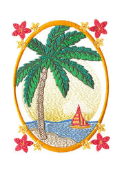 A little sailboat makes its way across the horizon in front of a setting sun in this stunning palm tree scene!