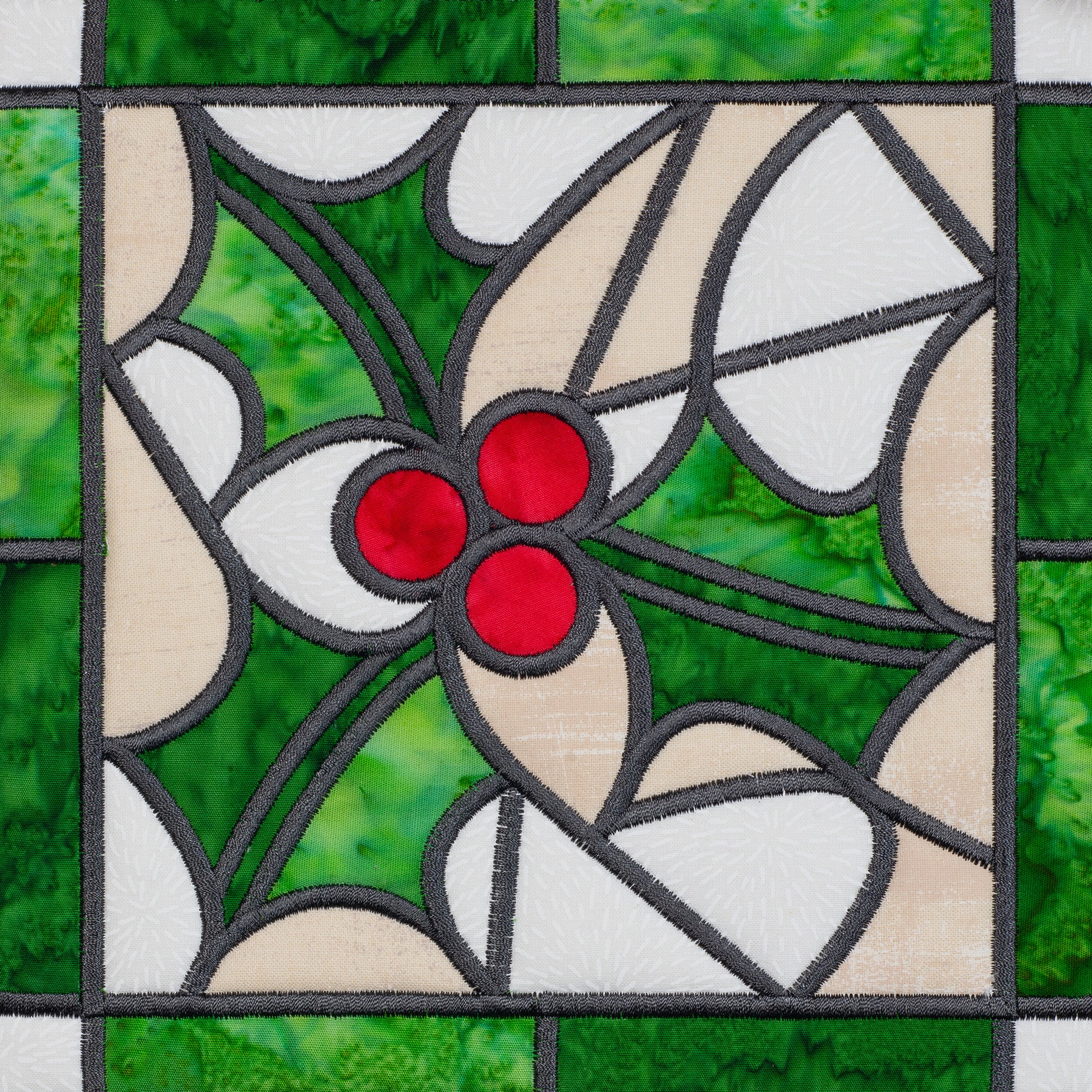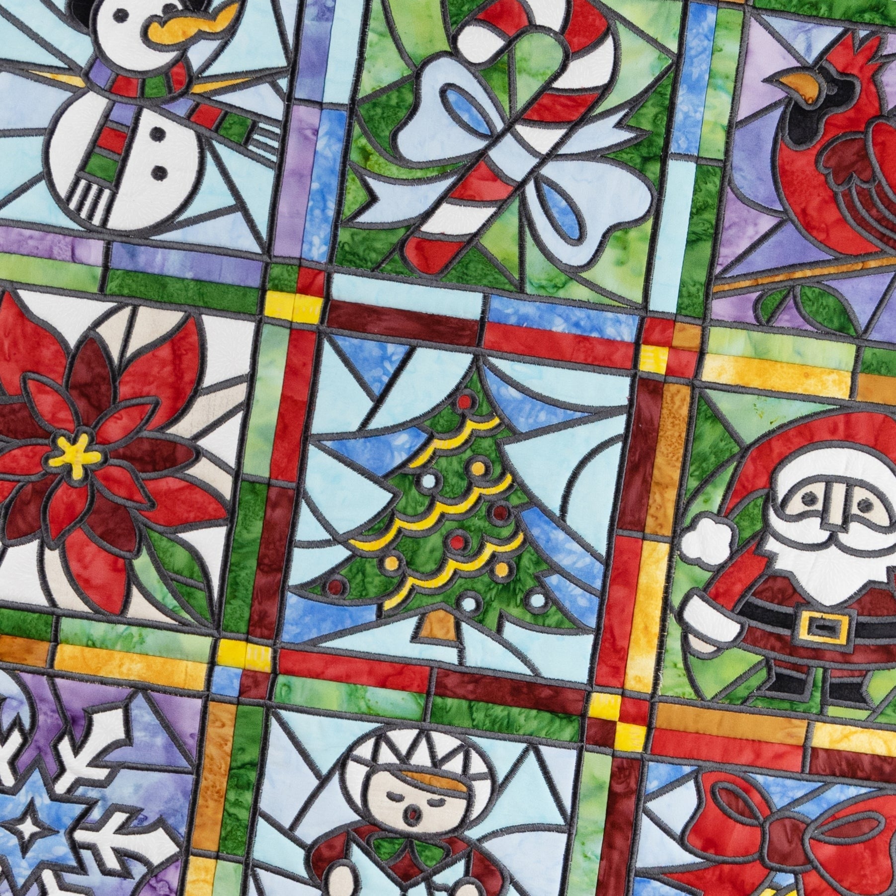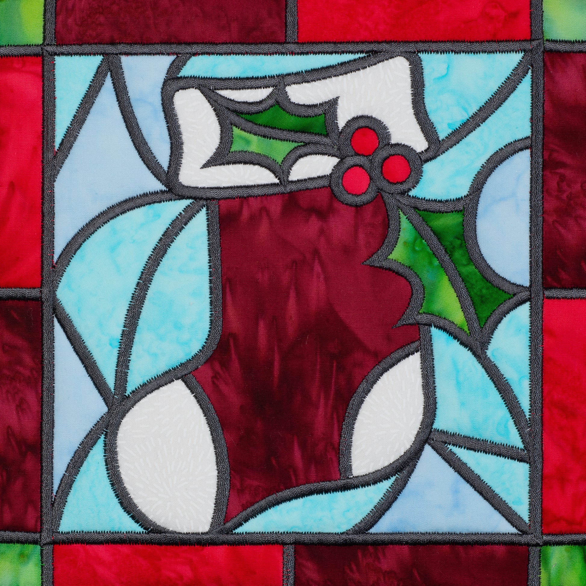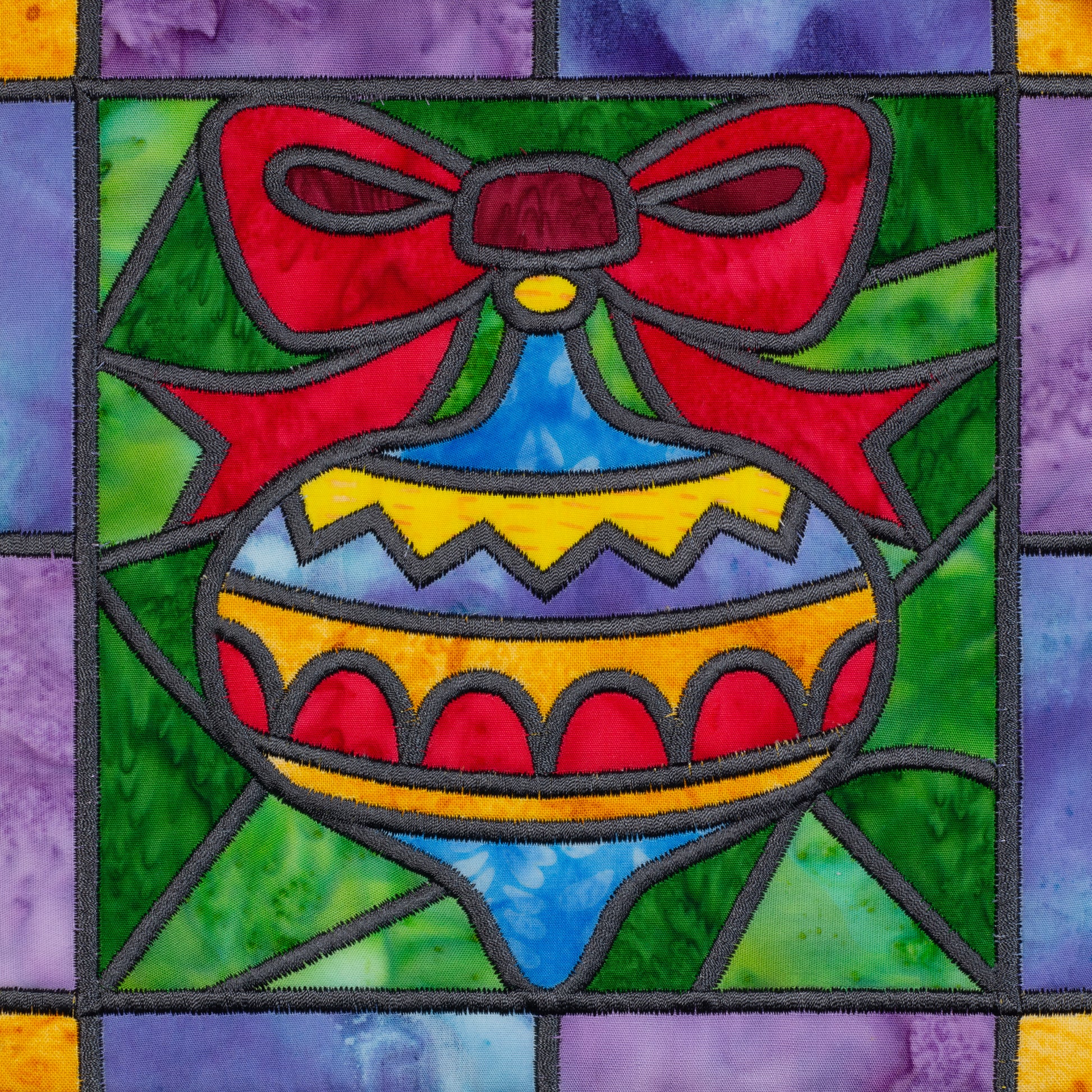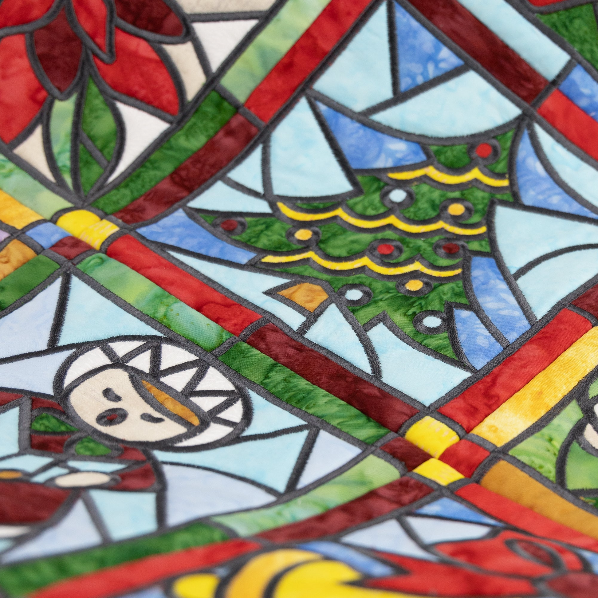 Our fabulous Stained Glass Christmas Quilt is sure to turn heads and get double takes with its dazzling display that looks like glass! With the right fabrics and threads, you can captivate and fascinate with a truly unique—and functional—work of art. Inspired by the intricate stained glasswork seen in church windows and doors, this collage of standard appliqués truly replicates the experience of peering through the gorgeous glass. For the best finished results and similar effect to what we created, try incorporating batiks and other hand dyed fabrics for the perfect "light-leak" look!