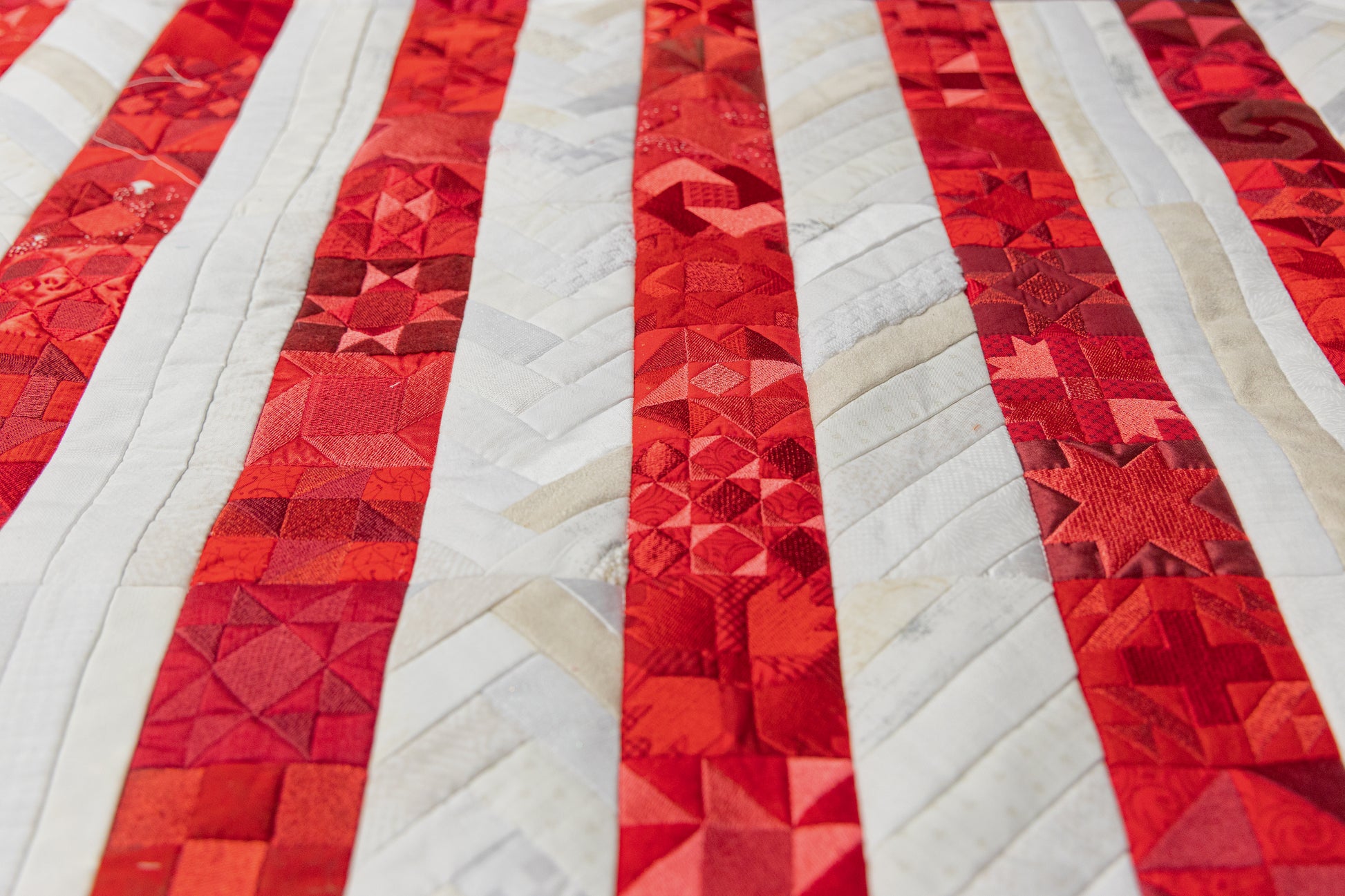 White bands of folded fabric between the red stripes, created using our 3-step folded fabric technique allow to explore textures and prints with a variety of white, cream, or off-white fabrics.