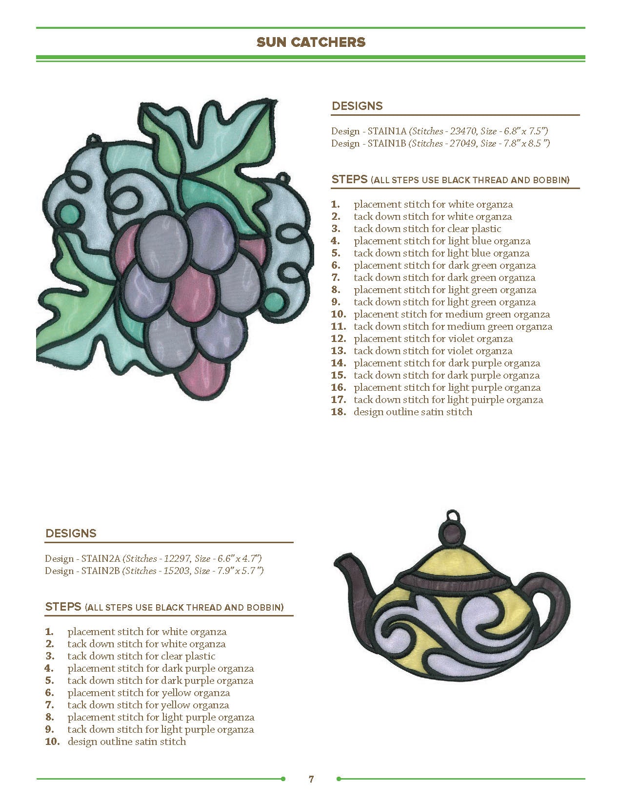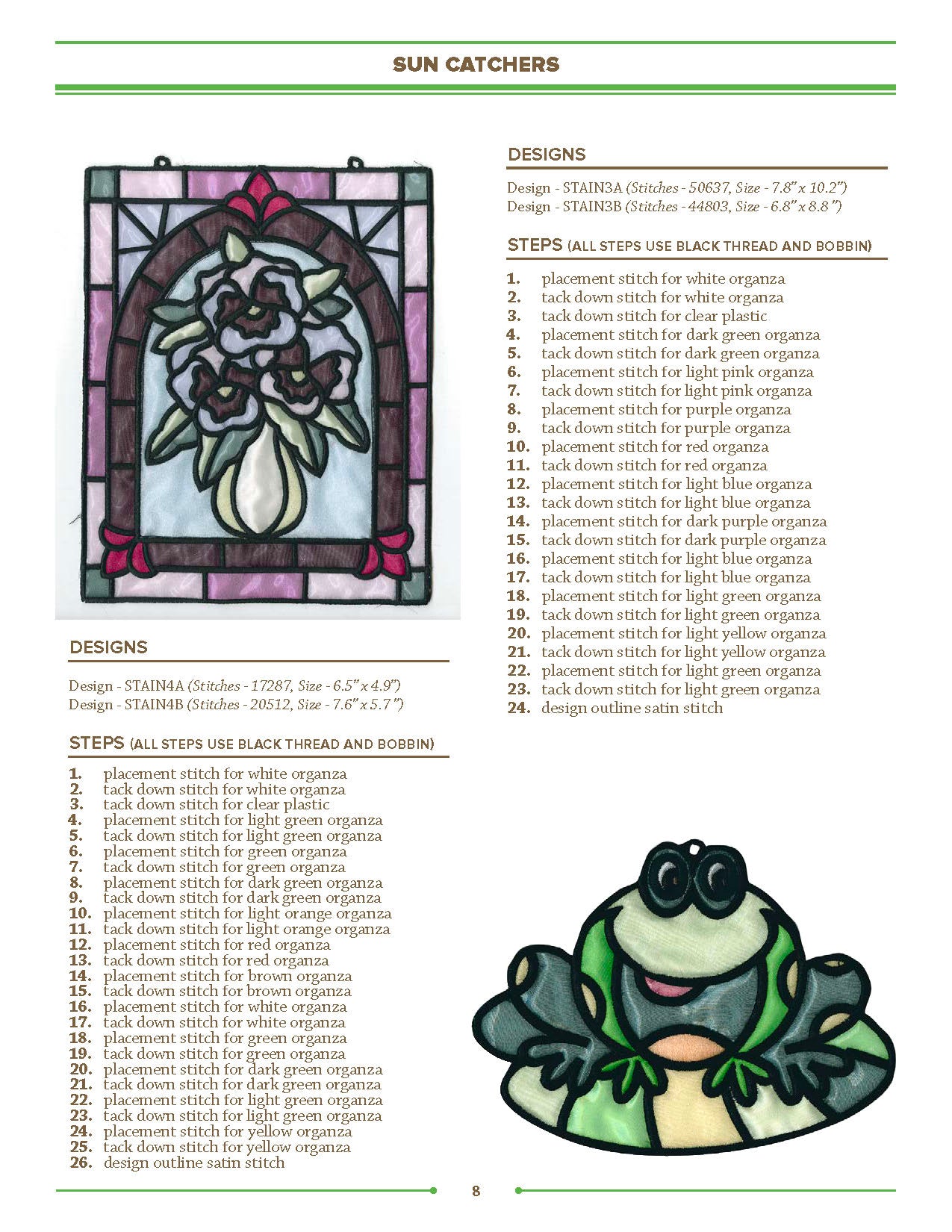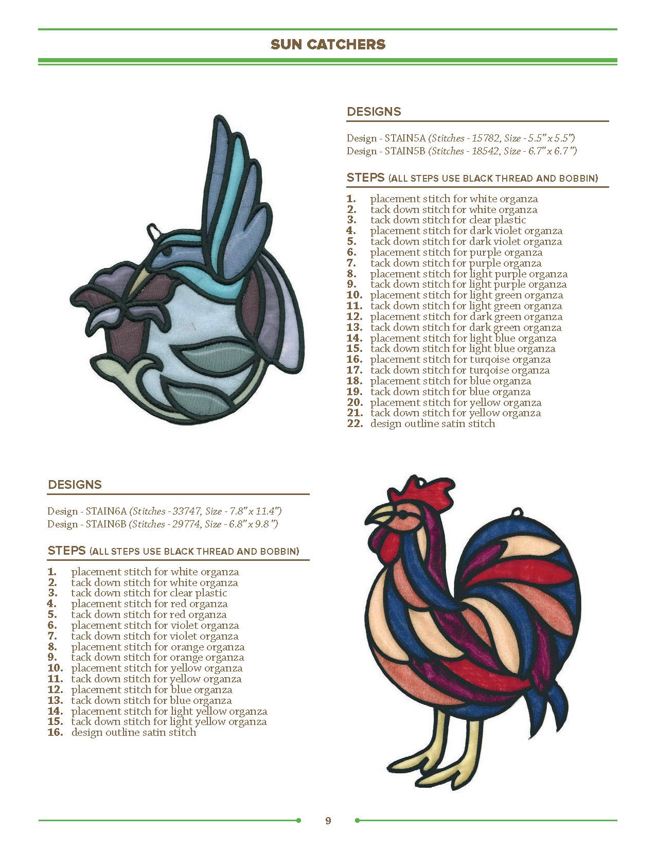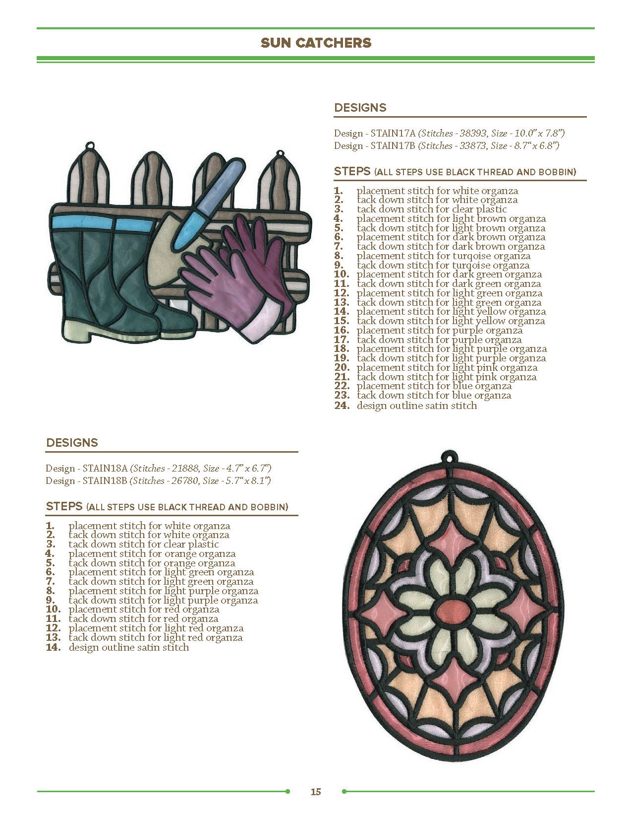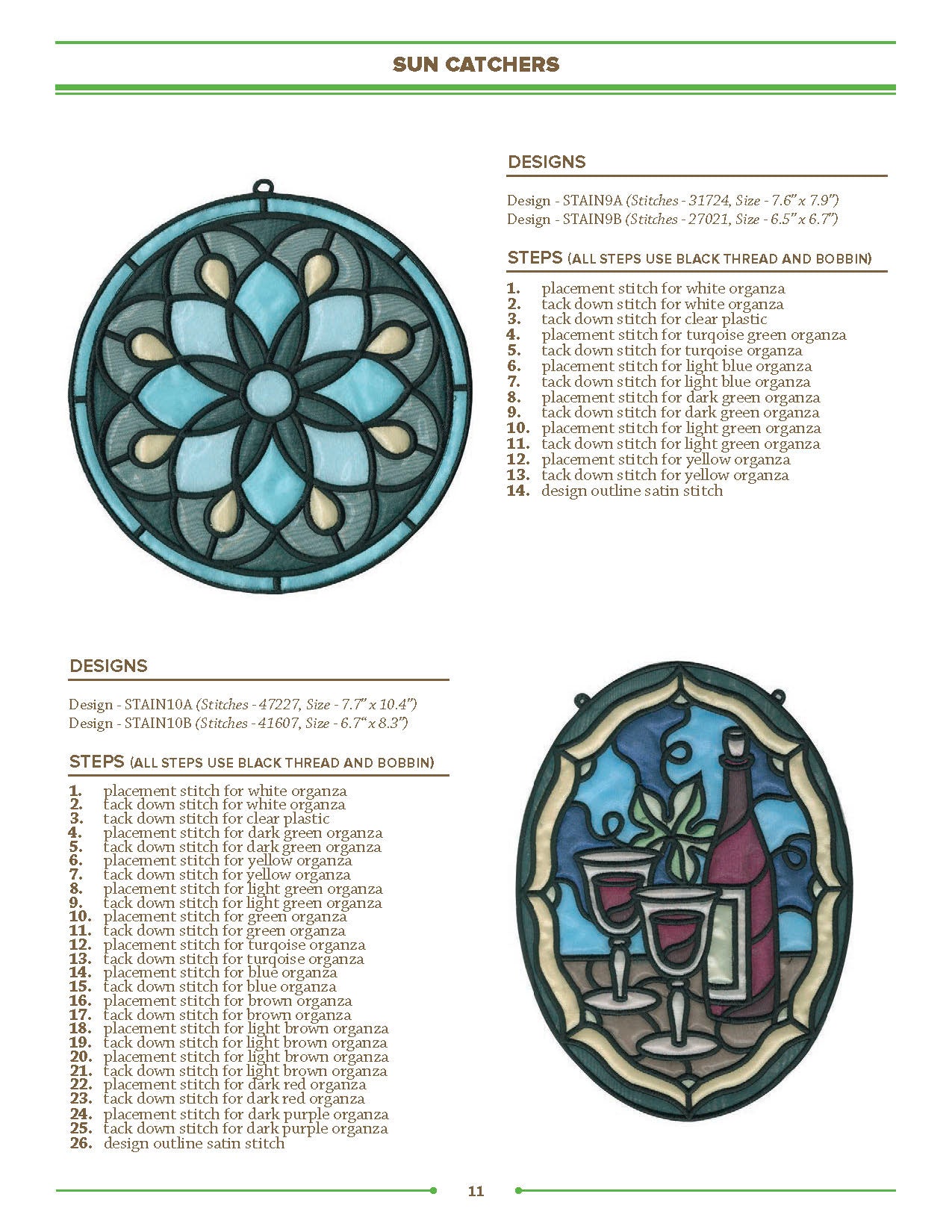 Every once in a while we revisit a technique from years past. In 2008 we designed a collection called stained glass ornaments for Christmas and we wound up teaching the stained glass embroidery technique at our Embroidery Parties all over the country. We never did another collection using that technique until now. Instead of creating small ornaments we designed large intricate designs that will look beautiful hanging in your windows. They are very easy to create, you simply sandwich clear vinyl in between two layers of organza! The designs catch light just the way stained glass does, people wont believe that they are created with thread. Once the designs are finished stitching you simply need to add a suction cup with a hook to the designs and hang them in your window. You will love these designs!