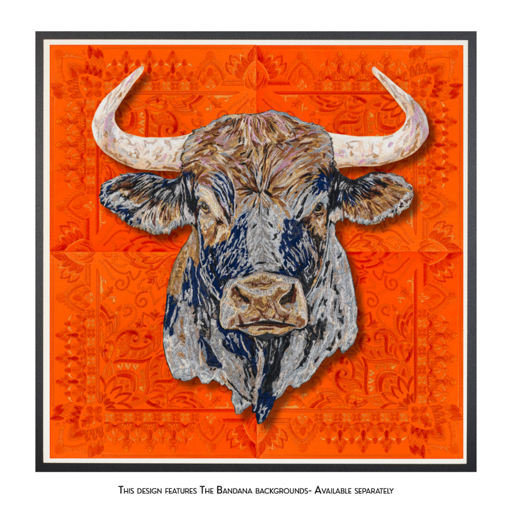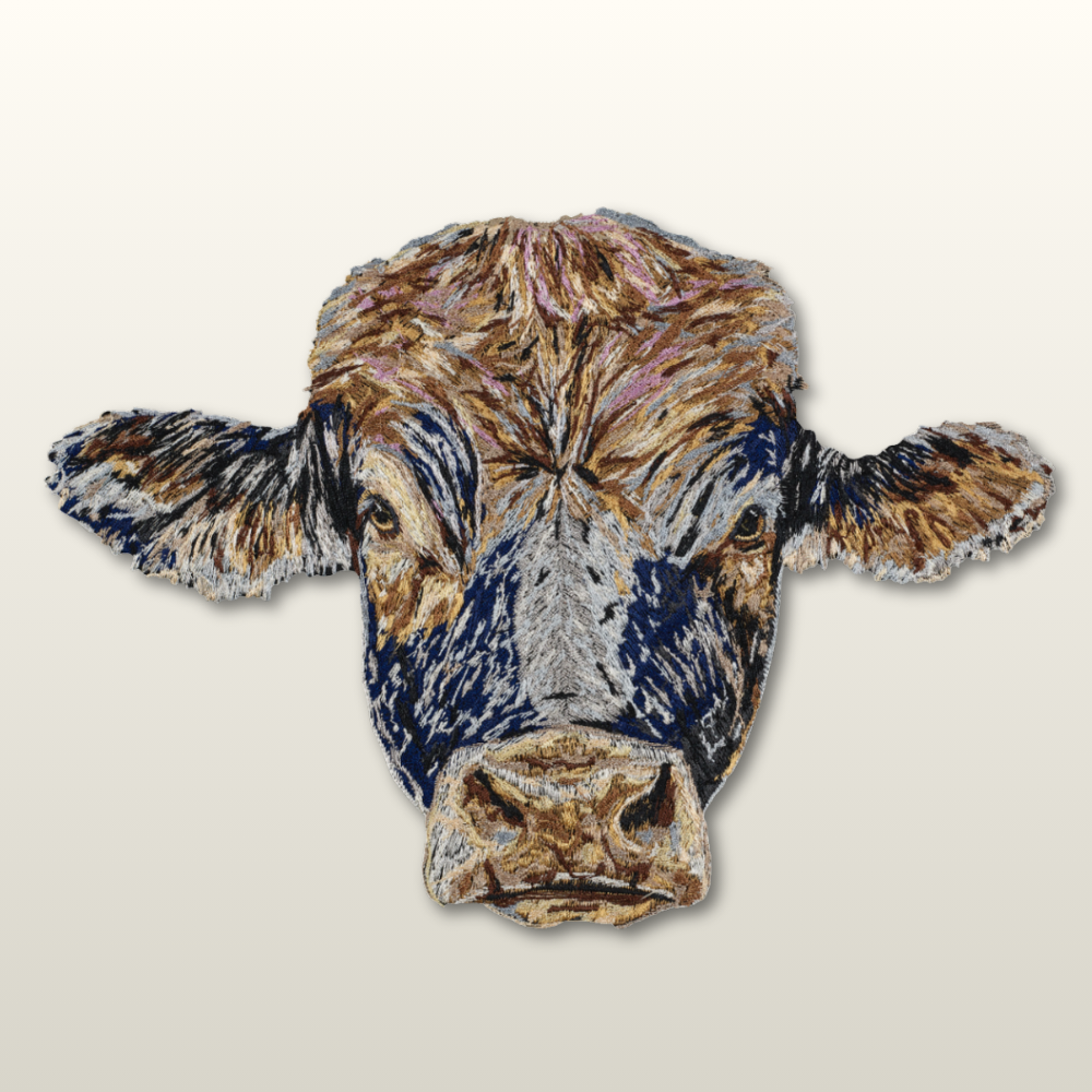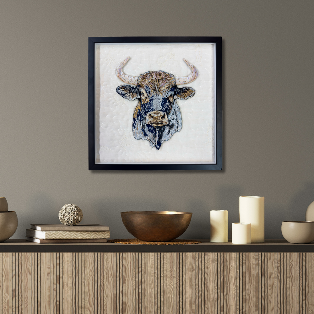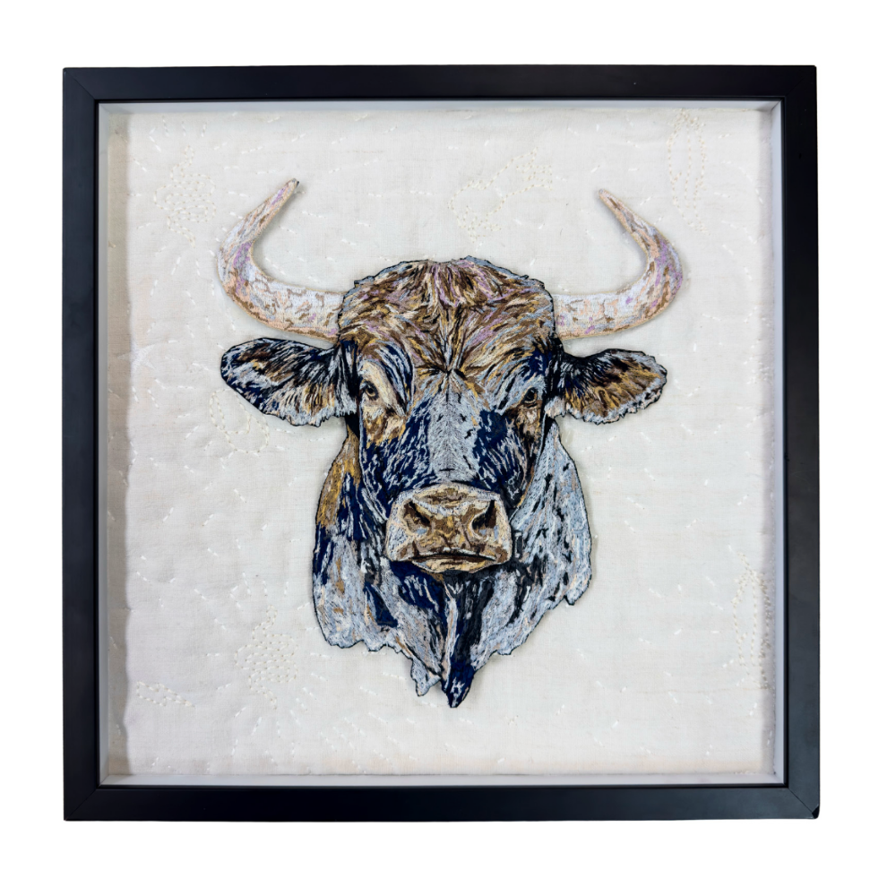 The Bull marks the beginning of this creative series, inspired by the desire to capture a balance between realism and painterly expression. The original piece, a 40”x 40” artwork featuring over a million stitches, debuted at the first Artful Embroidery event in the studio. It immediately caught the eye of an attendee who requested a version for Anita—leading to the re-imagined design you see here.