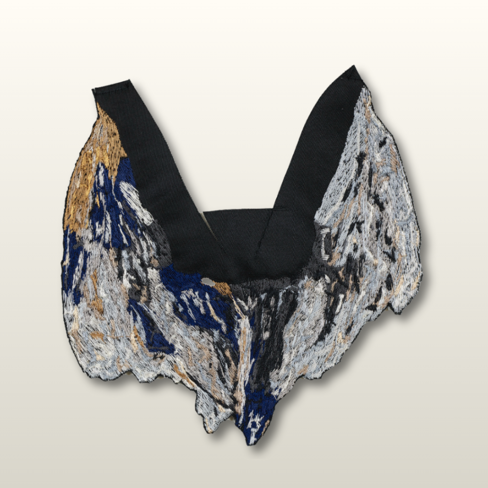The bull commands attention—a monumental creation brought to life with over 100,000 stitches in lustrous threads. Layers of blue, steel, lavender, and caramel build dimension and depth, capturing both strength and elegance in its form. After days of painstaking embroidery, each detail is carefully hand-trimmed and mounted on clear acrylic, allowing the bull to rise in subtle relief against any background. For those eager to explore further, The Artful Embroidery book guides you through designing your own backdrops—whether on paper, fabric, vintage textiles, or mixed-media collage—so every piece becomes uniquely your own.