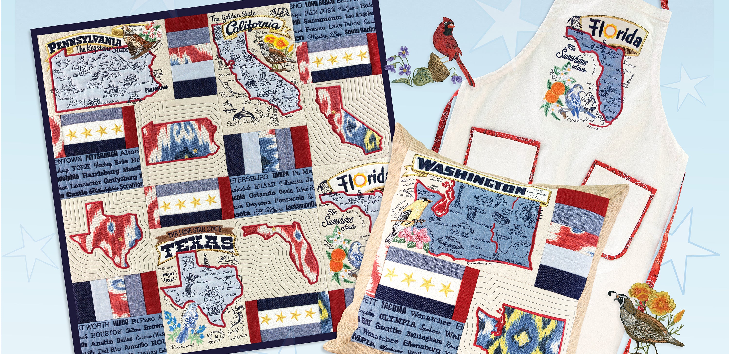 These extraordinary designs seamlessly blend stunning appliqués and intricate quilt patterns with iconic cityscapes, landmarks, and the representative bird and flower of each state, creating a true celebration of America's diverse landscapes.