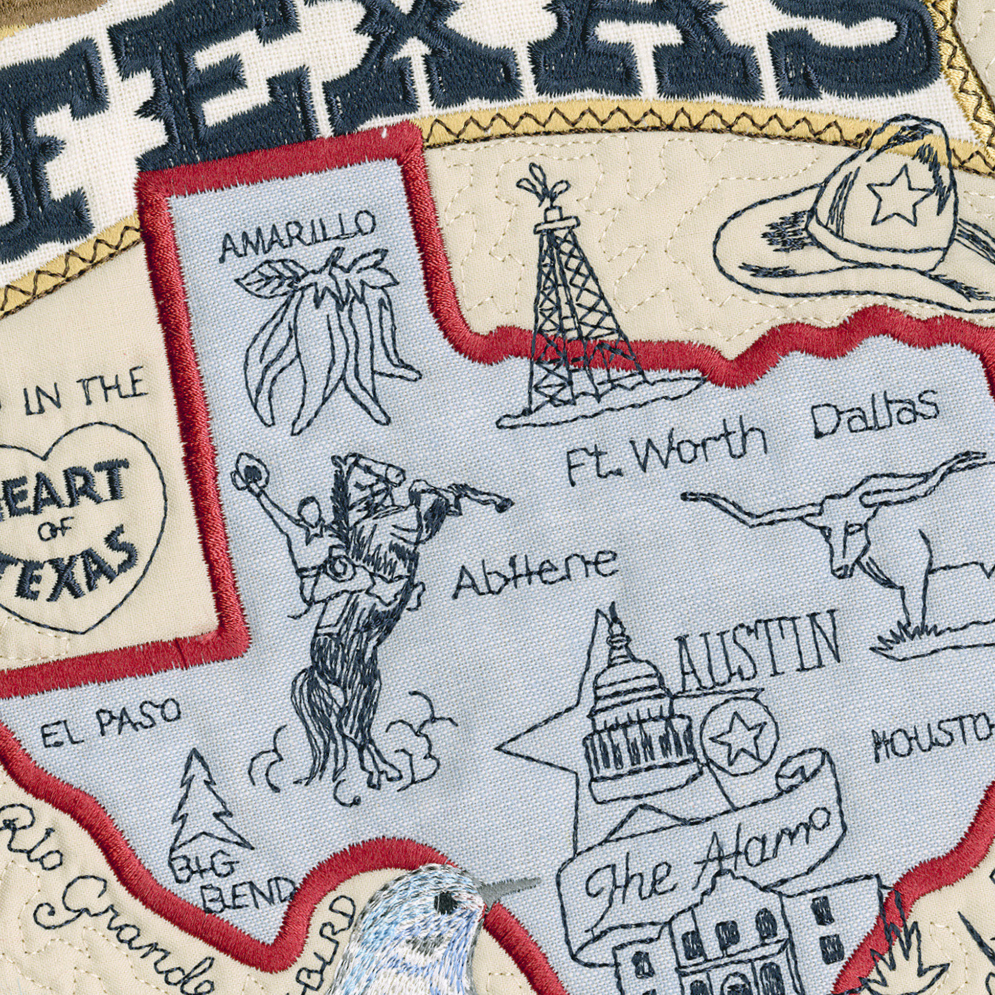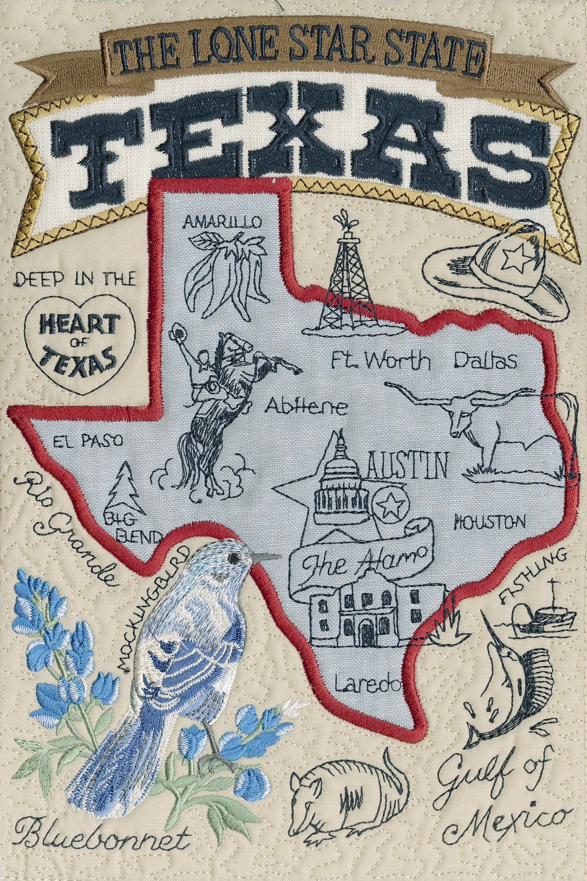 These designs were all hand drawn and contain beautiful appliqués and quilt designs combined with state cities and landmarks along with the state bird and flower. There are 10 designs in each collection that are divided between quilting and embroidery. The states can be combined together for big projects or can be used individually.