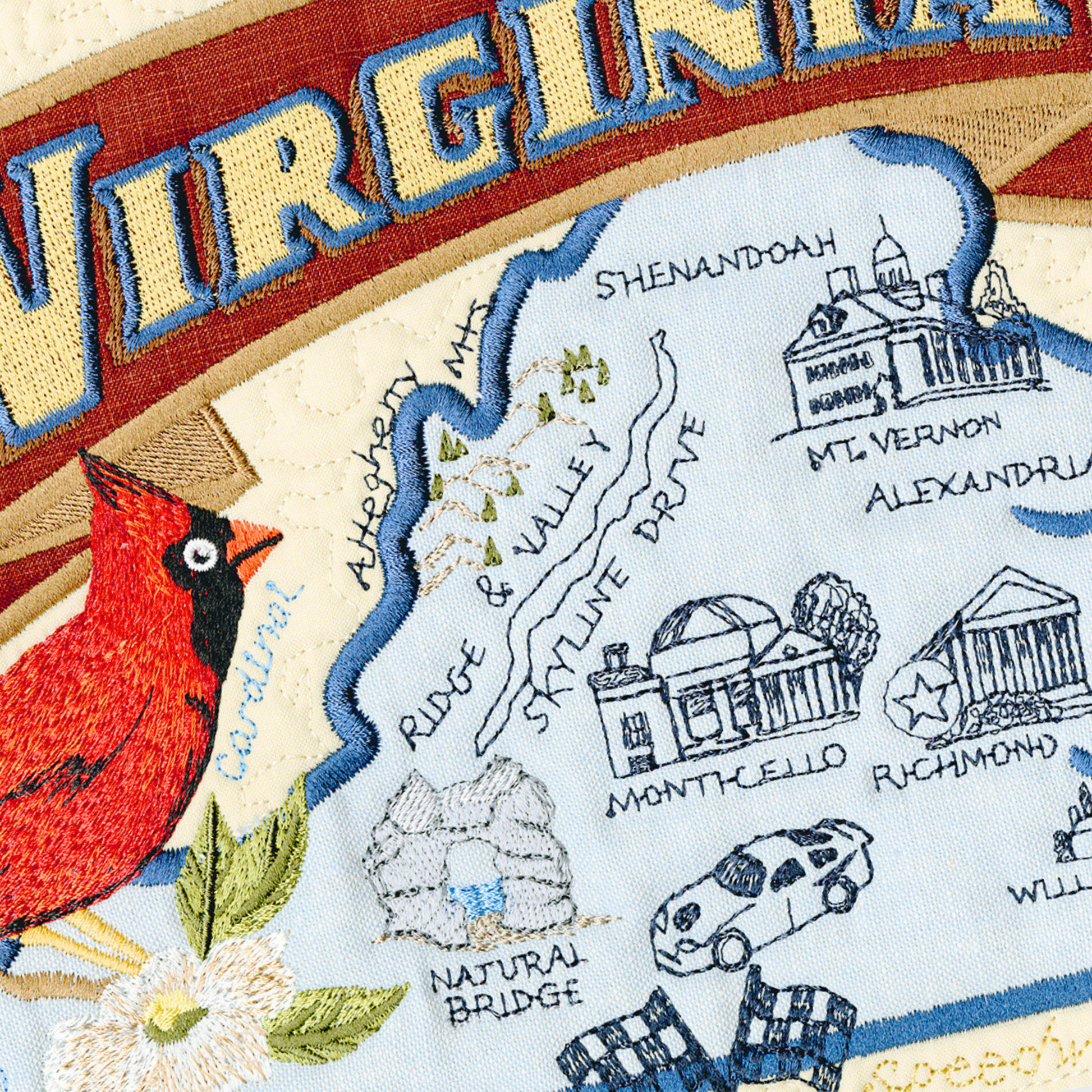 These designs were all hand drawn and contain beautiful appliqués and quilt designs combined with state cities and landmarks along with the state bird and flower. There are 10 designs in each collection that are divided between quilting and embroidery. The states can be combined together for big projects or can be used individually.
