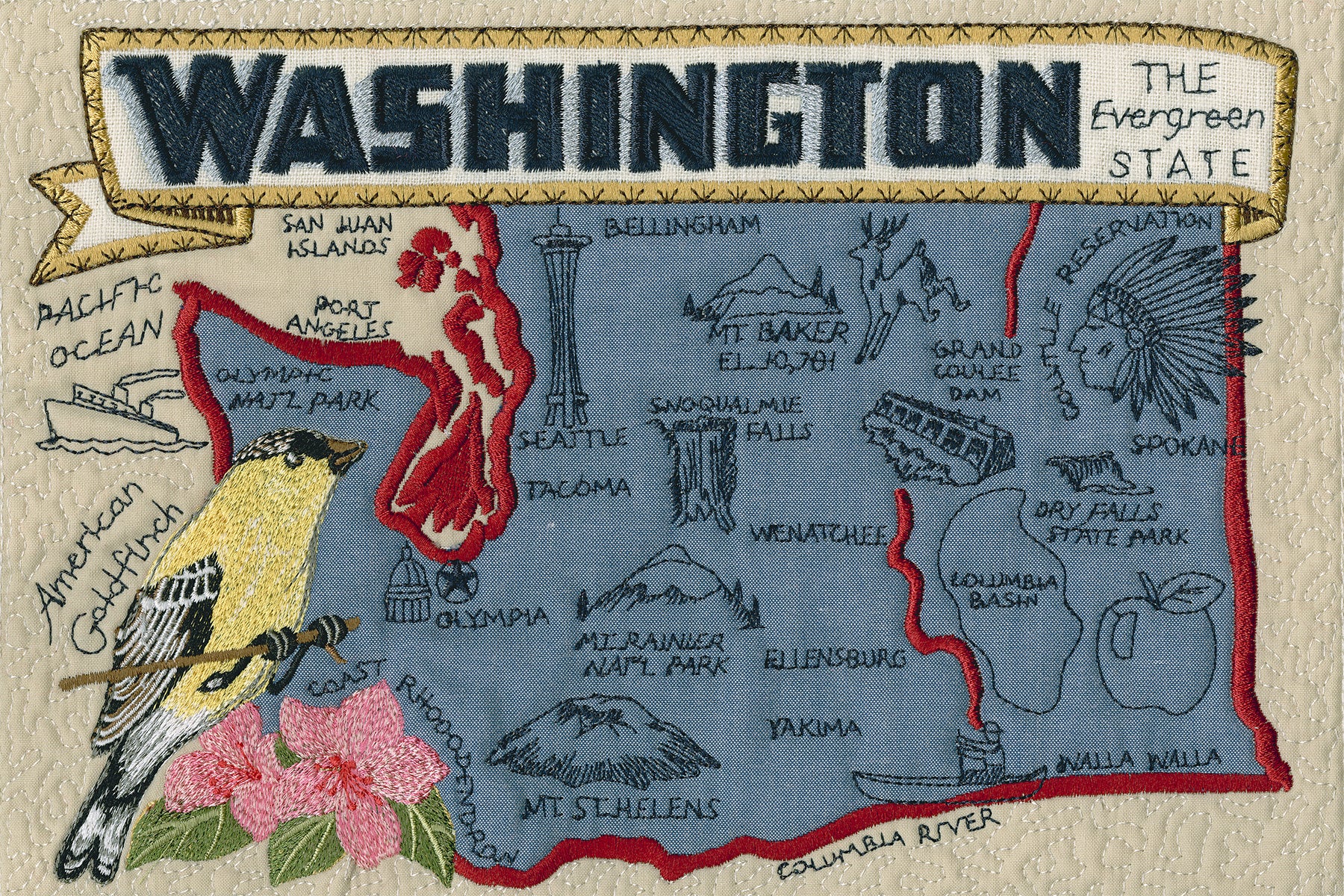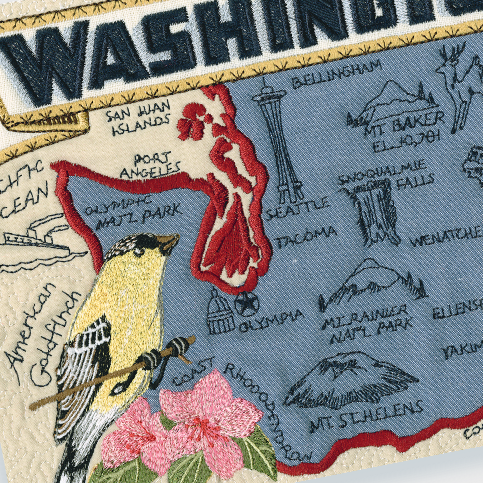 These designs were all hand drawn and contain beautiful appliqués and quilt designs combined with state cities and landmarks along with the state bird and flower. There are 10 designs in each collection that are divided between quilting and embroidery. The states can be combined together for big projects or can be used individually.