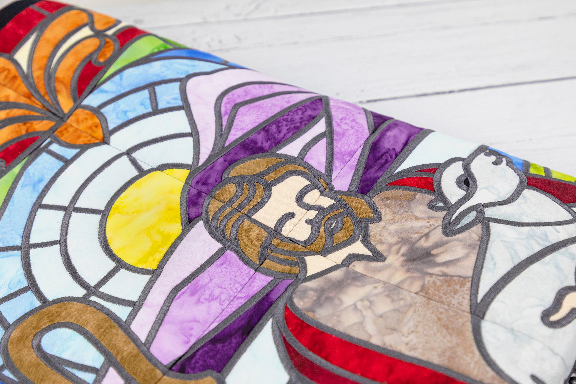 Entirely digitized in appliqués, the Good Shepherd Tile Scene utilizes beautiful fabrics to mimic the look of the stunning stained glass windows commonly seen in majestic cathedrals.