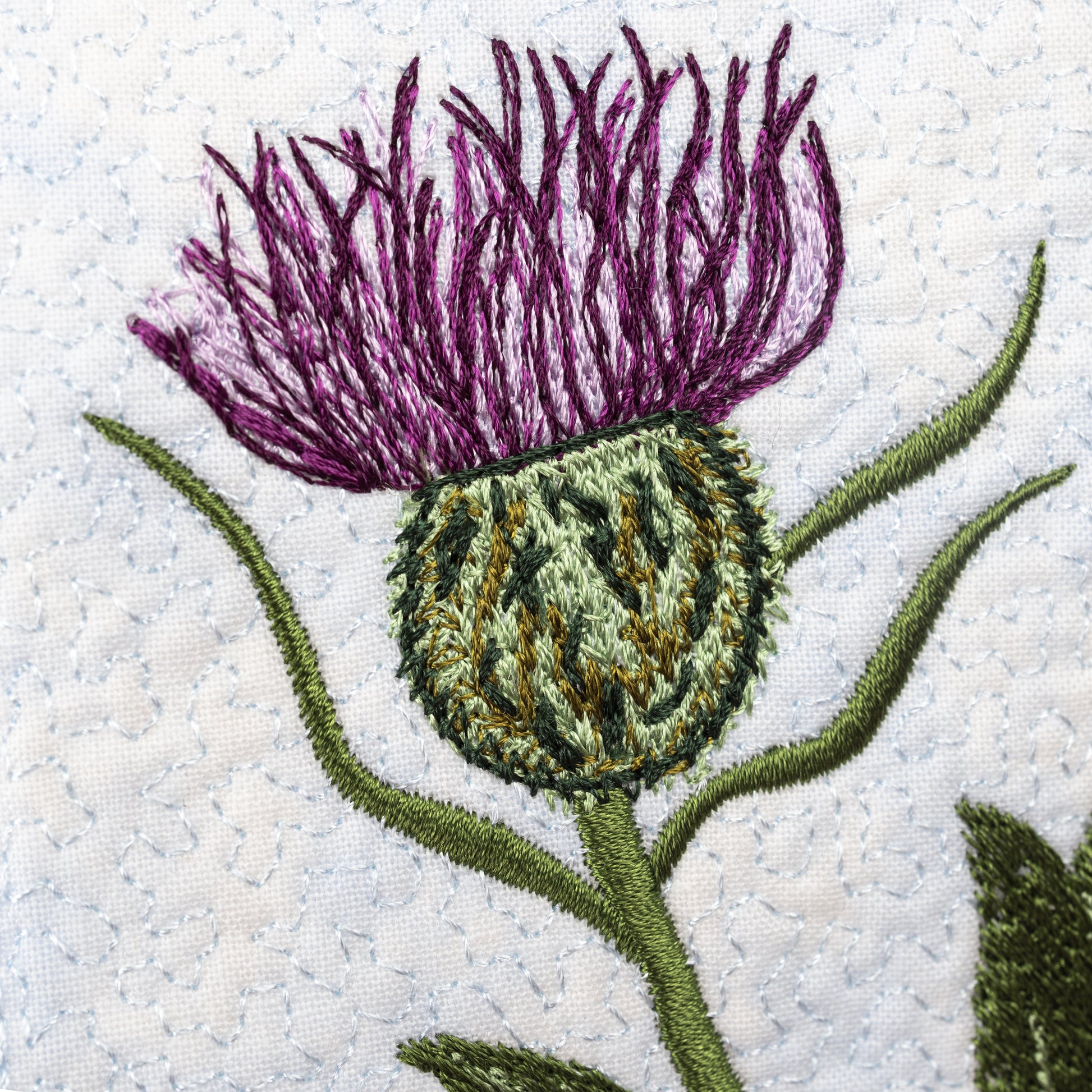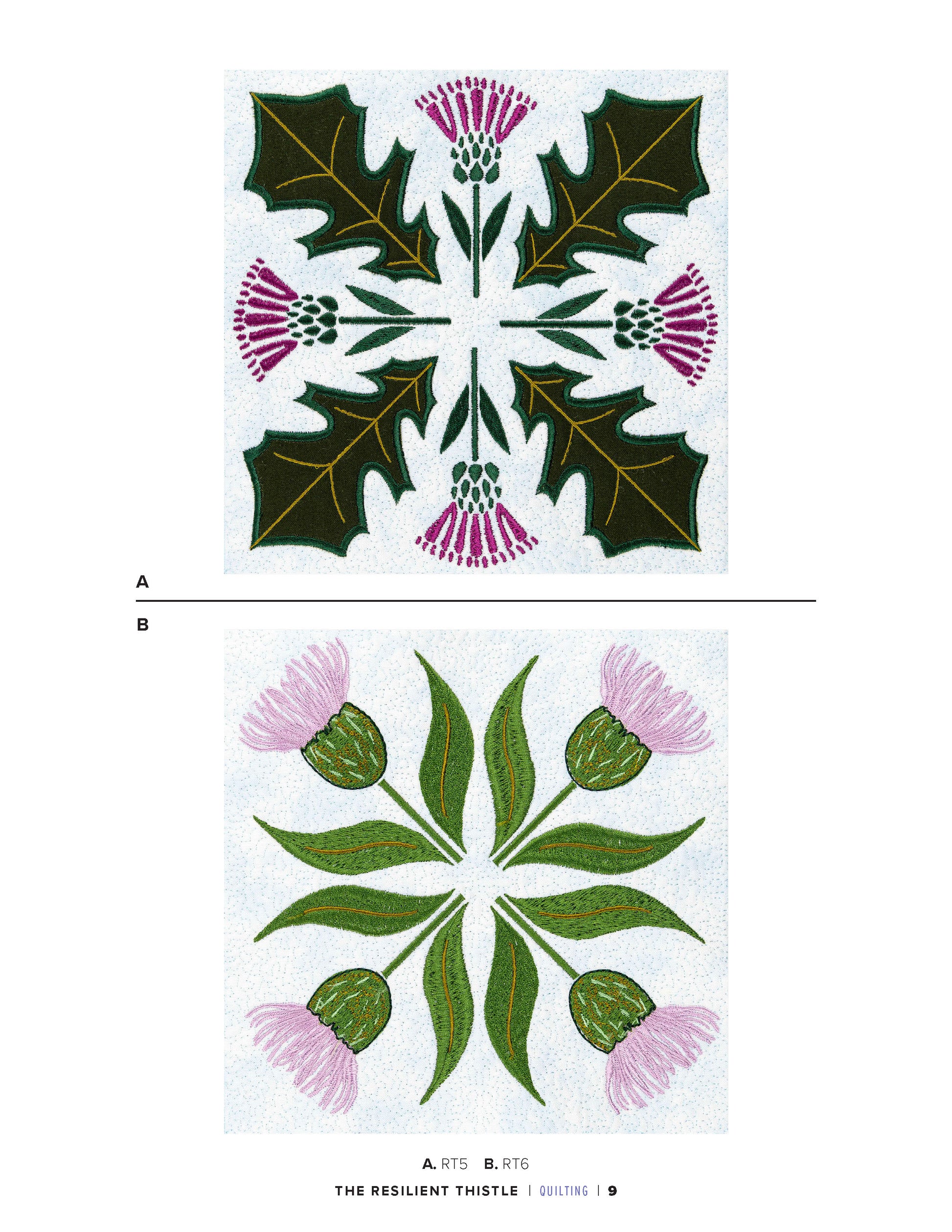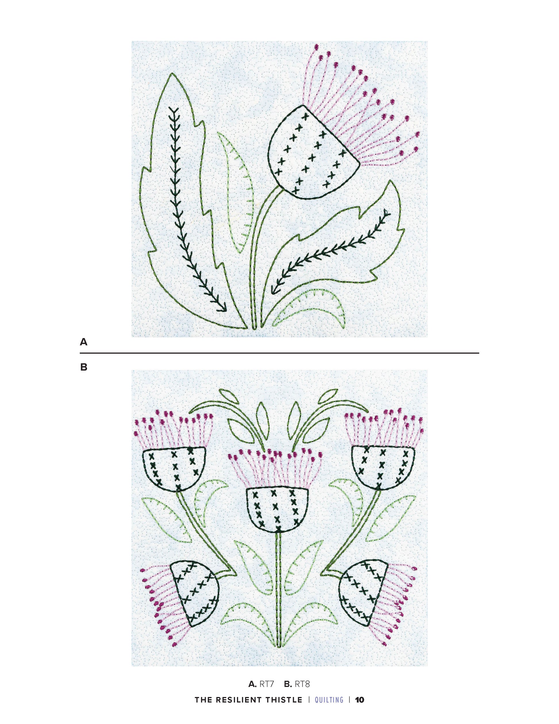 In the Resilient Thistle collection, you will find 11 exquisite designs that capture the essence of this remarkable flower. Each design is thoughtfully crafted, showcasing a variety of quilting techniques. From free motion stitching that adds a touch of whimsy to hidden appliqué that reveals the flower's beauty, and traditional embroidery that highlights its intricate details, these designs offer endless possibilities for your quilting projects.